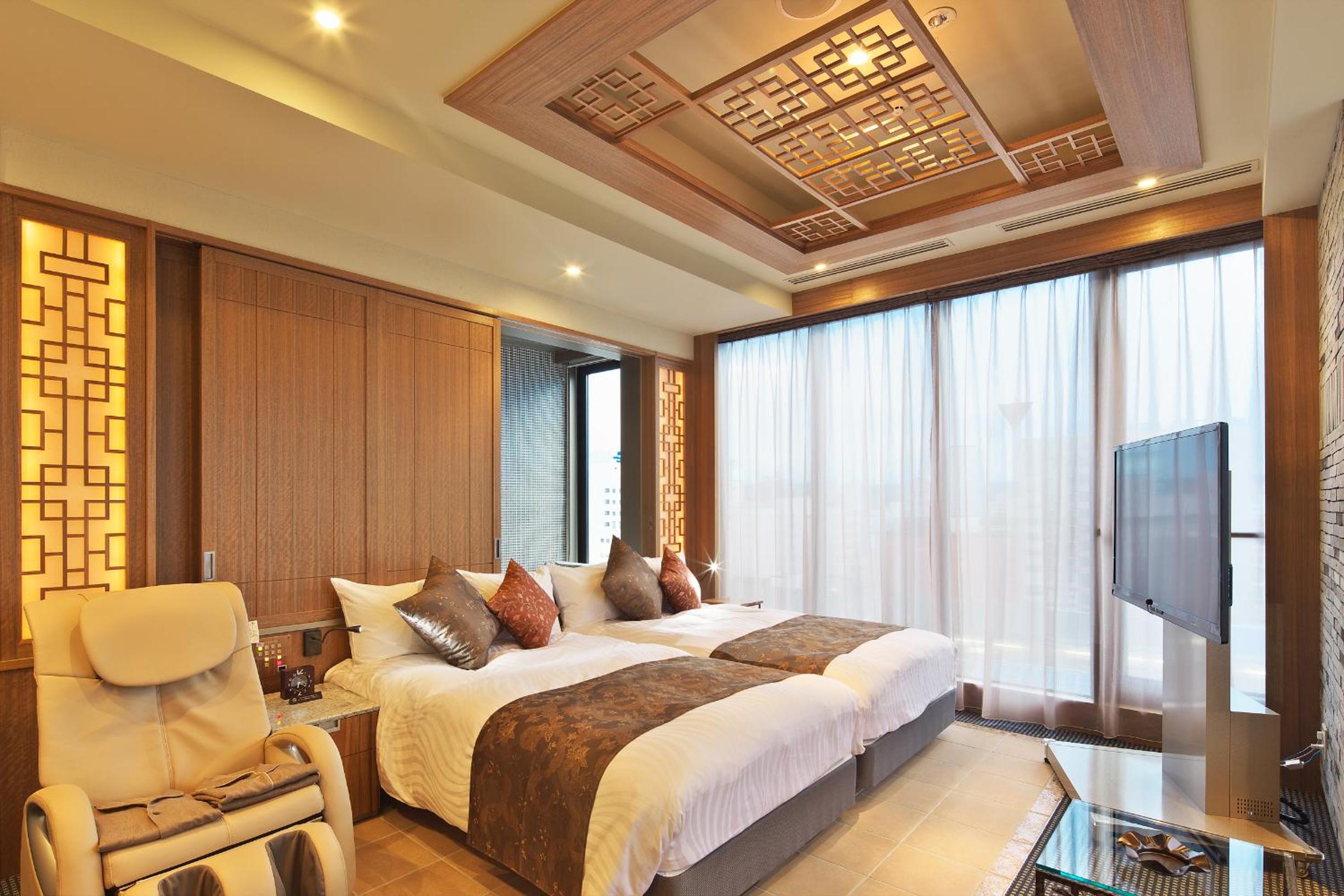 The air-conditioned rooms are equipped with convenient features such as flat-screen TVs, microwave, safety deposit box, and in-room massage chairs. Guests can also indulge in complimentary Wi-Fi access throughout the property.
