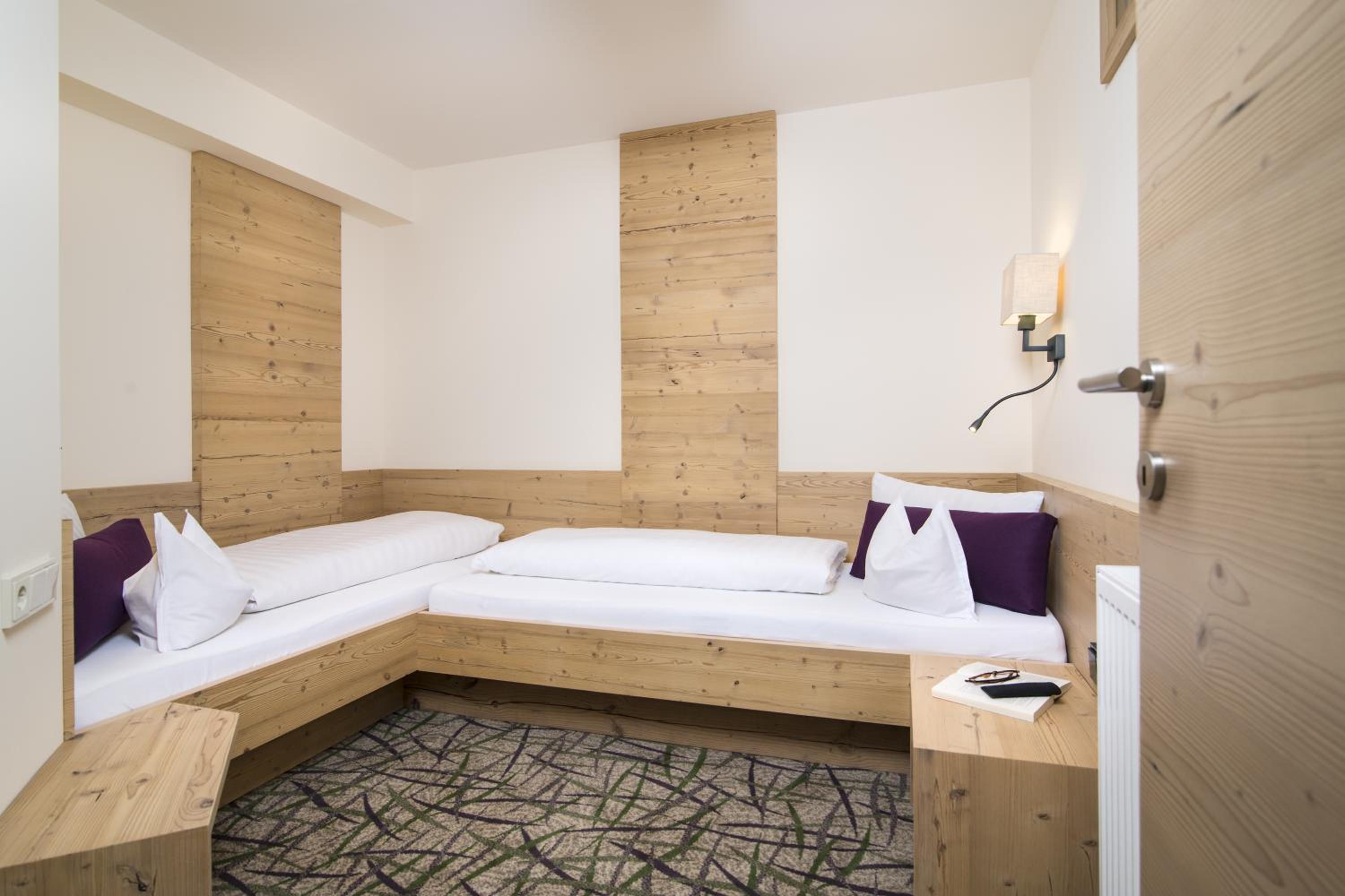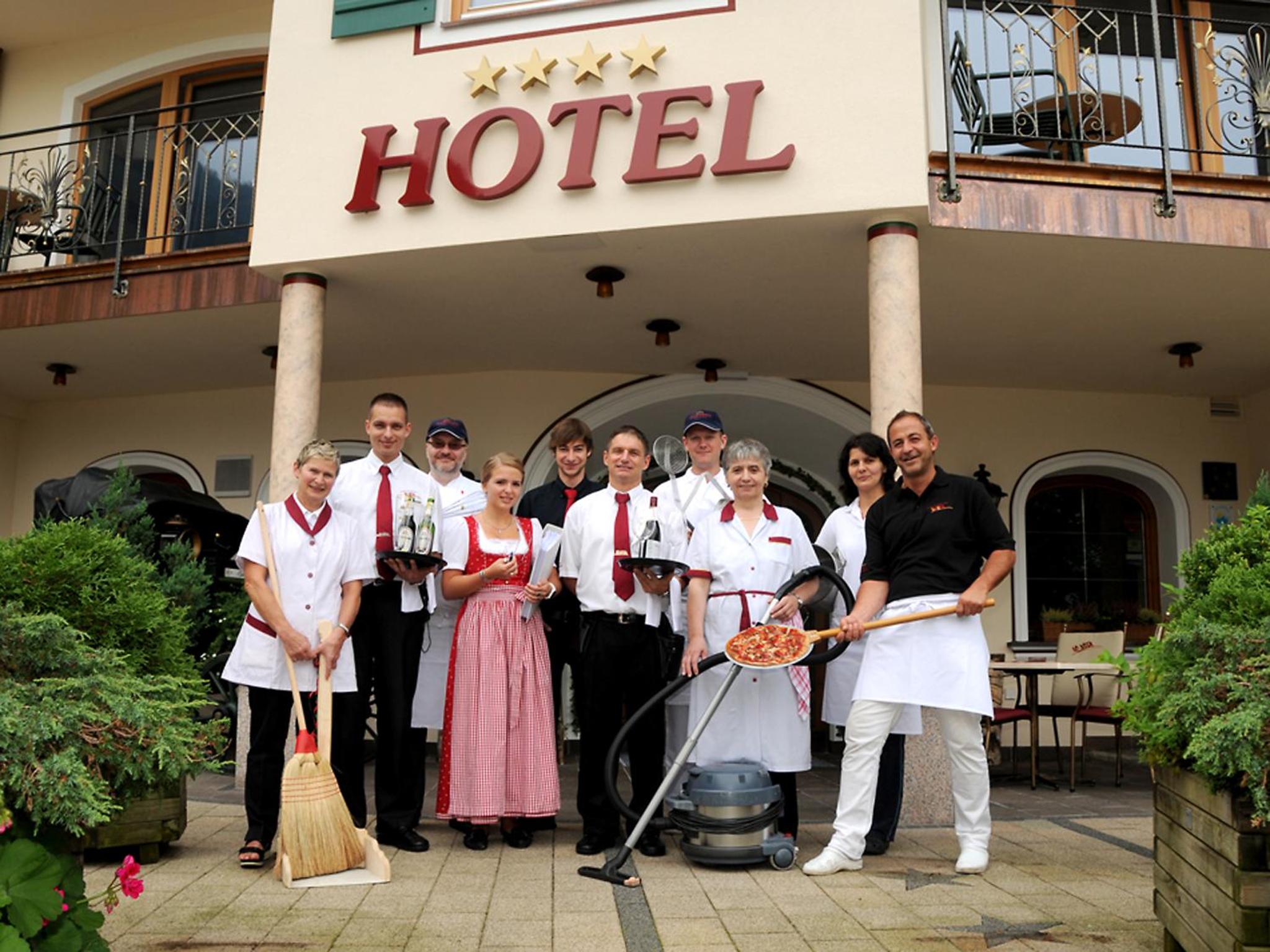 Lovely, clean and friendly family run hotel. Had a family room with separate bunk bed room. Very spacious and lovely view of the valley. Excellent location. Bus stop to the nearest lift stations being directly outside the hotel. Bus A. Buses are reliable. Would definitely return to this hotel and recommend to my family and friends. Would return though on a bed and breakfast basis as there are a lot of restaurants within walking distance to sample and the evening meals are served too early in my opinion, with the latest time for sitting being 7:30pm. Meals in the a la carte restaurant are served up until 8:30pm so feel this should be consistent across both restaurants.
