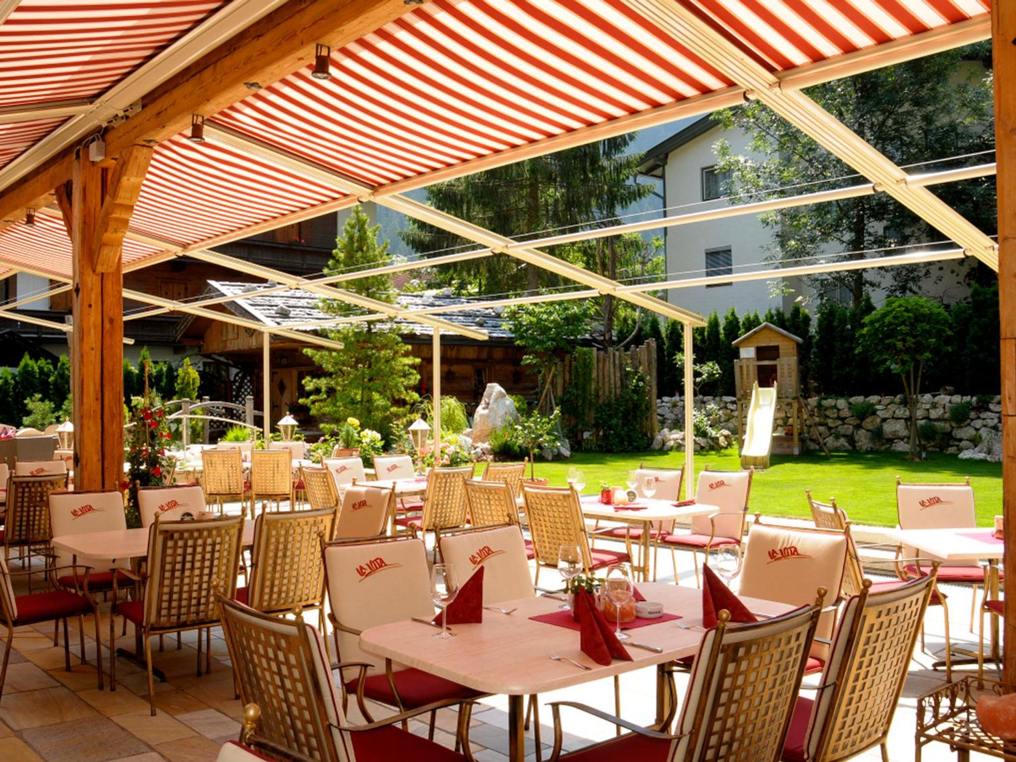 Savor hearty Tyrolean cuisine, wood-fired pizzas, and grilled specialties at La Vita restaurant. Start your day with a delightful breakfast buffet featuring regional delicacies. Unwind with a drink on the sunny terrace.