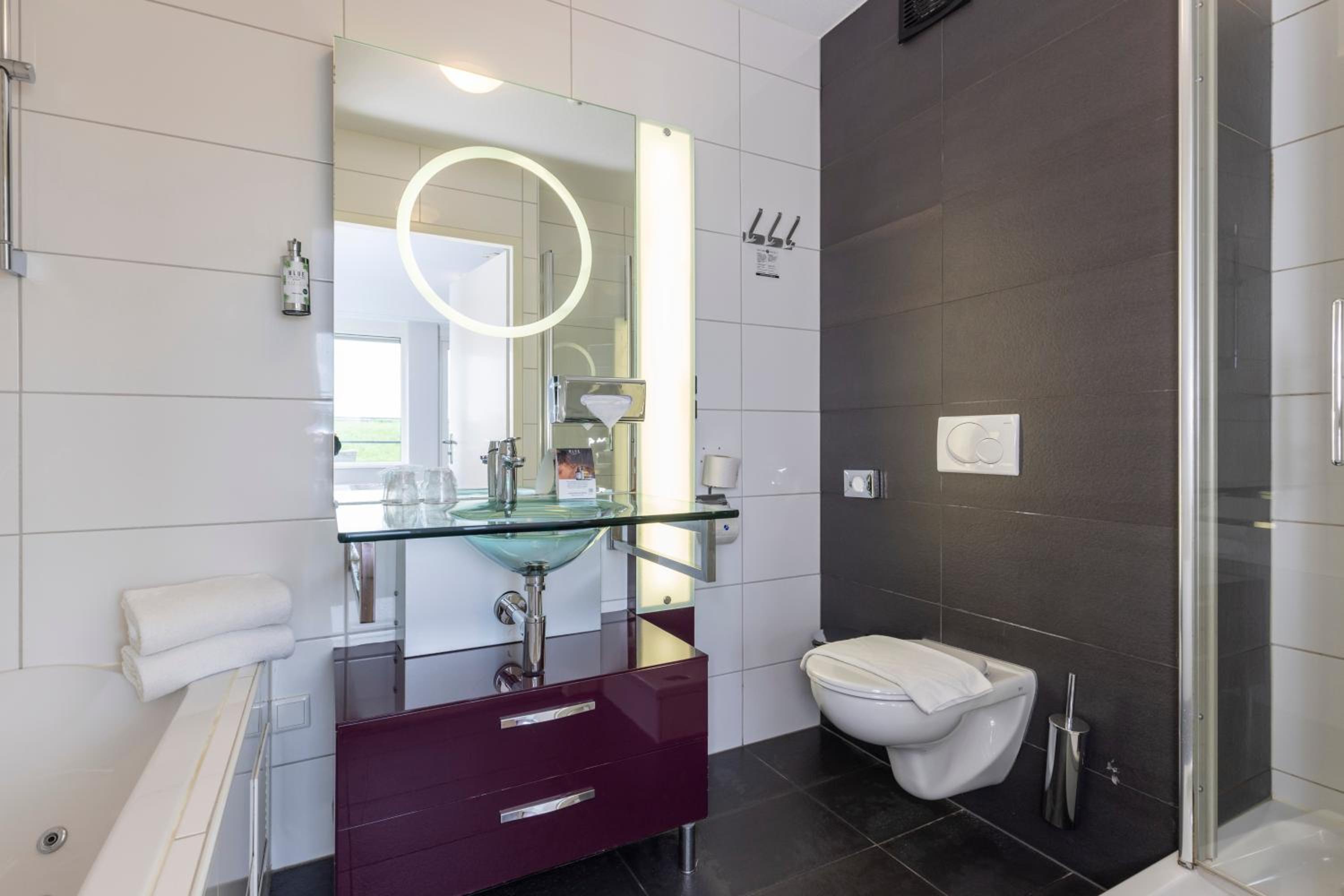 De locatie is erg afgelegen, aan de receptie zit 1 dame met een erg grote bril, die snapt er niks van! Het hotel lijkt vroeger een parenclub geweest te zijn met de rode bar en fout plafond in de heren wc. Navraag aan personeel en GPT leert mij dat dat niet zo was. Nou ja, dan was het waarschijnlijk een interieur designer met een uitgesproken smaak! De kamers zijn verrassend ruim, met een zeer luxe badkamer incl. bubbelbad en extreem ruime douche. De kingsize bedden zijn zo groot dat ik niet wist dat ze er zo groot zijn. Super lekker op geslapen ook! Het ontbijt is erg goed en uitgebreid, de koffie uit de beschikbare automaat is erg goed.