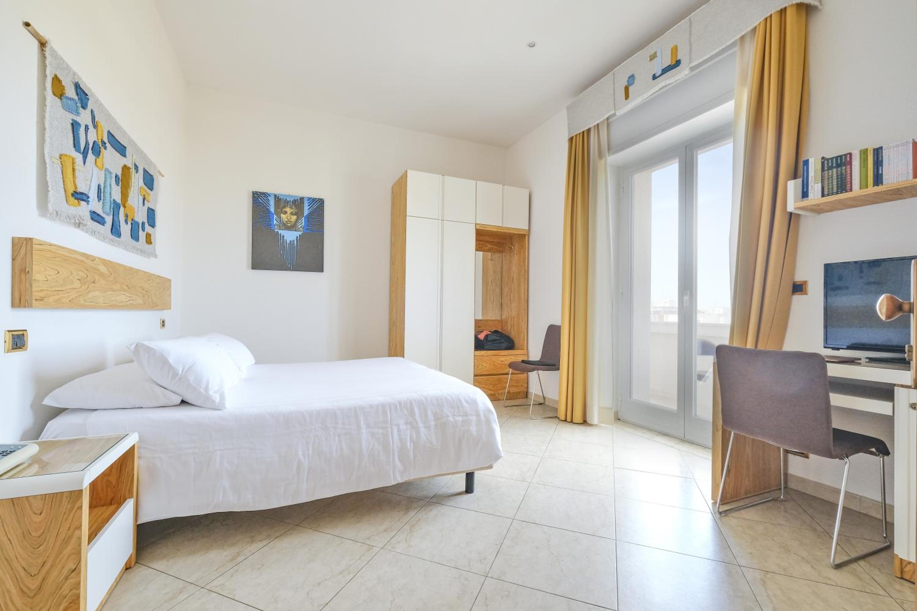 The Joli Park Hotel is fairly conveniently locate a few hundred meters from the train station, which also serves as the bus station. The Corso Roma is the street on the north side of the hotel, and the main street leading through the city to the port, and the old city and fortress on the island. There are plenty of restaurants and shopping along the Corso Roma. The room was lovely, with a balcony, and a fantastic view of the harbor, and the Gulf of Taranto north of the city. The breakfast was more than adequate. Although this is an older facility, it has been renovated more than once. The interior is nicely decorated with original art, and various fishing related crafts and tschotschkis. The hotel has a beautiful pool, but I didn't take advantage of it.
