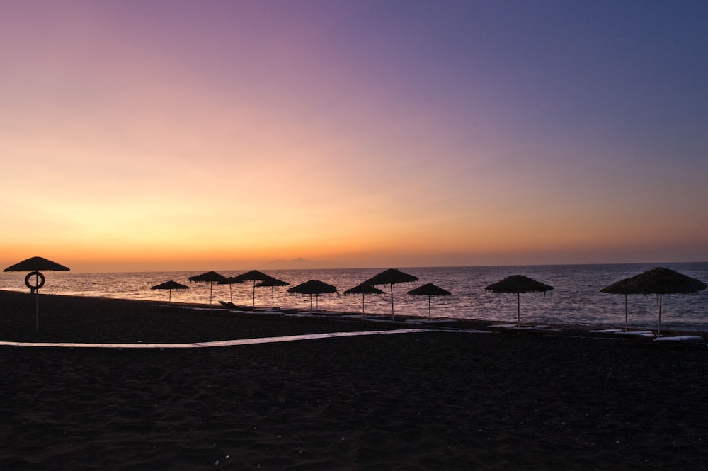 An amazing hotel. Beautifully kept. Great location. Every member of staff were fantastic especially Christina (and I thnk Alex) on reception, cleaners, bar staff etc. Free sunbeds and umbrellas on the beach (€8 for people not in the hotel). The pool area is gorgeous. Lots of sunbeds still free at 10am. Breakfast was great. Loads and loads of restaurants, beach bars really close by. Bus links to fira good but busy sometimes. To get anywhere else by bus you need to go to fira (€2.40) and then on from there. About €25 taxi to fira and €50 to Oia. One day visiting Fira and Oia was enough - amazing sunsets but sooo busy. Would definitely return to this hotel.