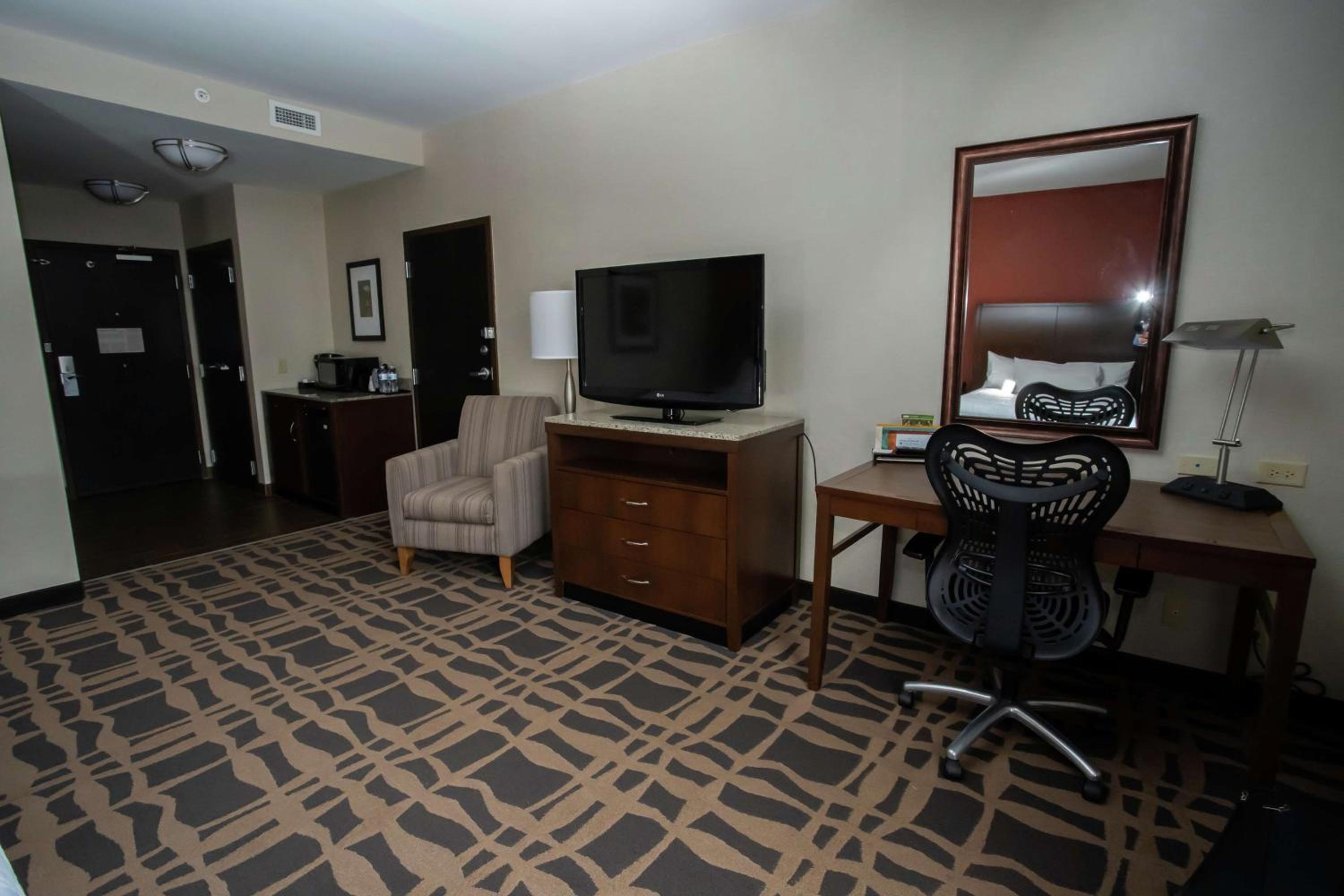 Each room is equipped with a flat-screen TV, work desk, microwave, and refrigerator. Guests can also enjoy free Wi-Fi, ensuring a comfortable and connected stay. The hotel's indoor pool provides a relaxing retreat after a busy day.