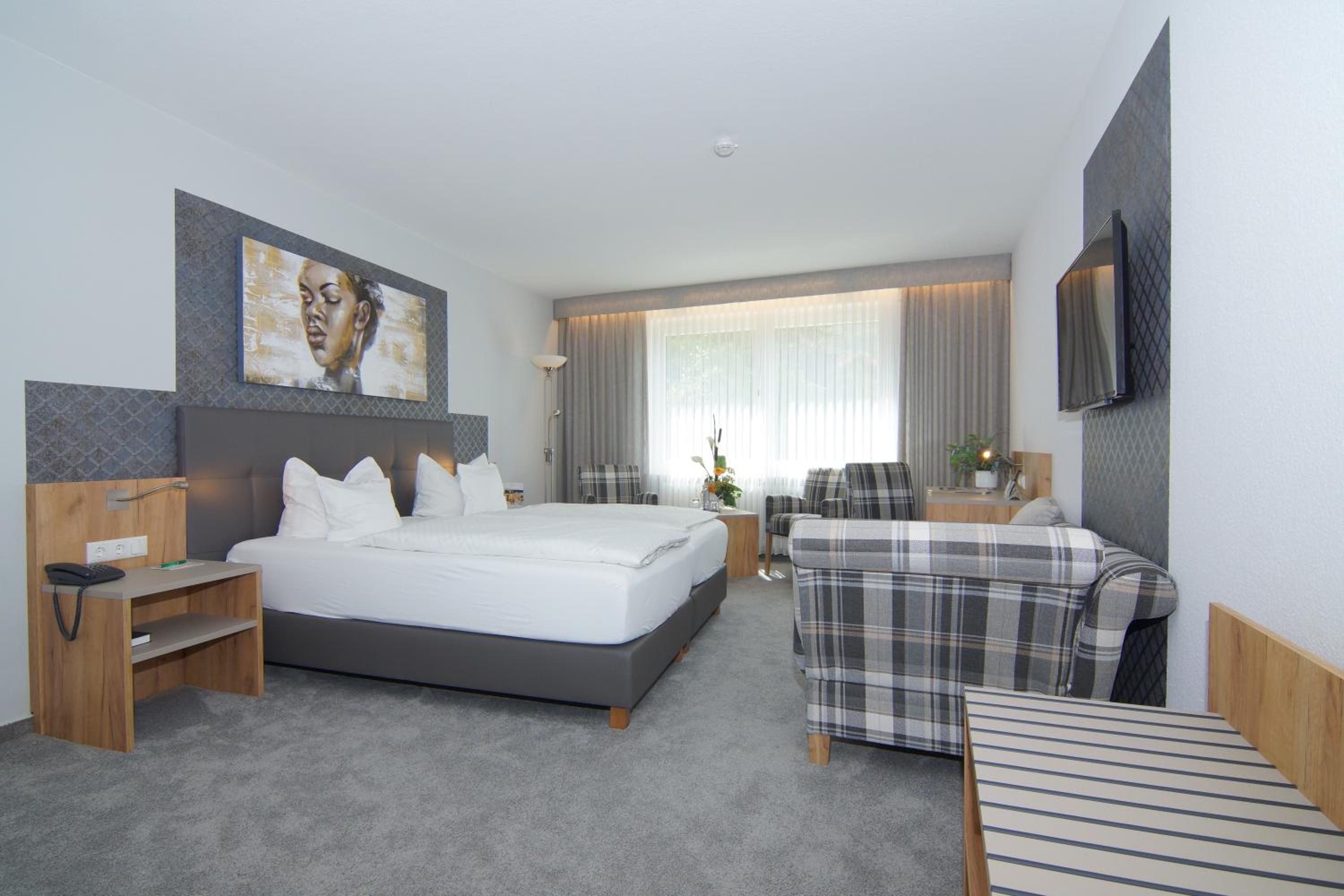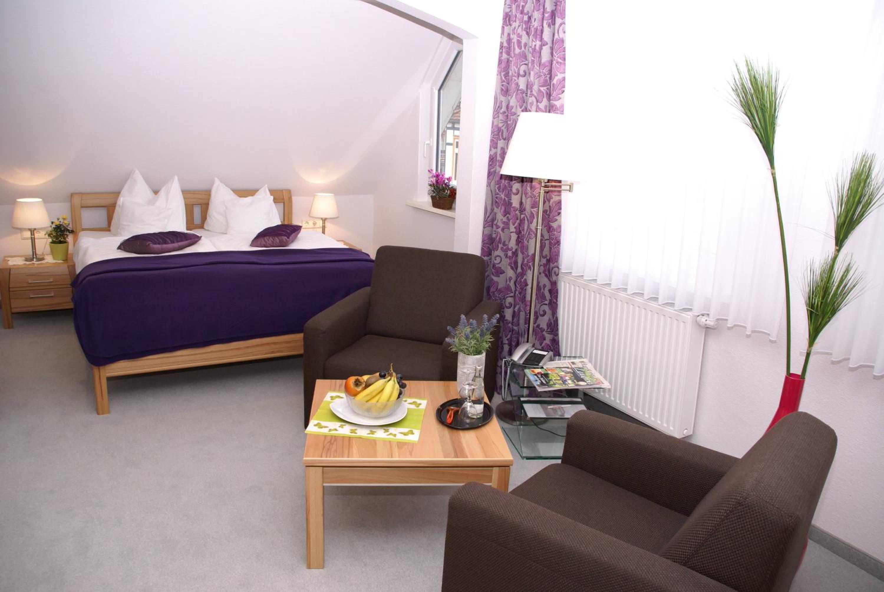 Each room features cable TV, a seating area, and a private bathroom. Guests can enjoy a south-facing balcony or views of the Kurpark spa park.