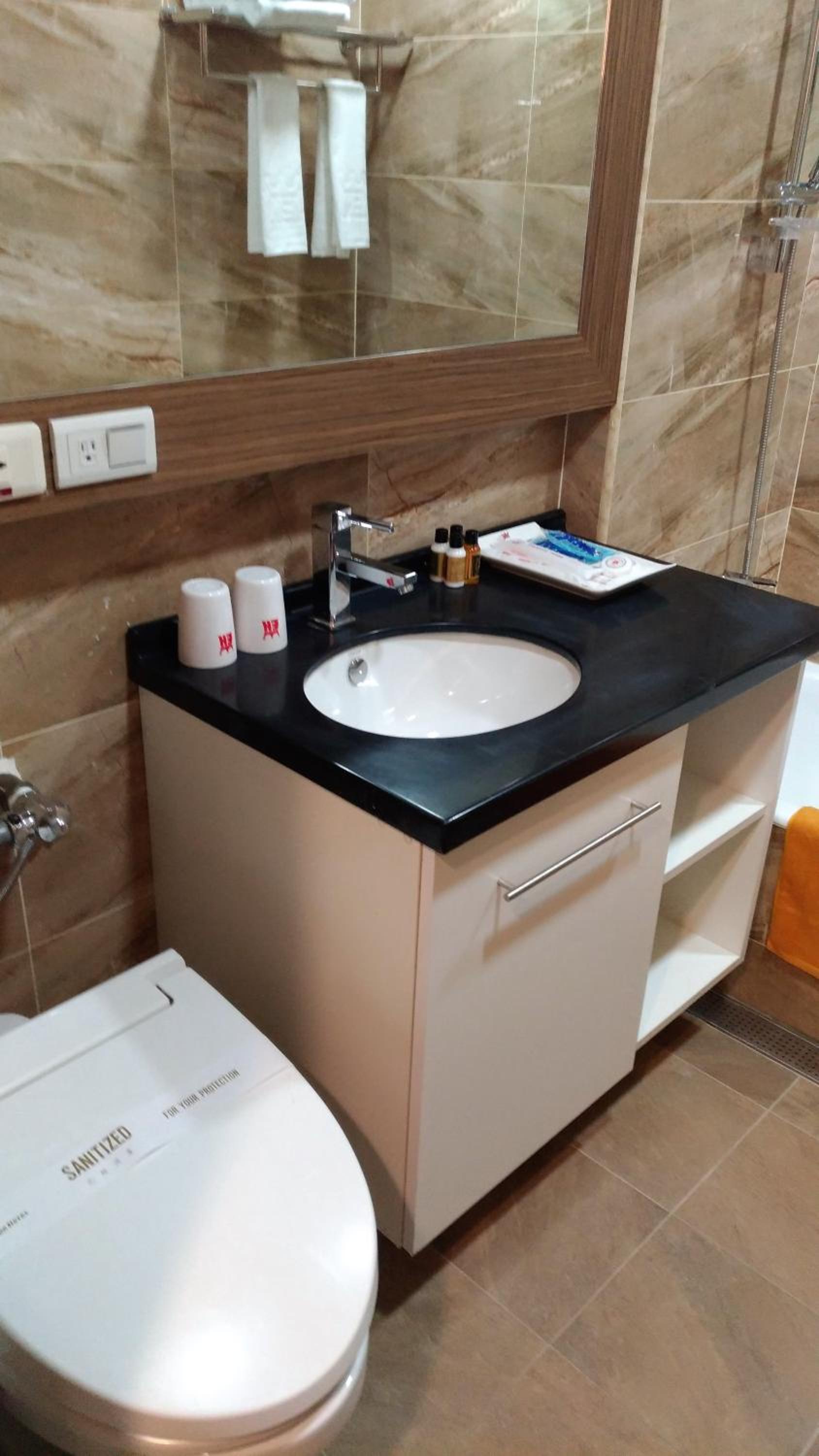 房間就是上世紀的風格,沿用至今,所以顯得老舊,浴室也是非常老舊的風格,沒有做任何的翻新工程,如同步入1990年的飯店,牆壁非常薄,所以隔壁跟走道有人進出開門走路講話都異常清晰,特別是浴室可以聽的非常非常清楚的其他客人的談話、廁所沖水聲、吹風機聲;熱水穩定、房間環境倒是都挺乾淨的,但是床頭沒有任何的插座,手機充電比較麻煩,就是剛下飛機隨便選了一個週六台北比較合理的房價就選擇了這間國王大飯店,地點很好,但是房間的品質跟感受不會很好,但是家人都很好睡沒有被吵醒就還可以了