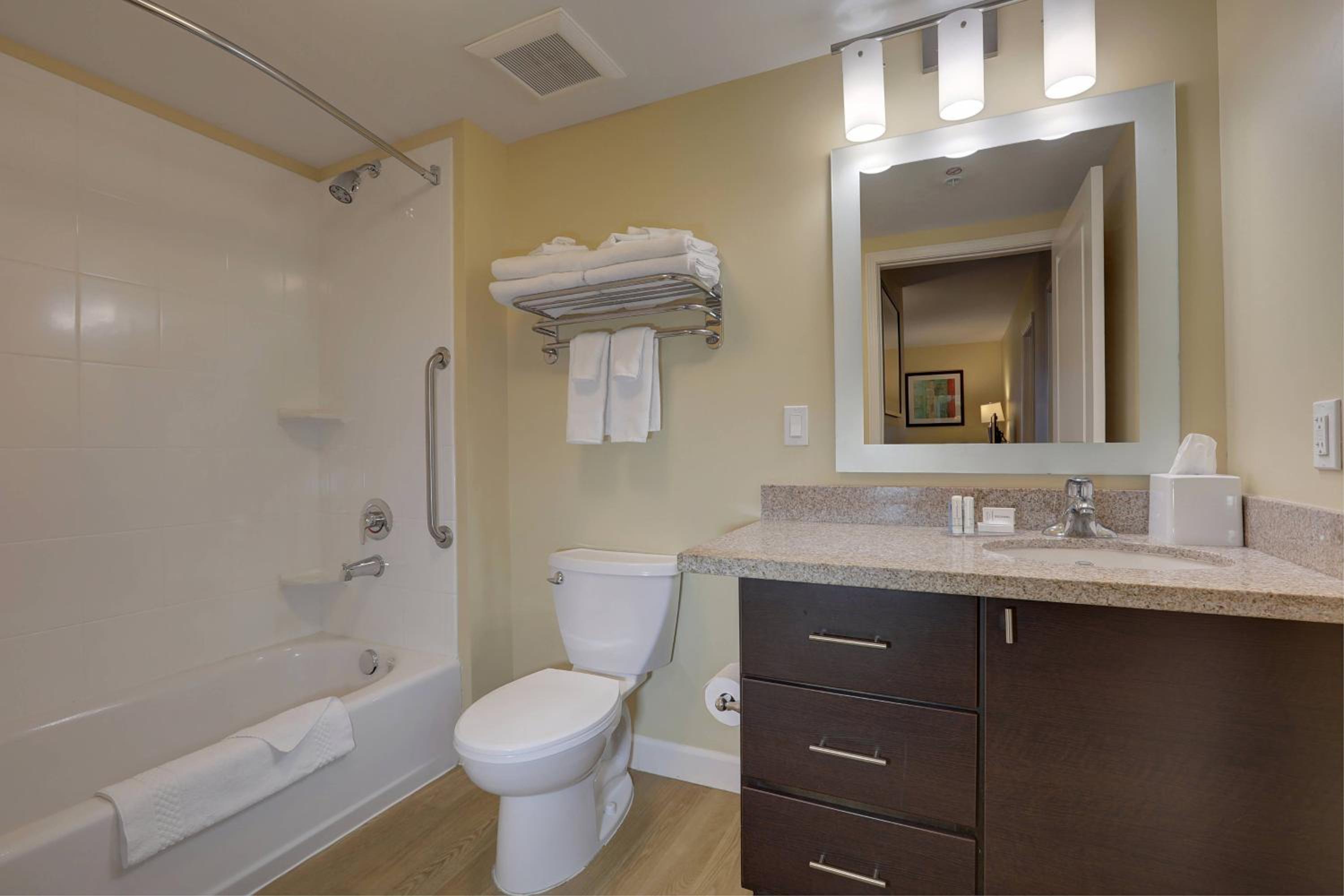 One night stay because our water main broke. The hotel staff was very friendly. The lobby was nice and spacious. It had a small convenience store with snacks and drinks. The room was nice. Small kitchen area. The bathroom was on the small side and it faced into the room. We had a small child above us that ran across the room continually until midnight. The bathroom was mostly clean. Some residual matter under the toilet seat and long black hairs on the shower wall. Breakfast was fine. Usual fare eggs, sausage and waffles. Our stay was quick and we were comfortable.