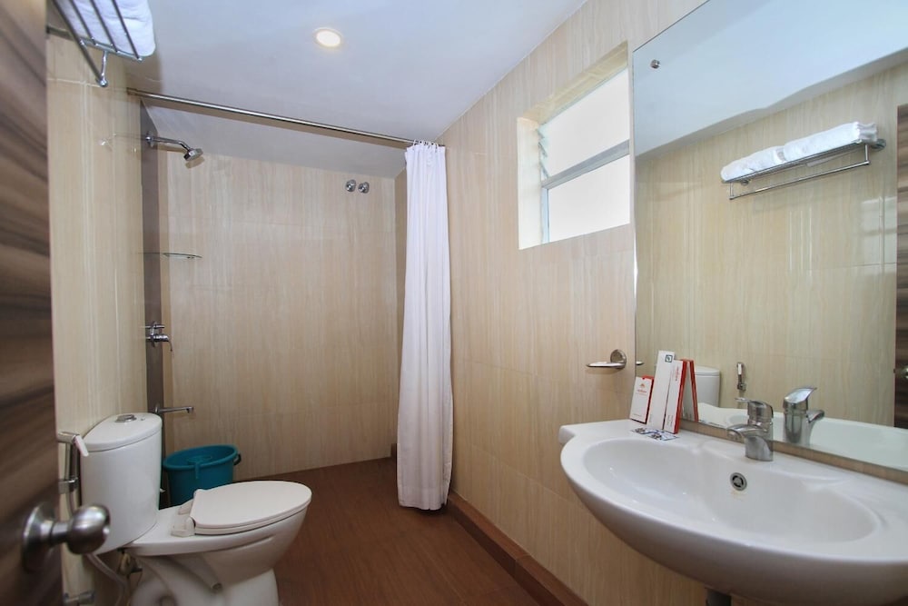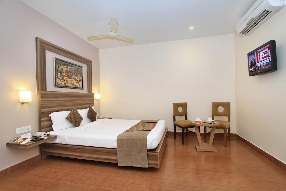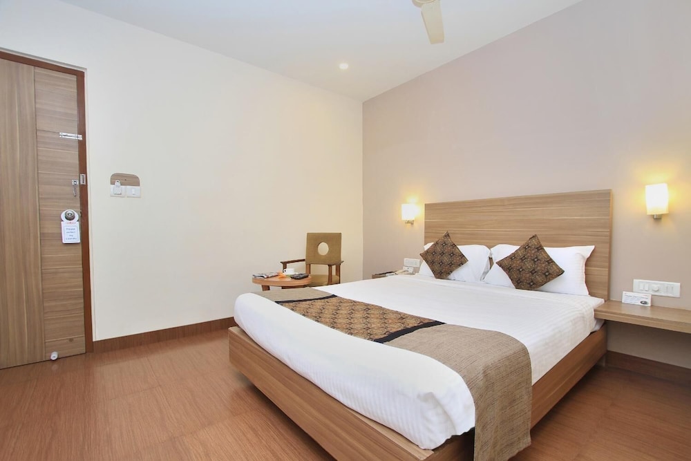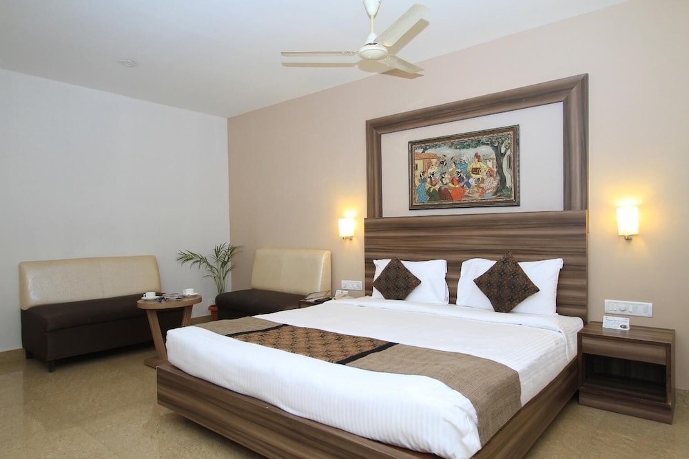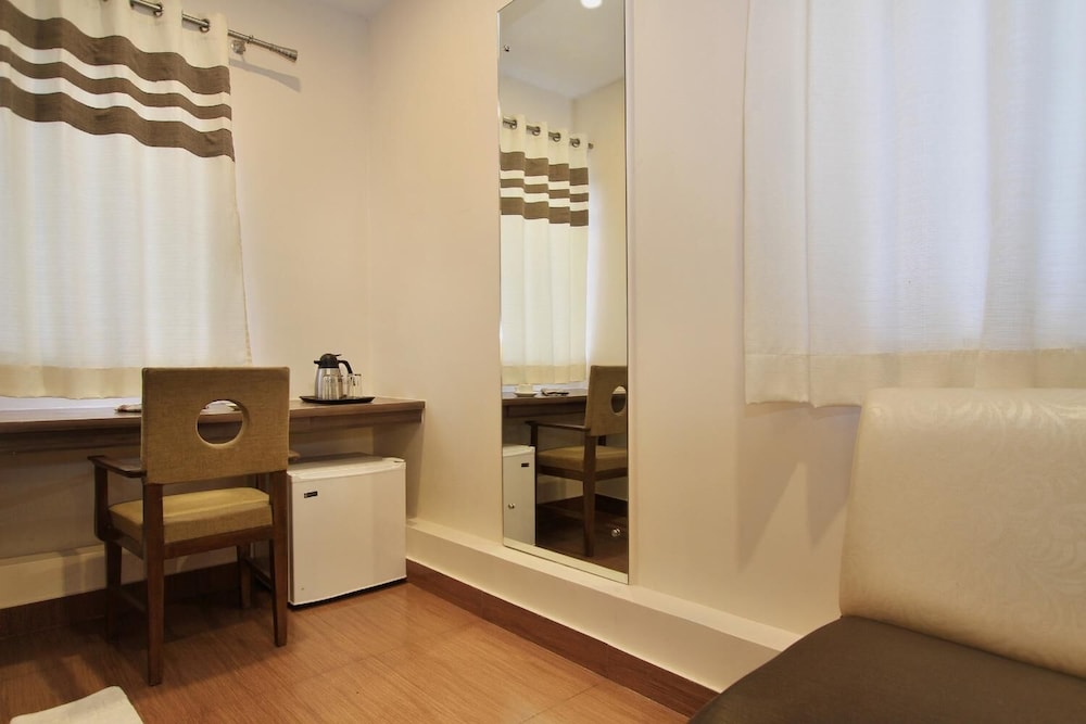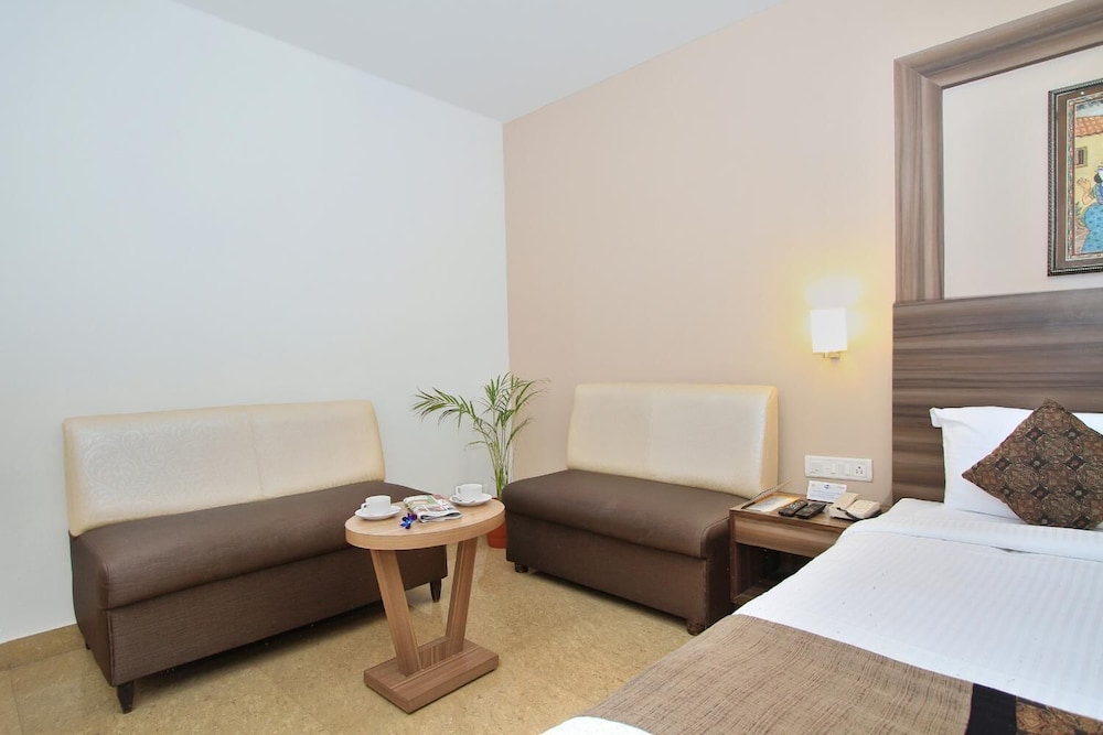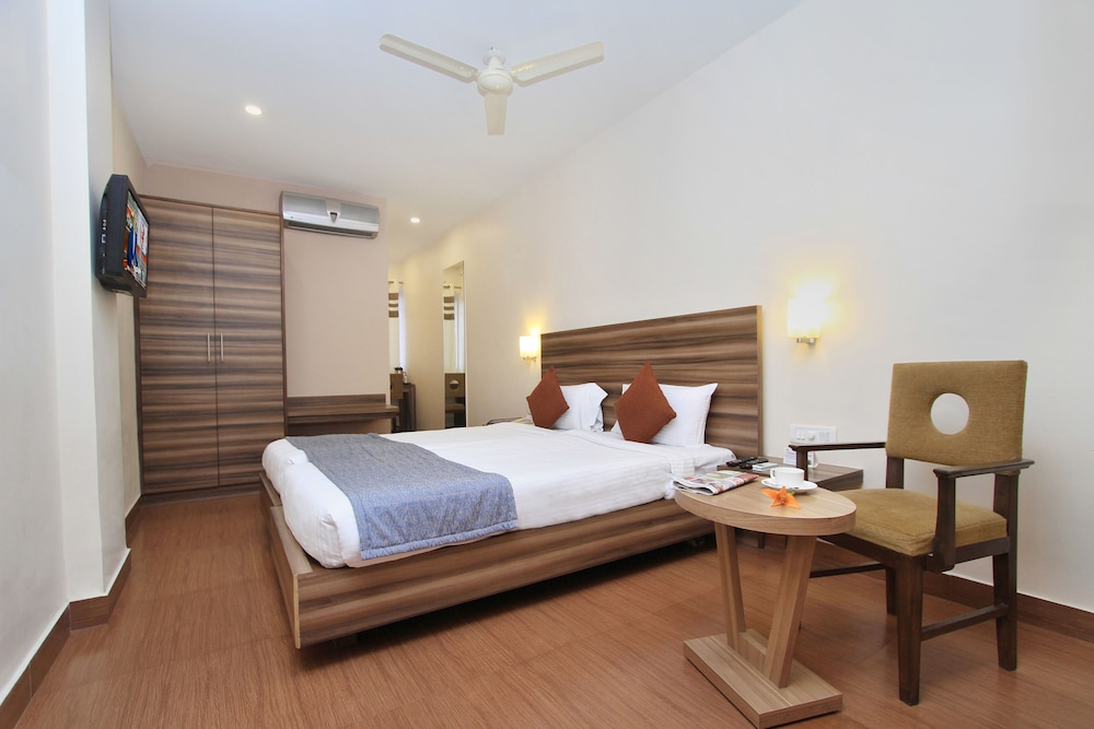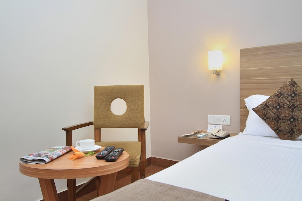 I booked this hotel on Expedia India. The site claimed that it was close to the Bangalore airport. It was 1 hour away. The hotel could not accept foreign credit cards, so beware, Make sure you have cash. (They should warn you about this at the time of reservations.) The room was small and very clean with a working small television and plenty of hot water. Nice. Breakfast does not start until 8:00 (late by Indian standards). They do this so that early risers will order room service. The hotel is located in a lively area of Bangalore with many restaurants and shops. Eat out and avoid the overpriced hotel restaurant.