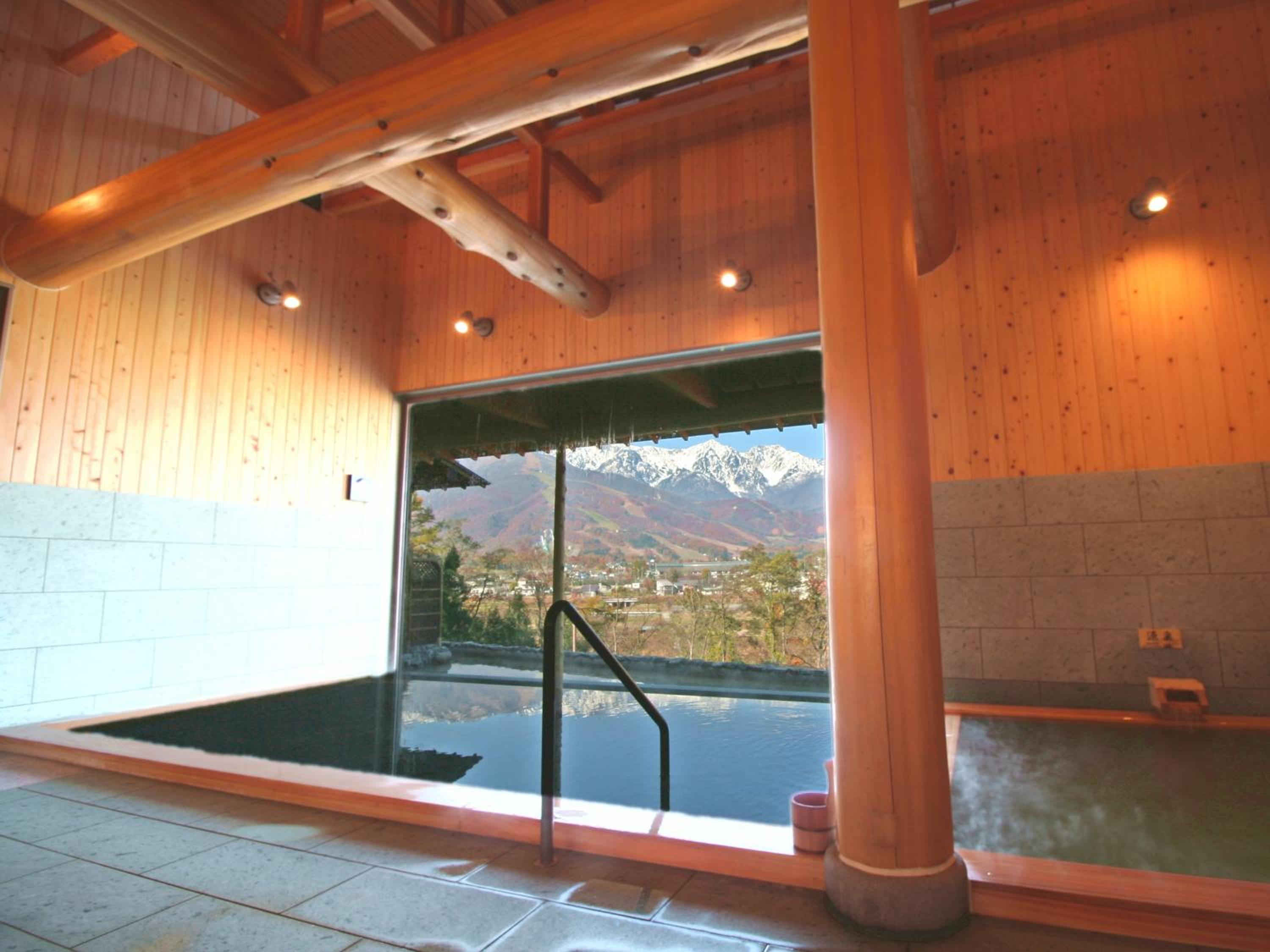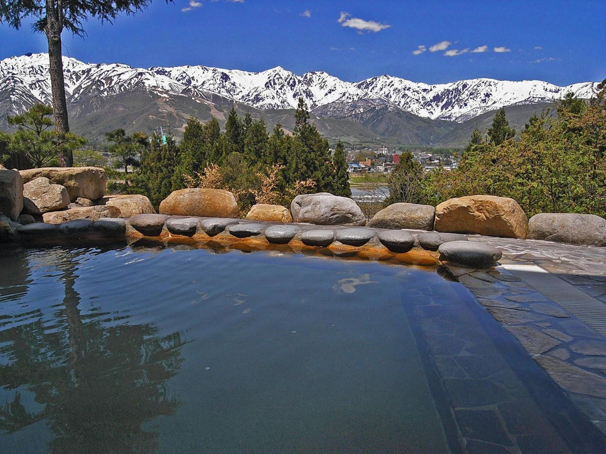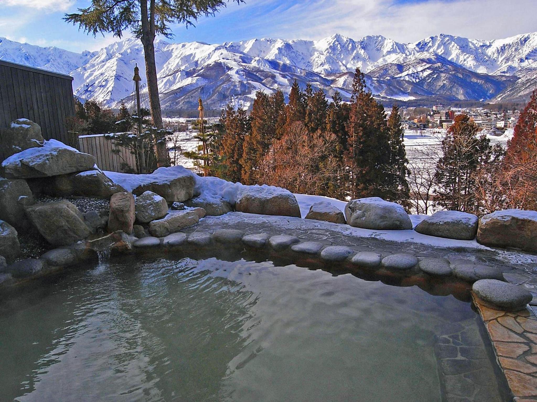 Experience breathtaking mountain views and unwind in the outdoor hot spring bath at Highland Hotel. The perfect retreat after a day of adventure at Hakuba Happo-One Ski Resort.
