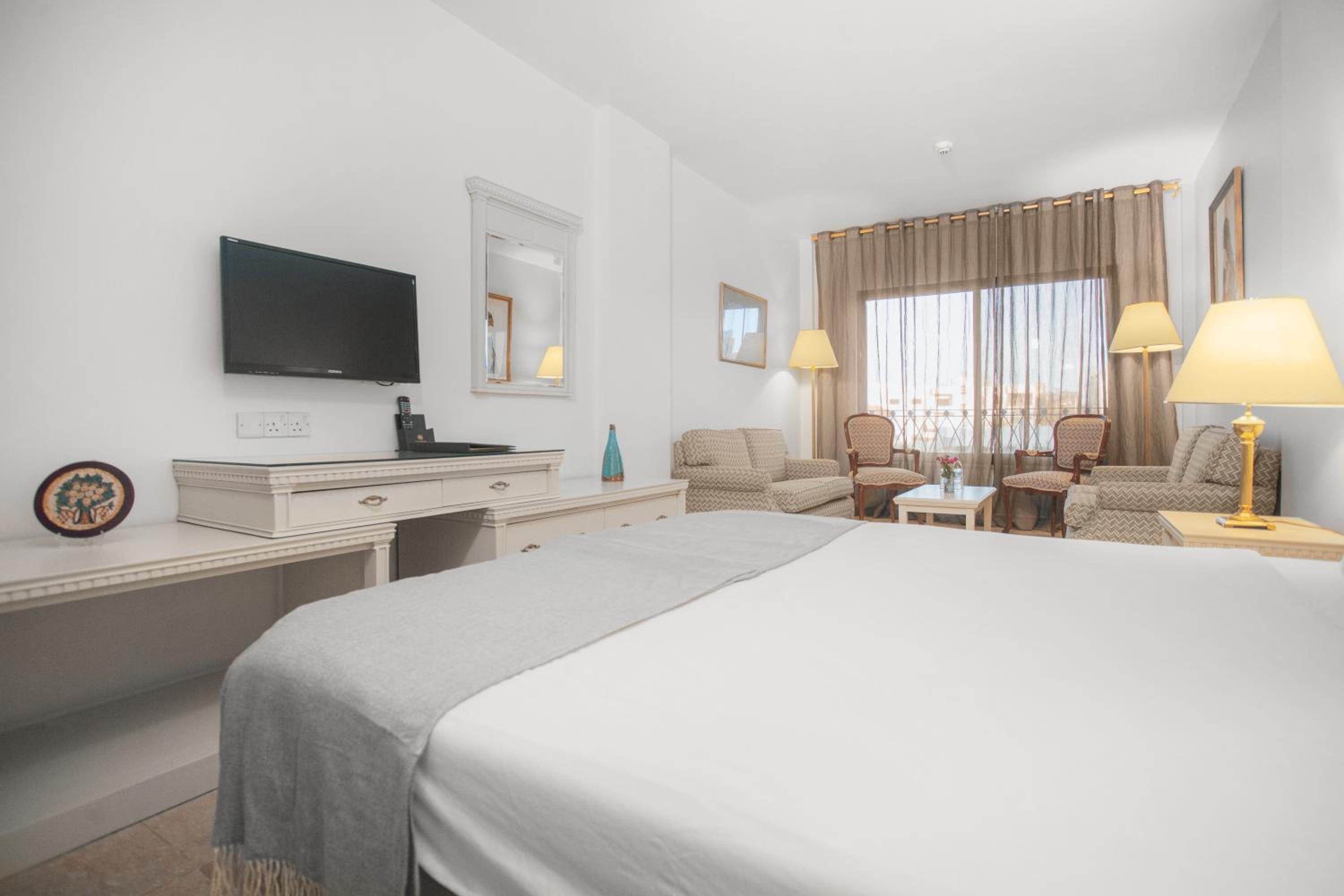 The Grand Hotel Madaba offers 84 spacious rooms with en-suite facilities, some featuring balconies with stunning pool and city views.