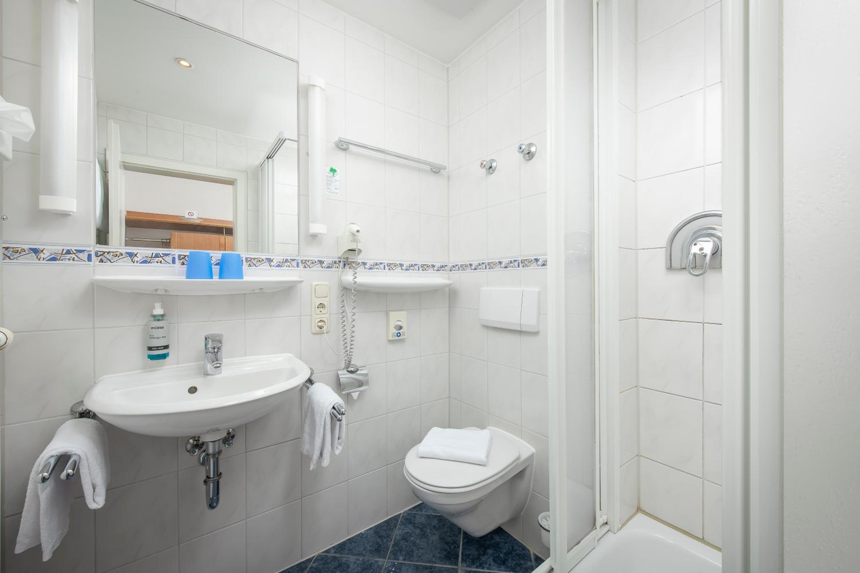 Die Dusche an den Rändern verschimmelt. Liegt nicht am putzen des Personals.