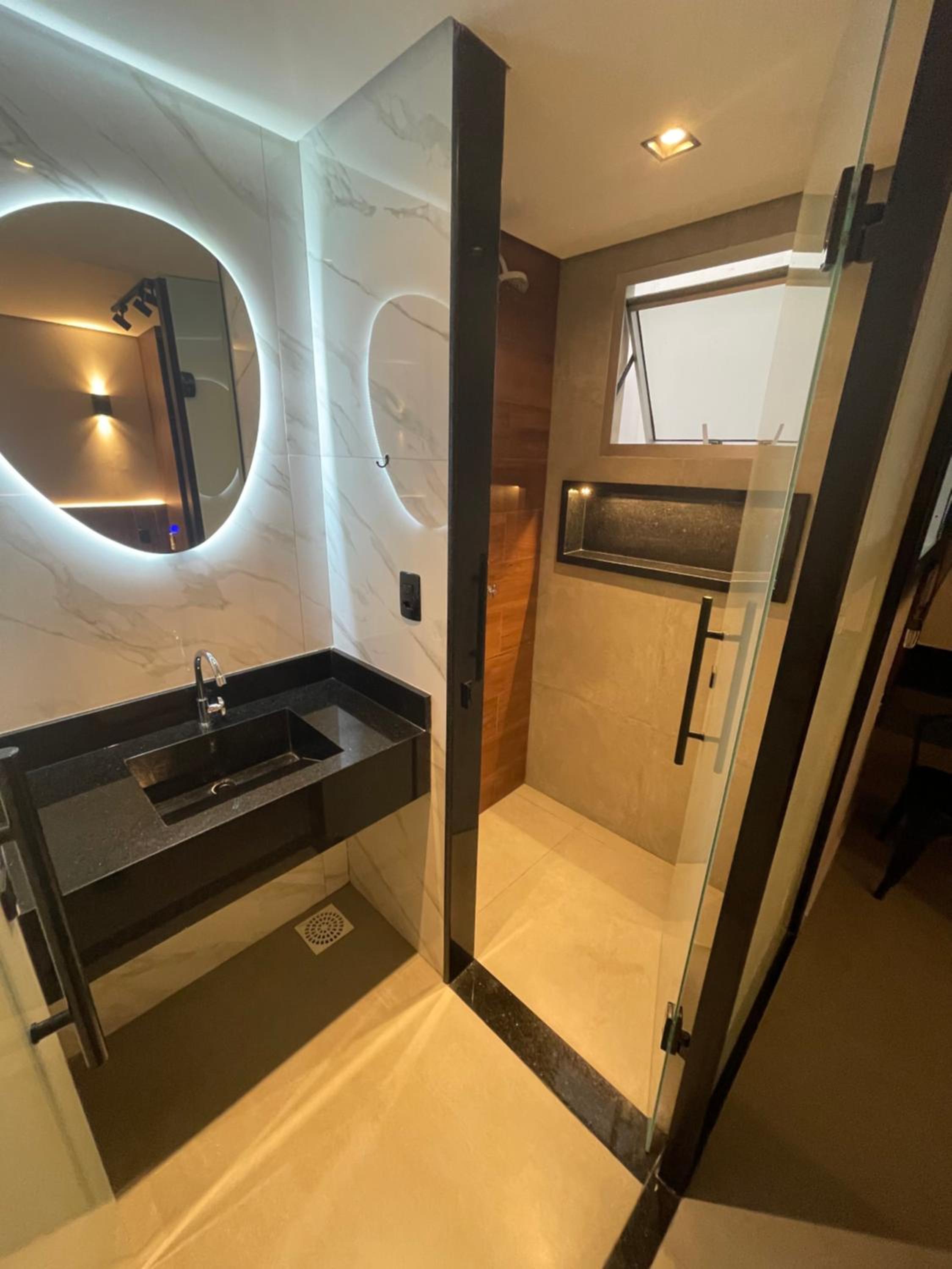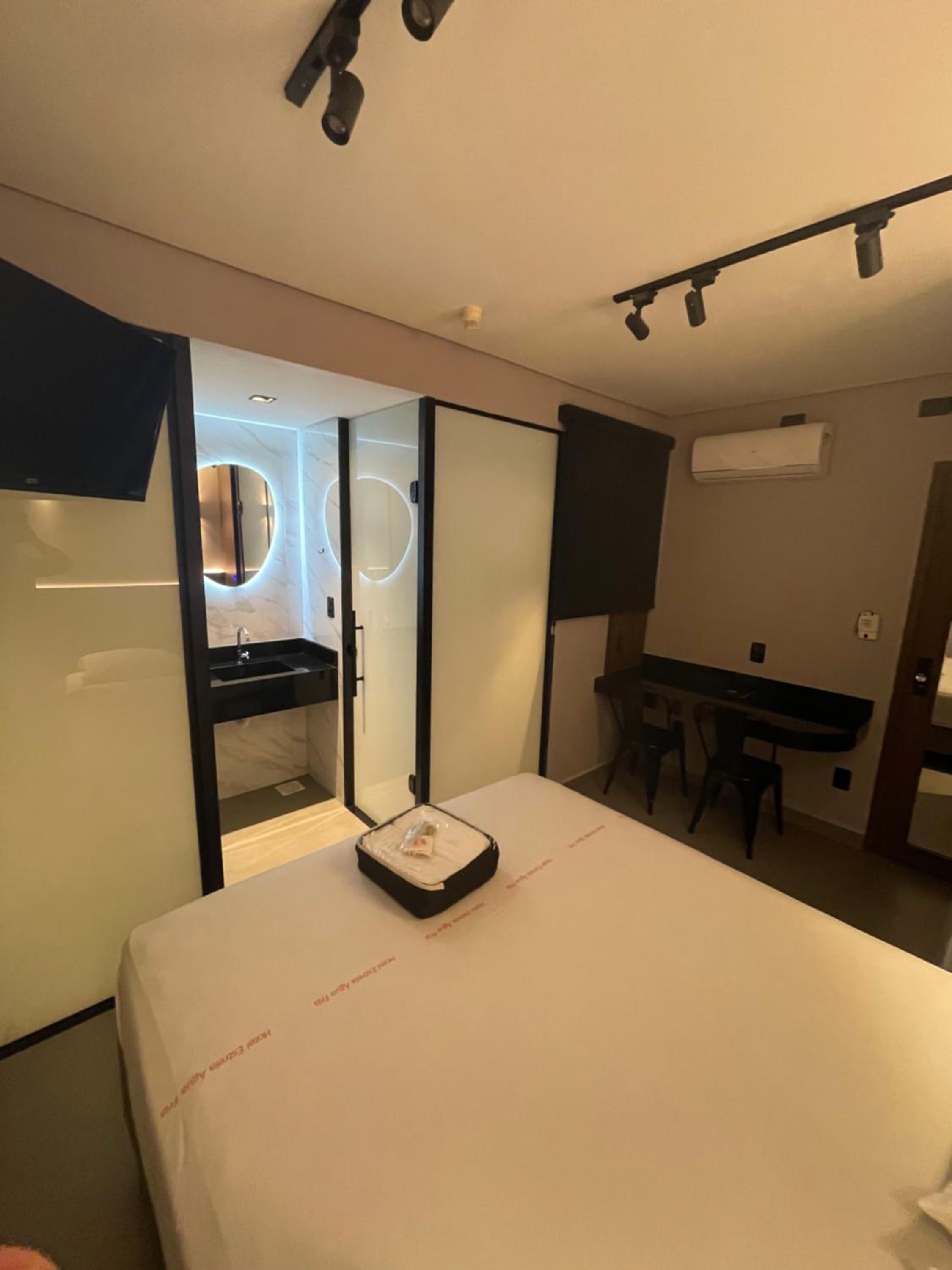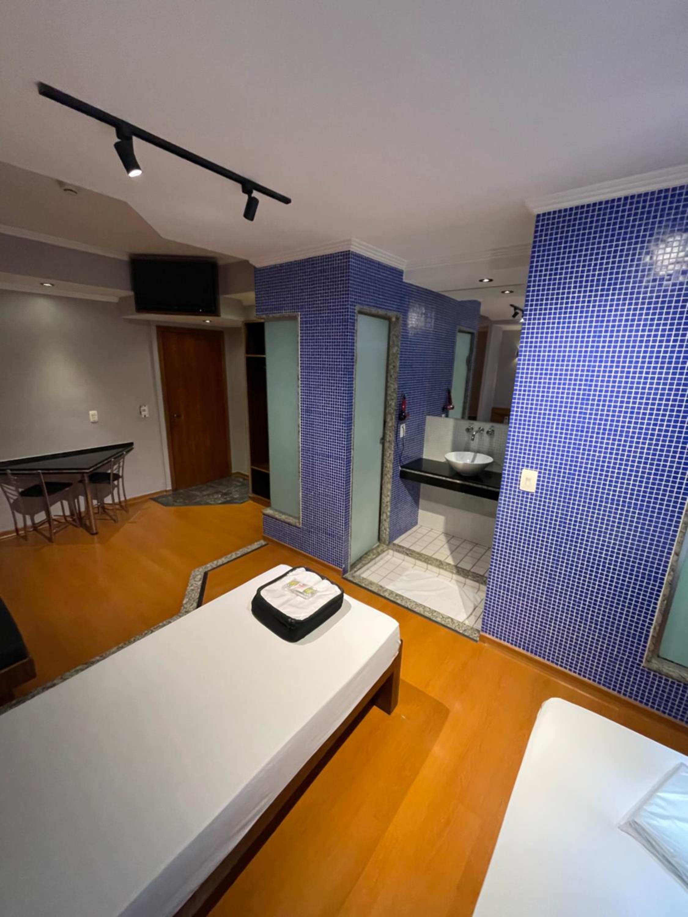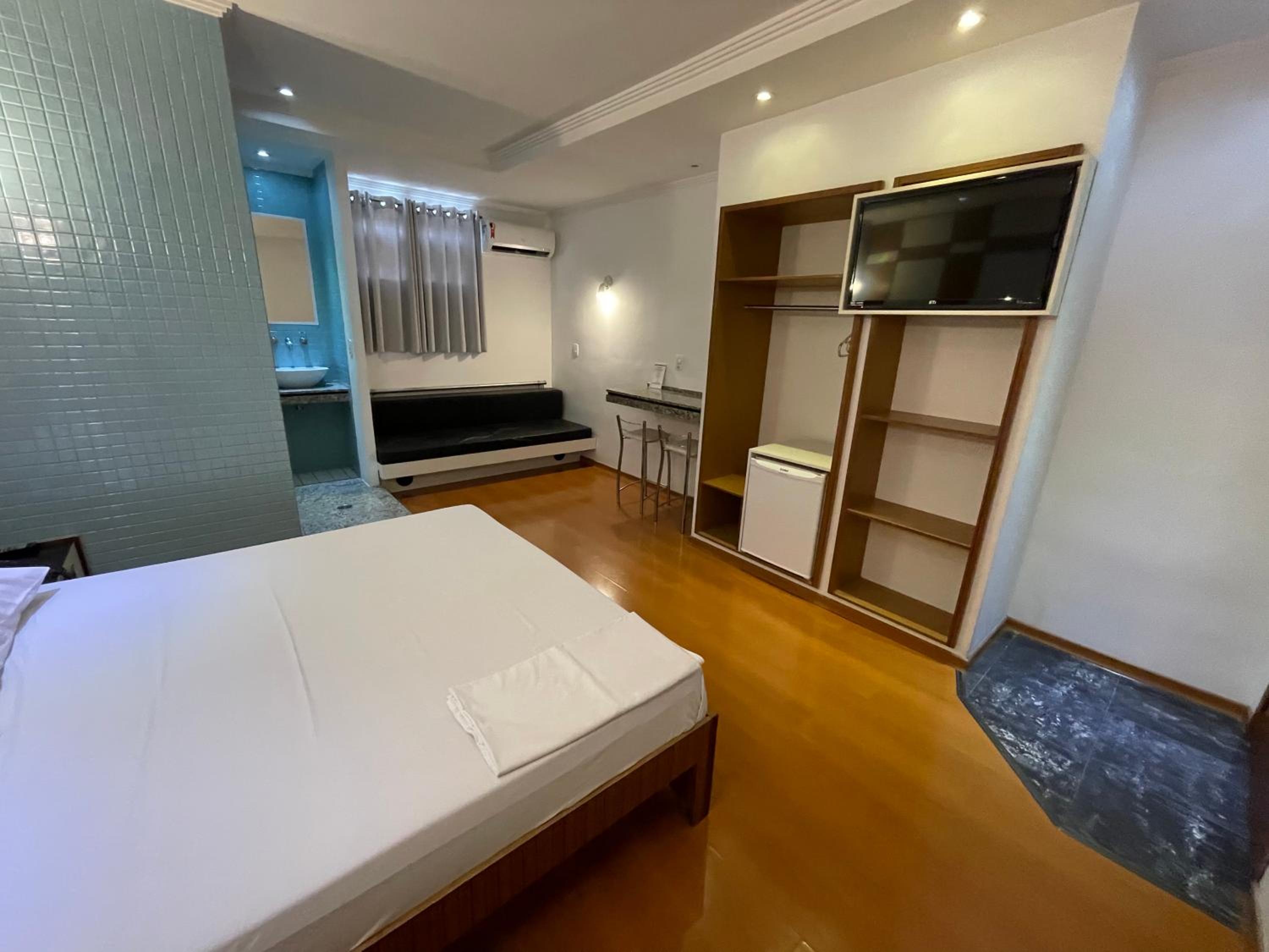 O quarto era de um tamanho mto bom, mto bem dividido. O banheiro bem limpo também e a área seca é separada da molhada.
