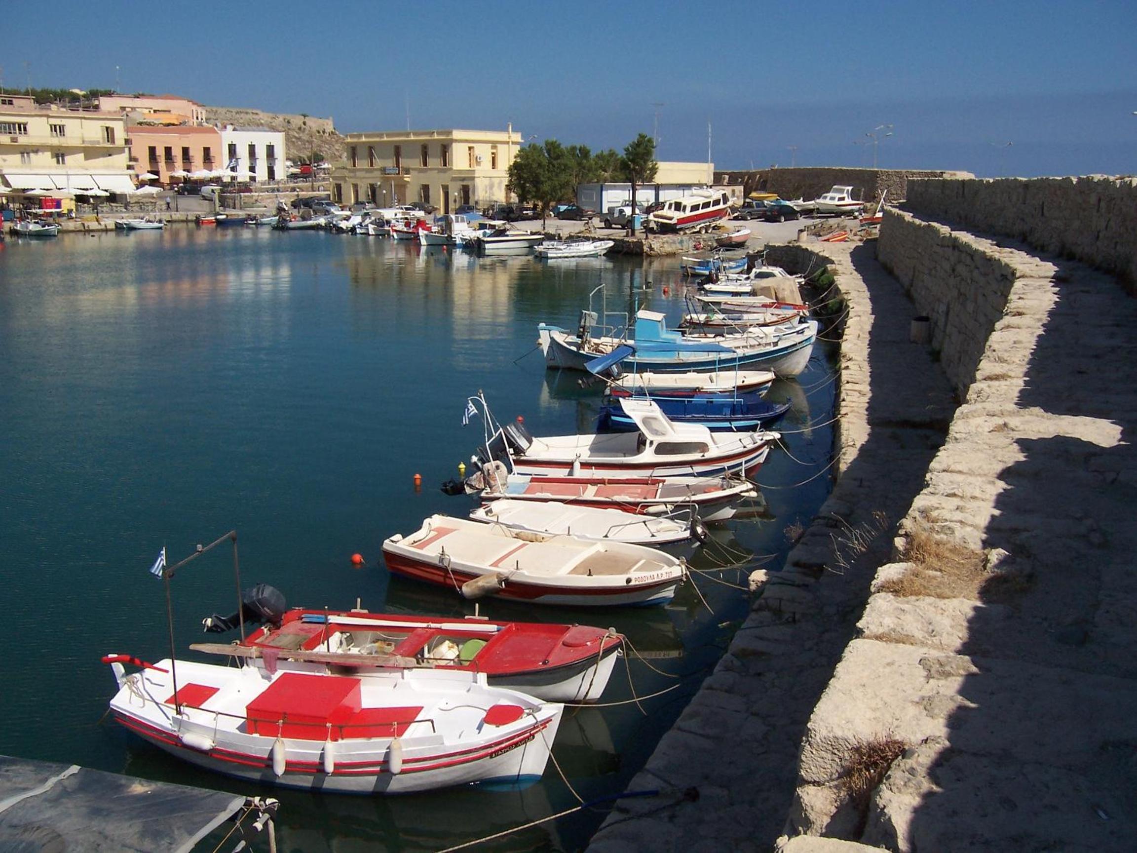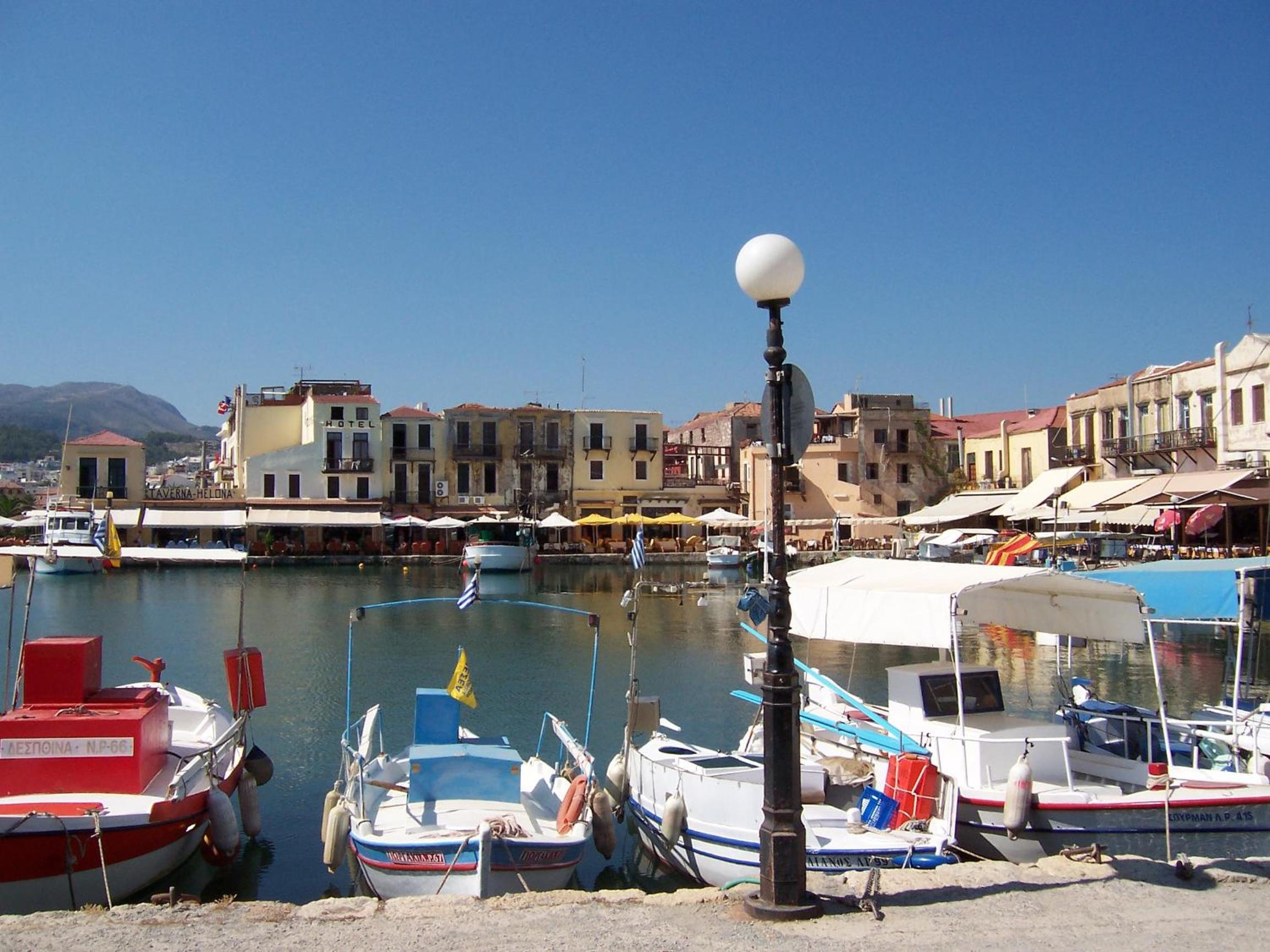 Le parking juste en face, tellement pratique à Rethymnon en été. La vue de la terrasse, aménagée avec des transats.