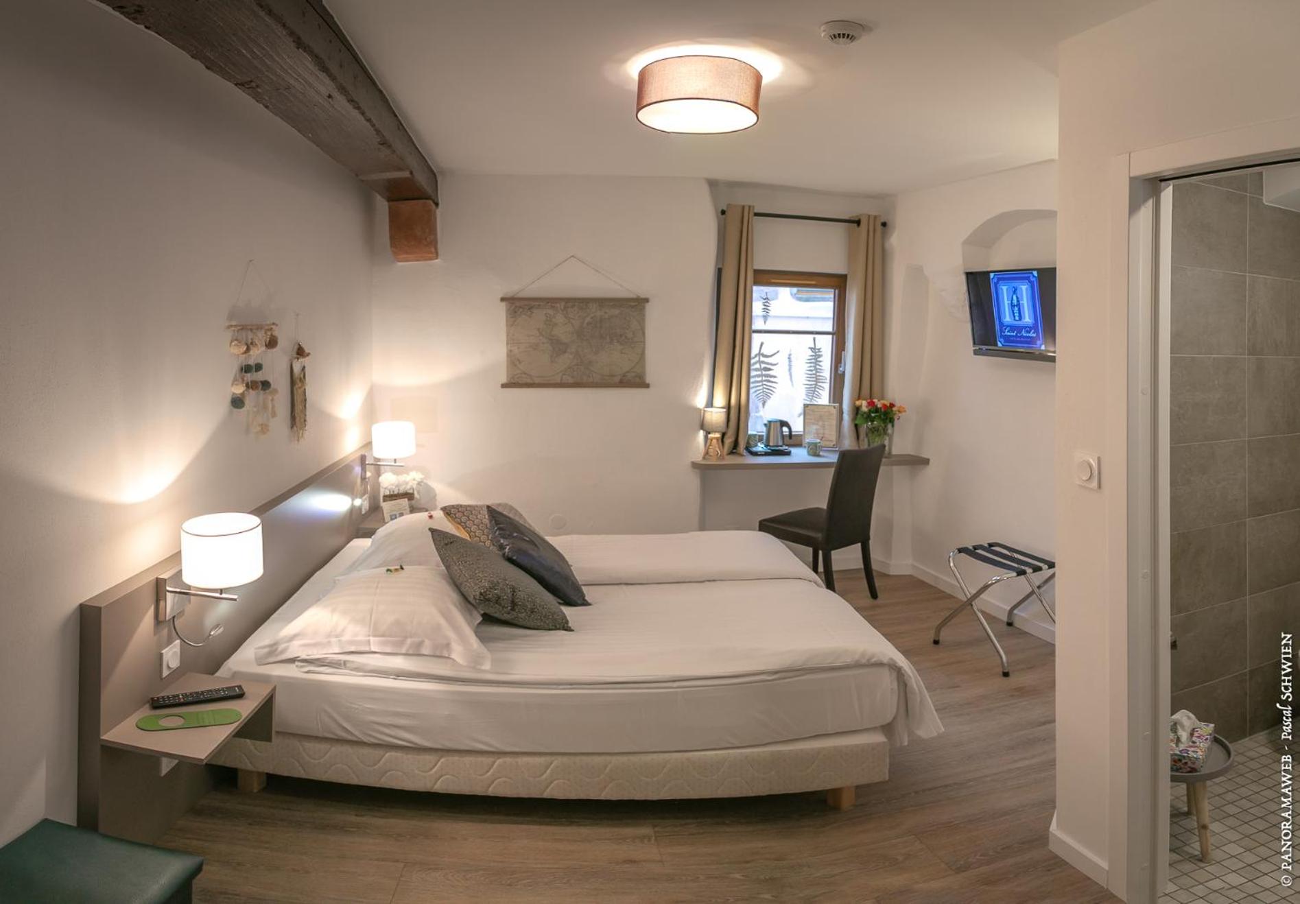 Modern Comforts: The guest rooms at Hôtel le Saint Nicolas are elegantly decorated and equipped with a flat-screen TV, private bathroom, and free WiFi, ensuring a comfortable stay for our guests.