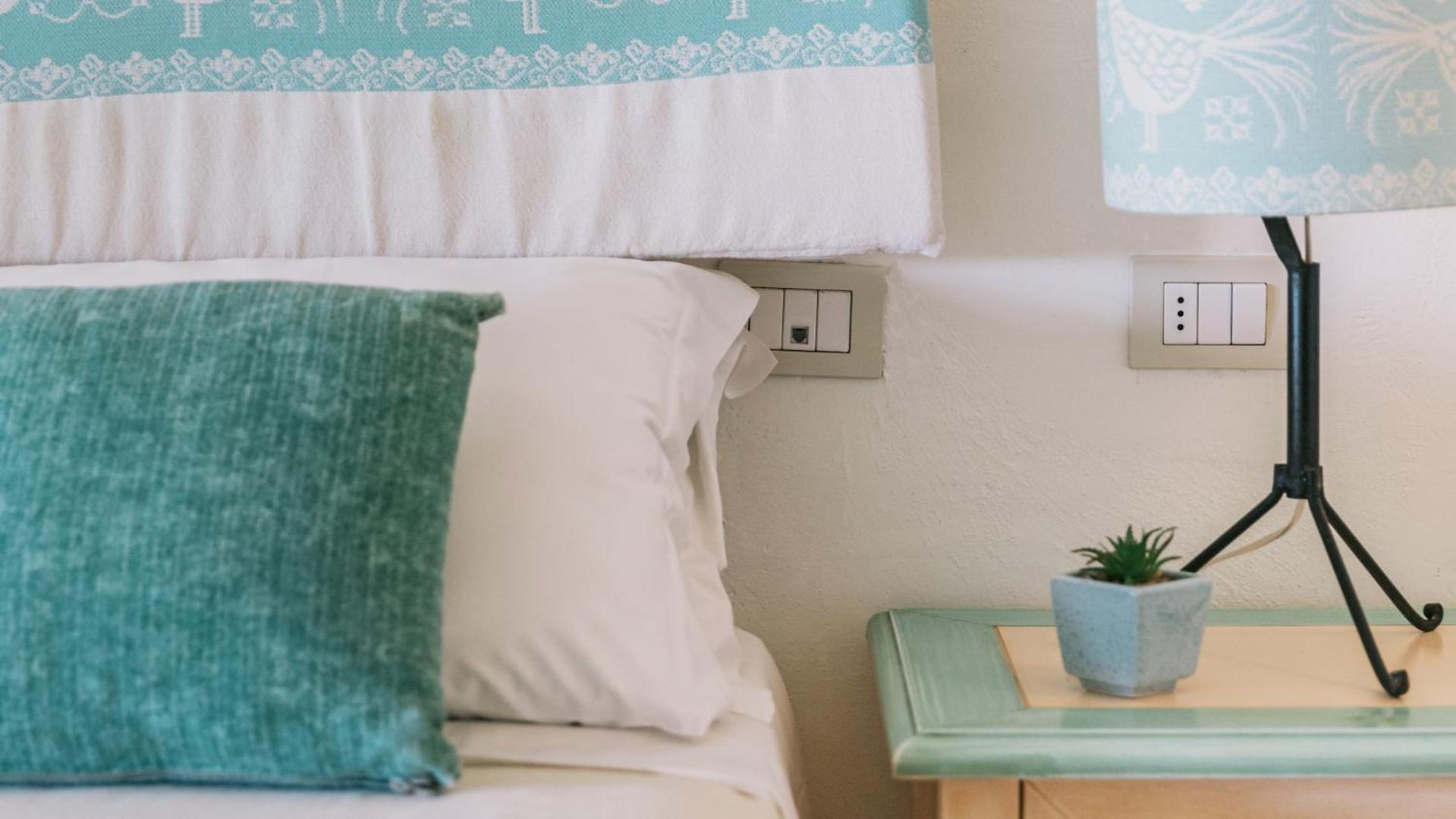 Bed a little uncomfortable, room very basic -only 1 plug fitted a standard Eur to UK plug, shower tray leaked, aircon smelt very bad, needed to hire a car to get about as location very remote, and taxis extortionate (200GBP from Olbia Airport one way)! No complimentary water provided, not so great for couples, more of a young family hotel. Beach bar not open all day. No UK rep or english written trip information (however we were out of season and the only english in residence).