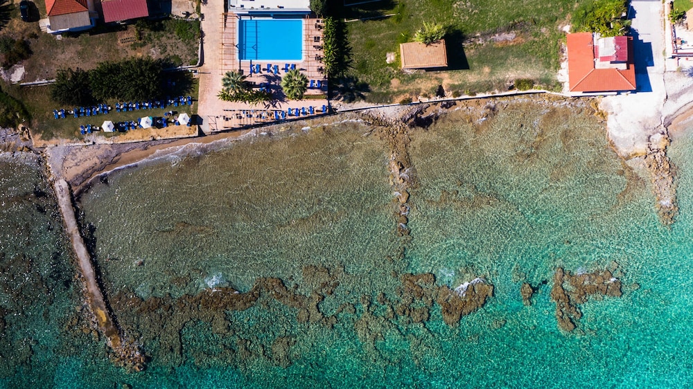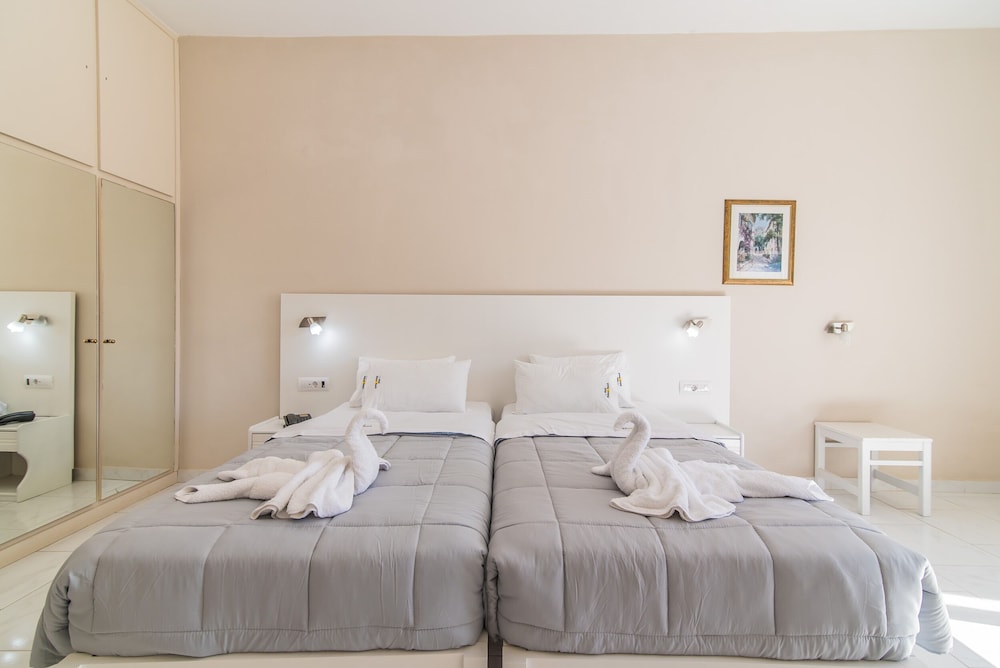 A lovely, quiet smaller family-run hotel located right on the beach, friendly staff, clean big rooms with free air con, always plenty of free sunbeds. Photos give an accurate picture of the place. No entertainment of an evening thank goodness, just the lapping of waves.