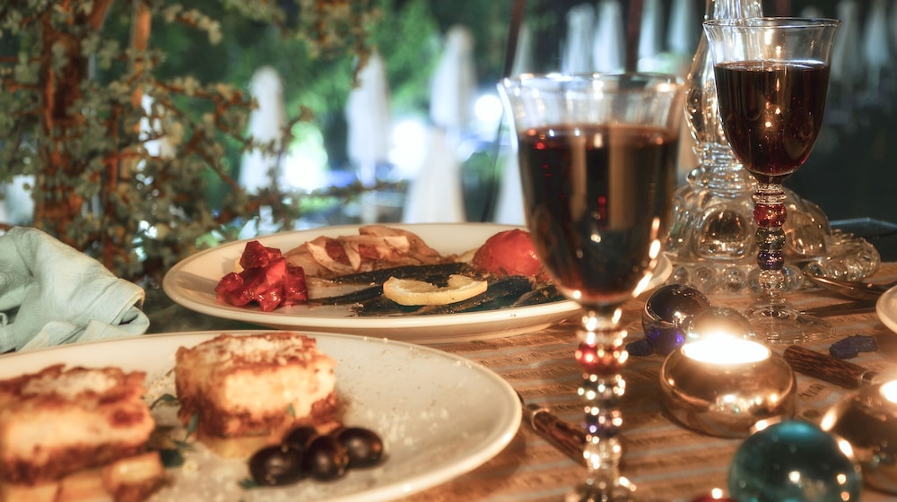 The evening meal is €30 per person, you get to help yourself to wines, beer, juices, water and tea and coffee. There is a service/set menus for the day - just ask the bar staff in the daytime what it is. We had - pizza, spaghetti, king prawns, pork gyros and a lovely pudding - safe to say we were stuffed!