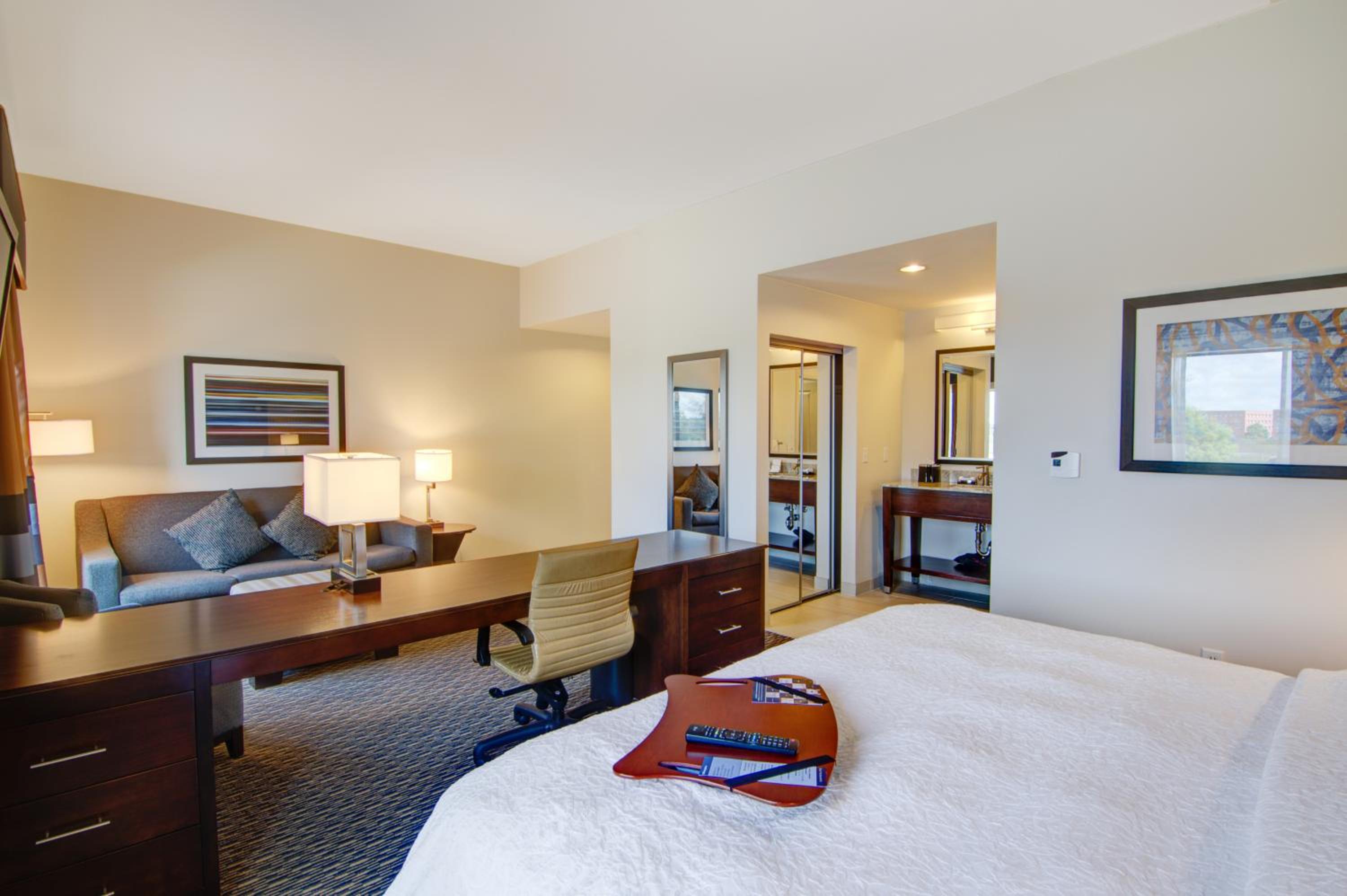 The Hampton Inn and Suites Trophy Club features guest rooms with natural colours, white linens, and modern amenities like flat-screen TVs and free high-speed wireless internet access.