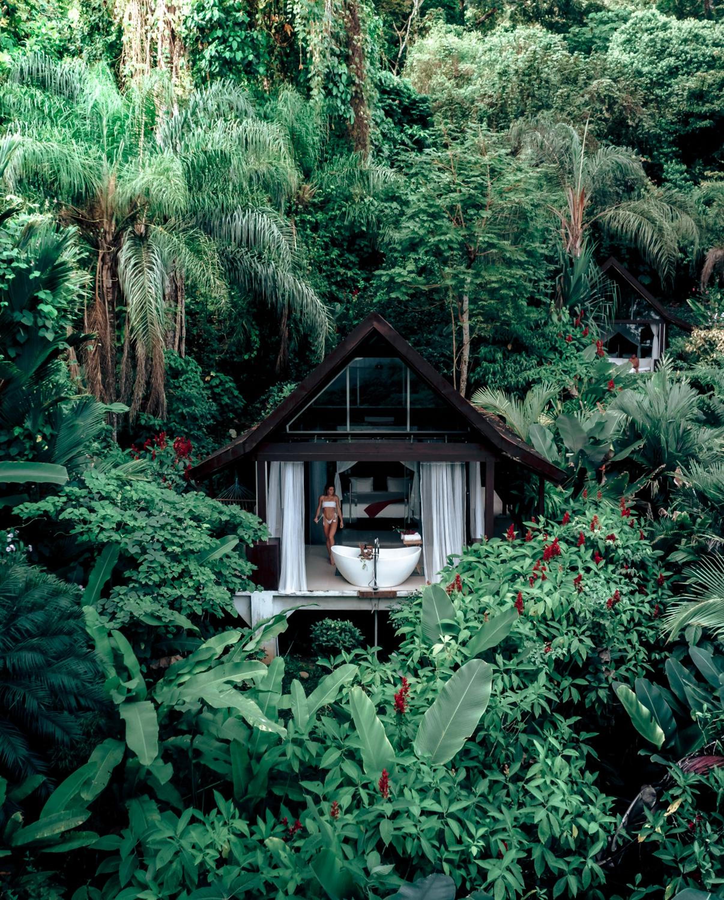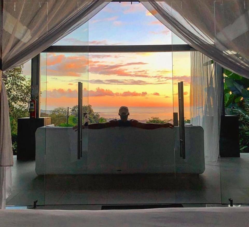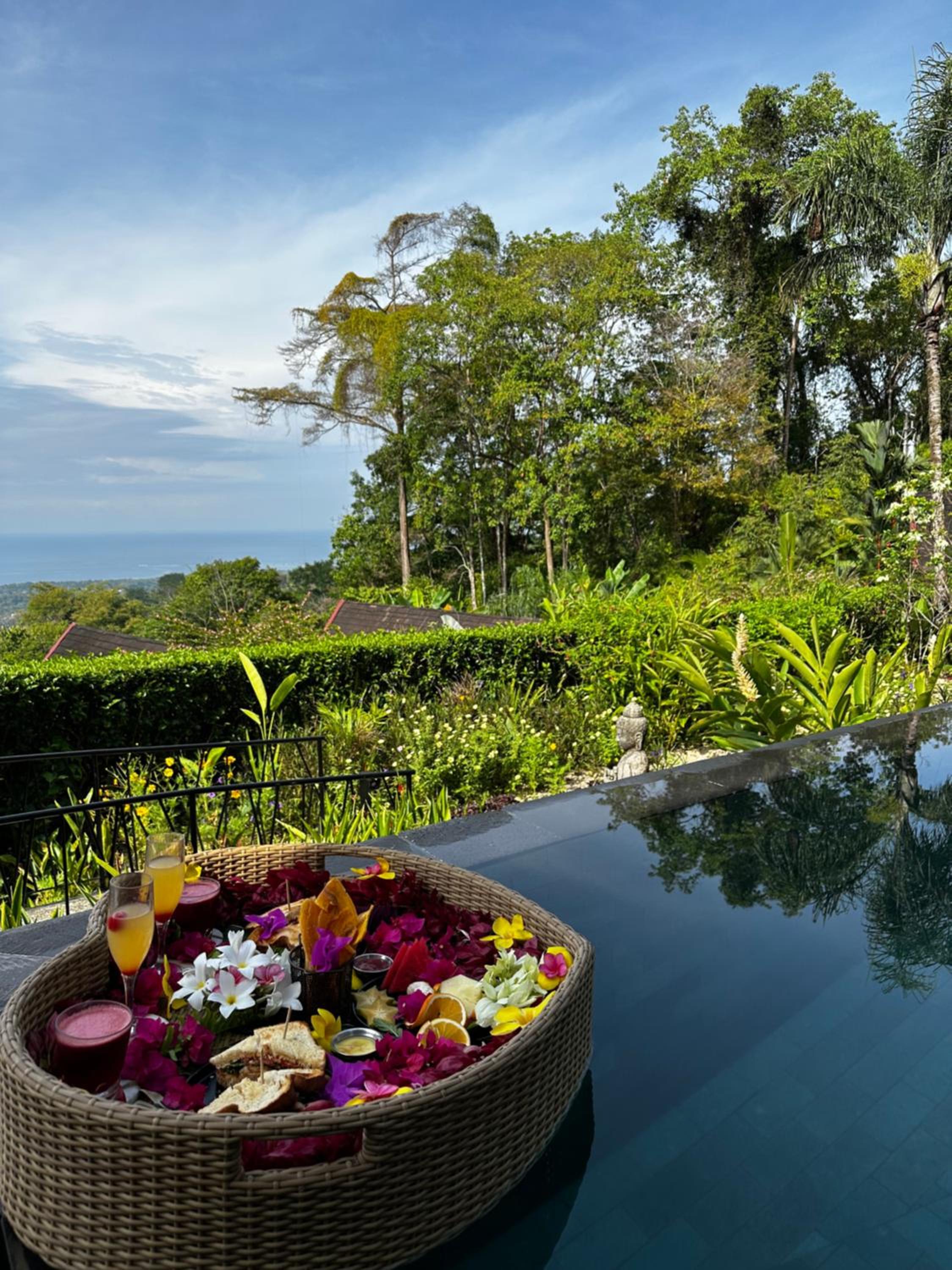 The glass villa concept is awesome, waking up surrounded by a botanical garden in a rain forest with the sounds of birds and howler-monkeys. Having an outdoor soaking bath became our nightly ritual. The place is chic, peaceful, immaculately clean, comfortable and thoughtfully cared for. The open plan concept is South Asian bale bengong gazebo with an infinity pool overlooking the Pacific Ocean and Cano Island.