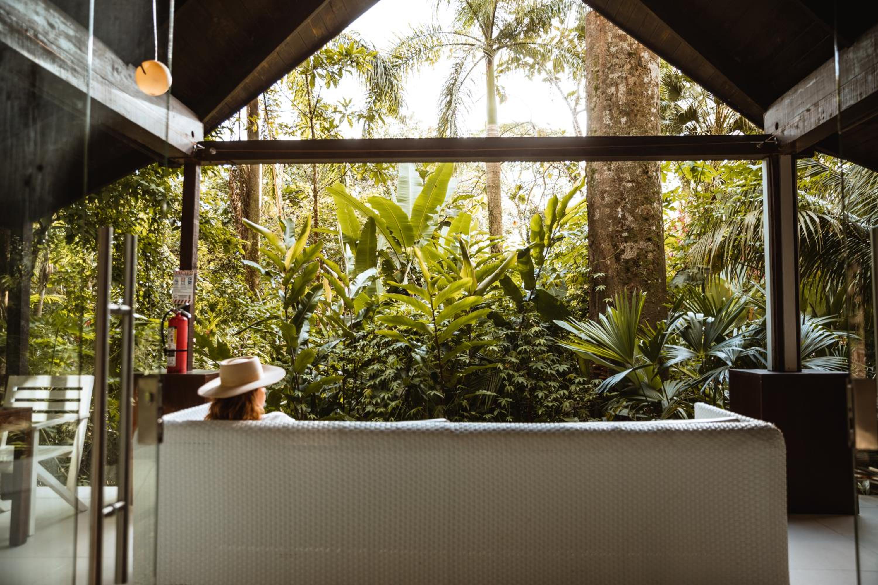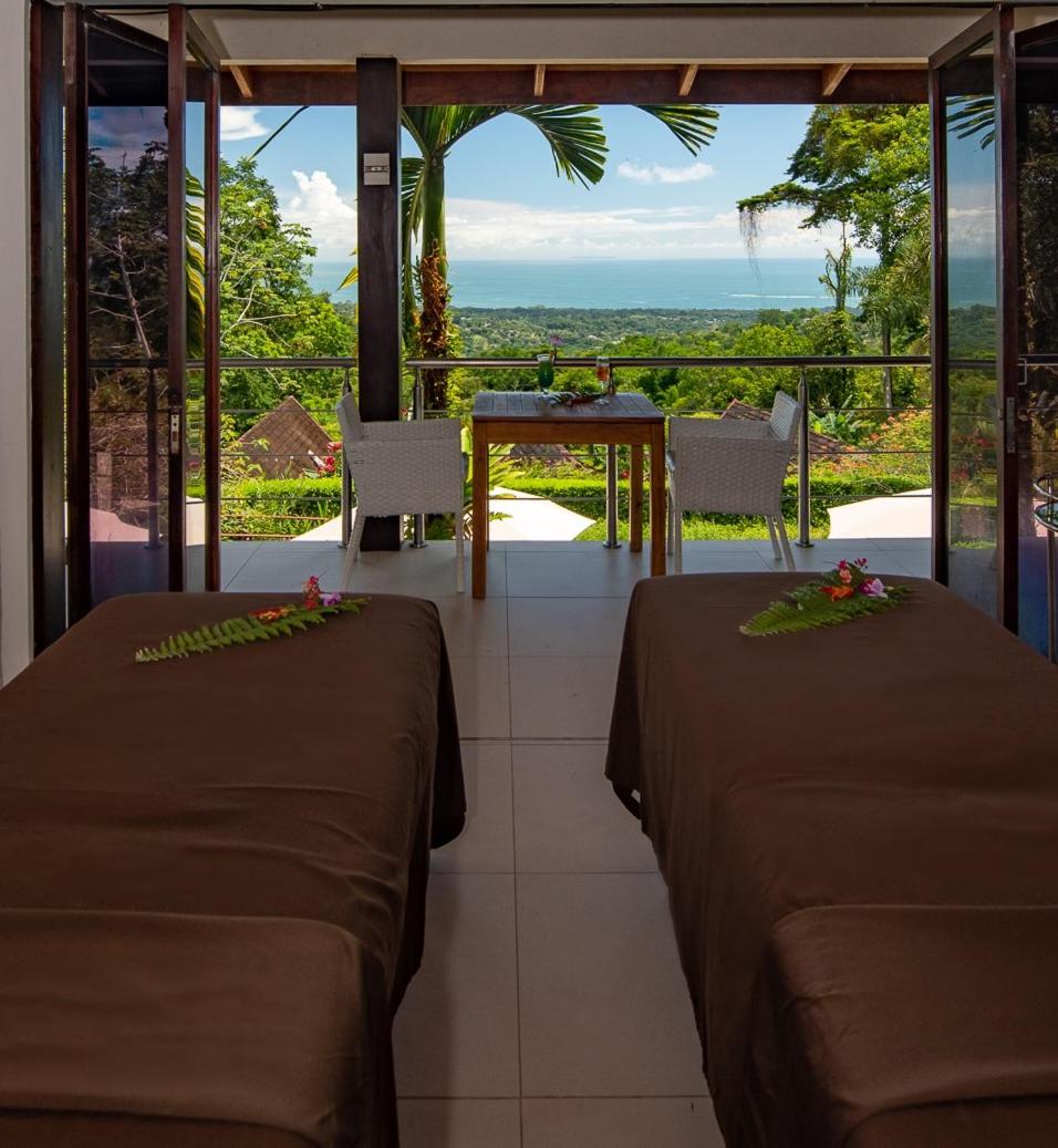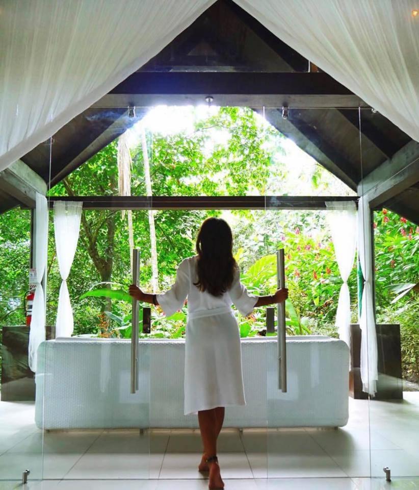 The glass villa concept is awesome, waking up surrounded by a botanical garden in a rain forest with the sounds of birds and howler-monkeys. Having an outdoor soaking bath became our nightly ritual. The place is chic, peaceful, immaculately clean, comfortable and thoughtfully cared for. The open plan concept is South Asian bale bengong gazebo with an infinity pool overlooking the Pacific Ocean and Cano Island.