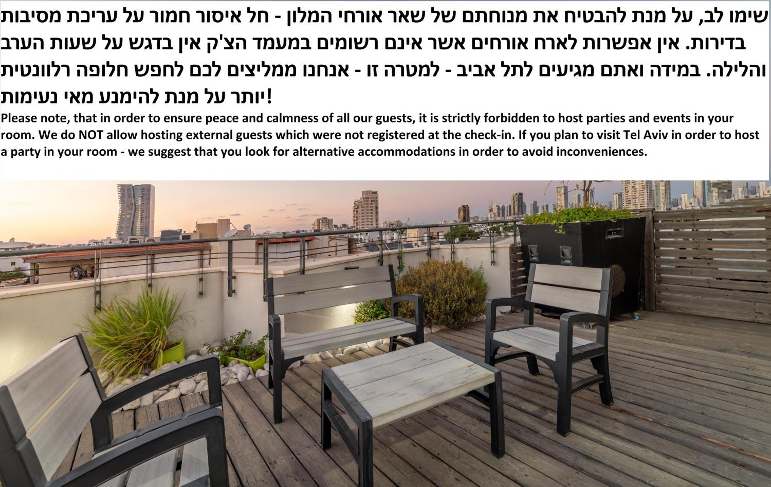 Our dedicated staff is on hand to assist with any needs, from tourist information to airport transfers. Start your day with breakfast at the on-site café or unwind on the rooftop terrace with stunning views of Dizengoff Street.