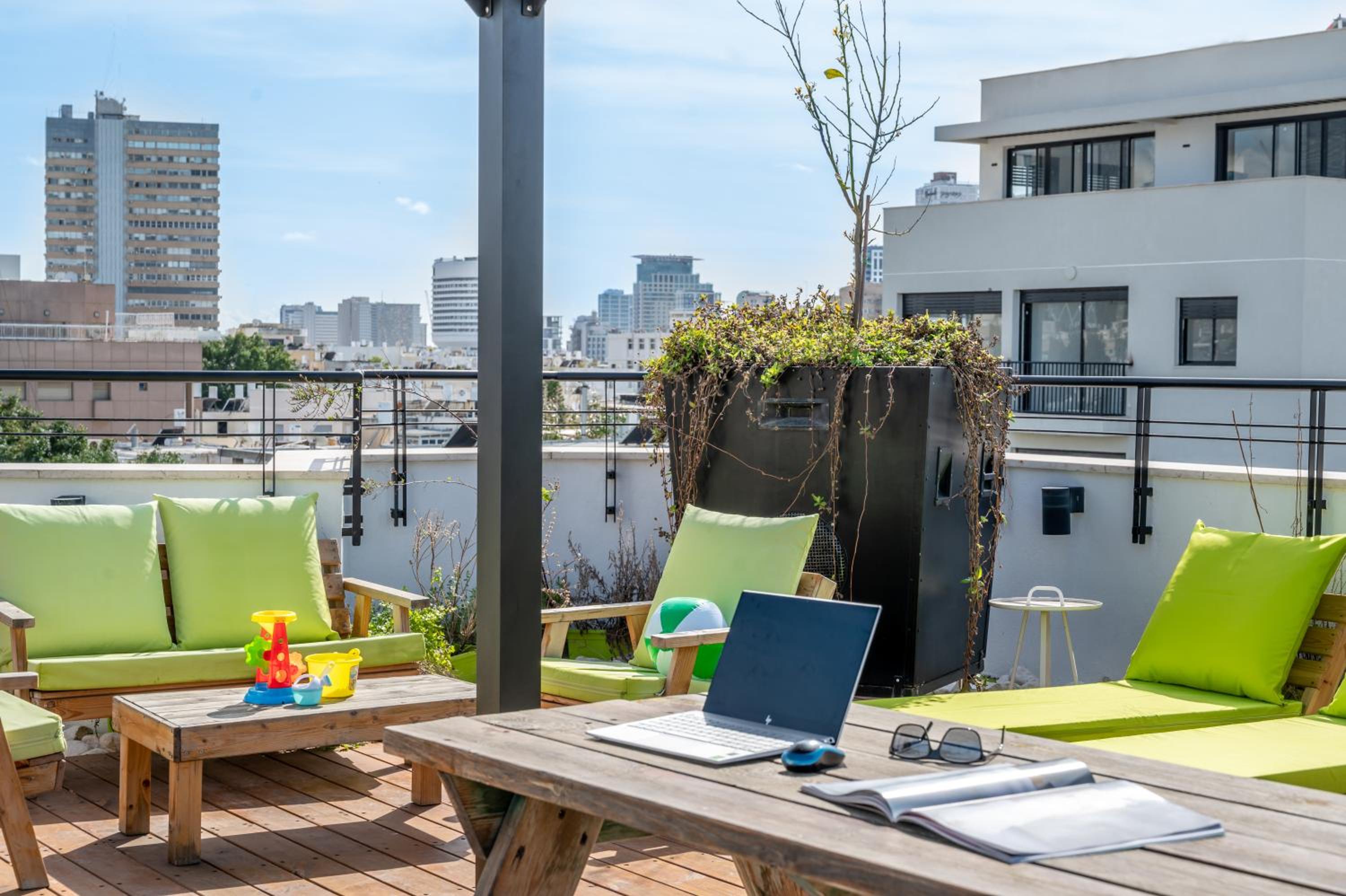 Terrasse avec belle vue sur Tel Aviv, ce doit être un endroit très agréable à la belle saison.