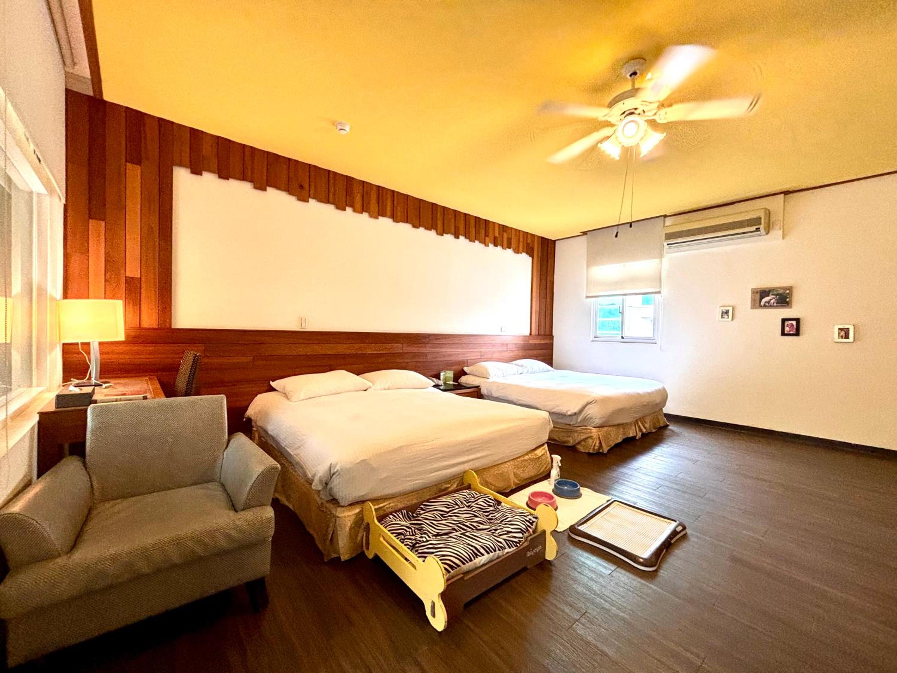1.房間門上方的走廊燈不亮,管理未注意。2.房內雖有木地板,但未清潔成需要脫鞋的狀態,且無其他櫃面平台,背包不敢放地上。3.廁所窄,只能斜坐使用,且地板不知何故,亮亮的非常滑,易摔跤。4.浴室地板靠近盥洗走道位置較低,積水。5.雖然是四人房,僅有一張椅子及90*45長條桌,所有活動都要坐在床上。