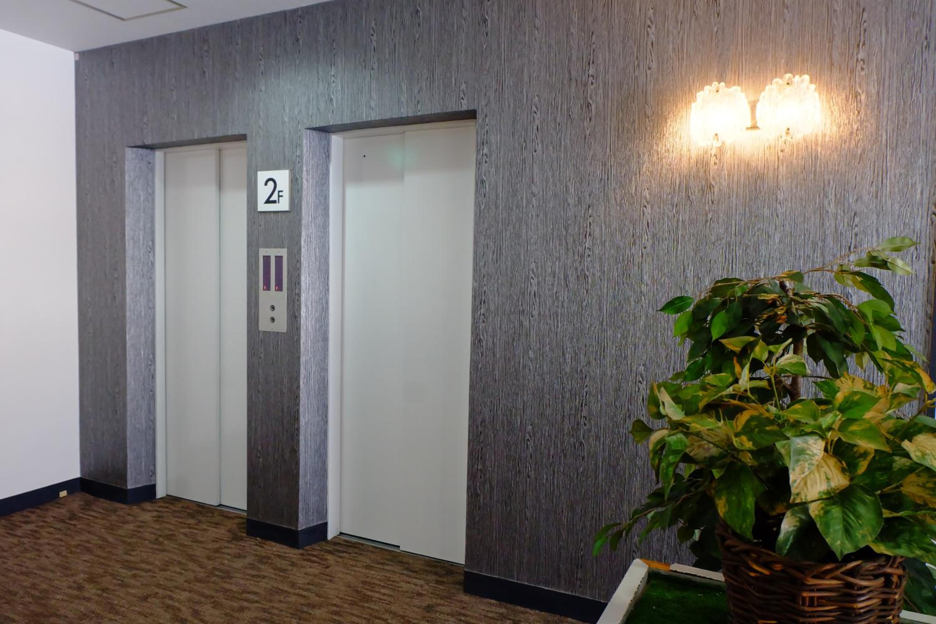 エレベーターの壁紙が剥がれたまま