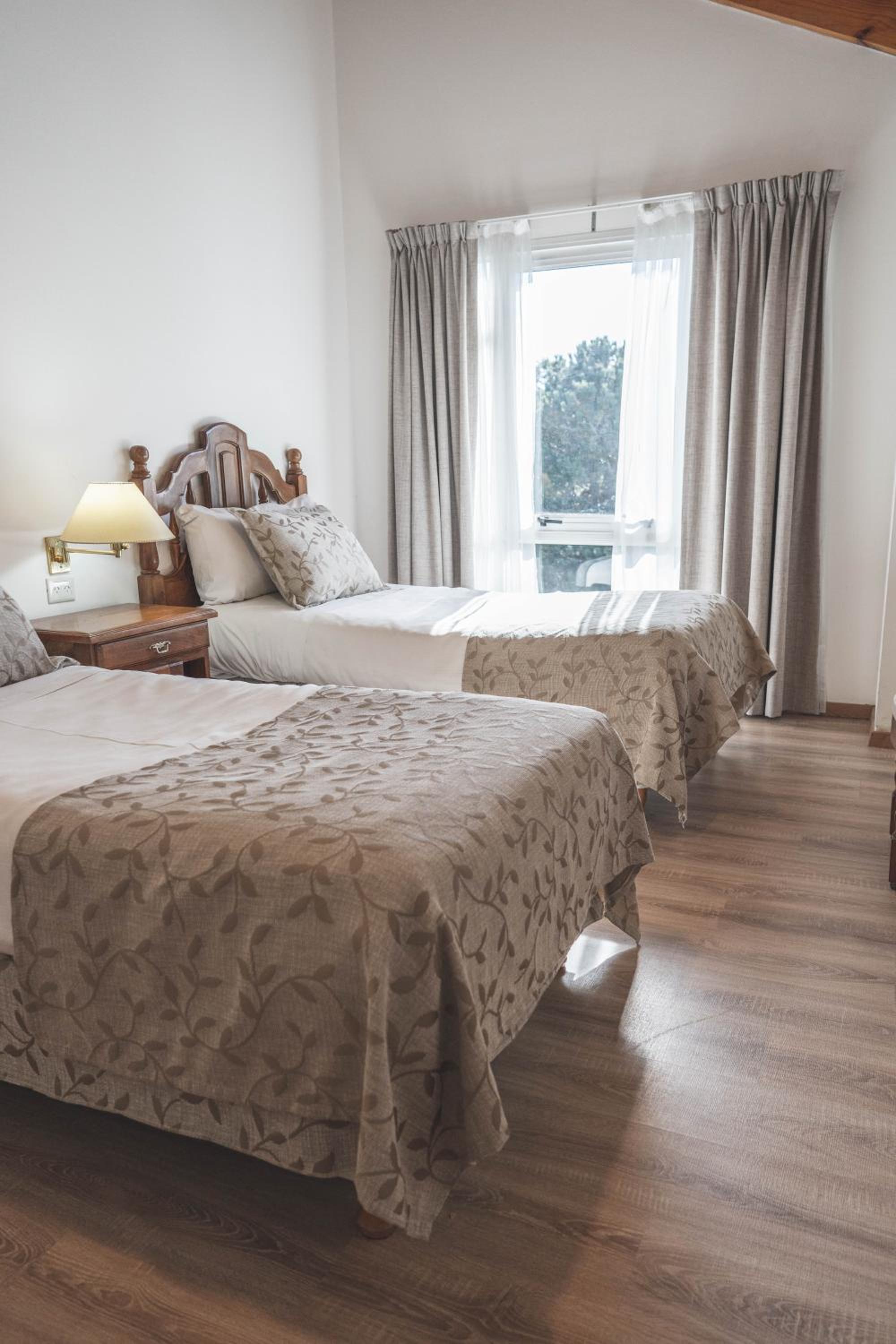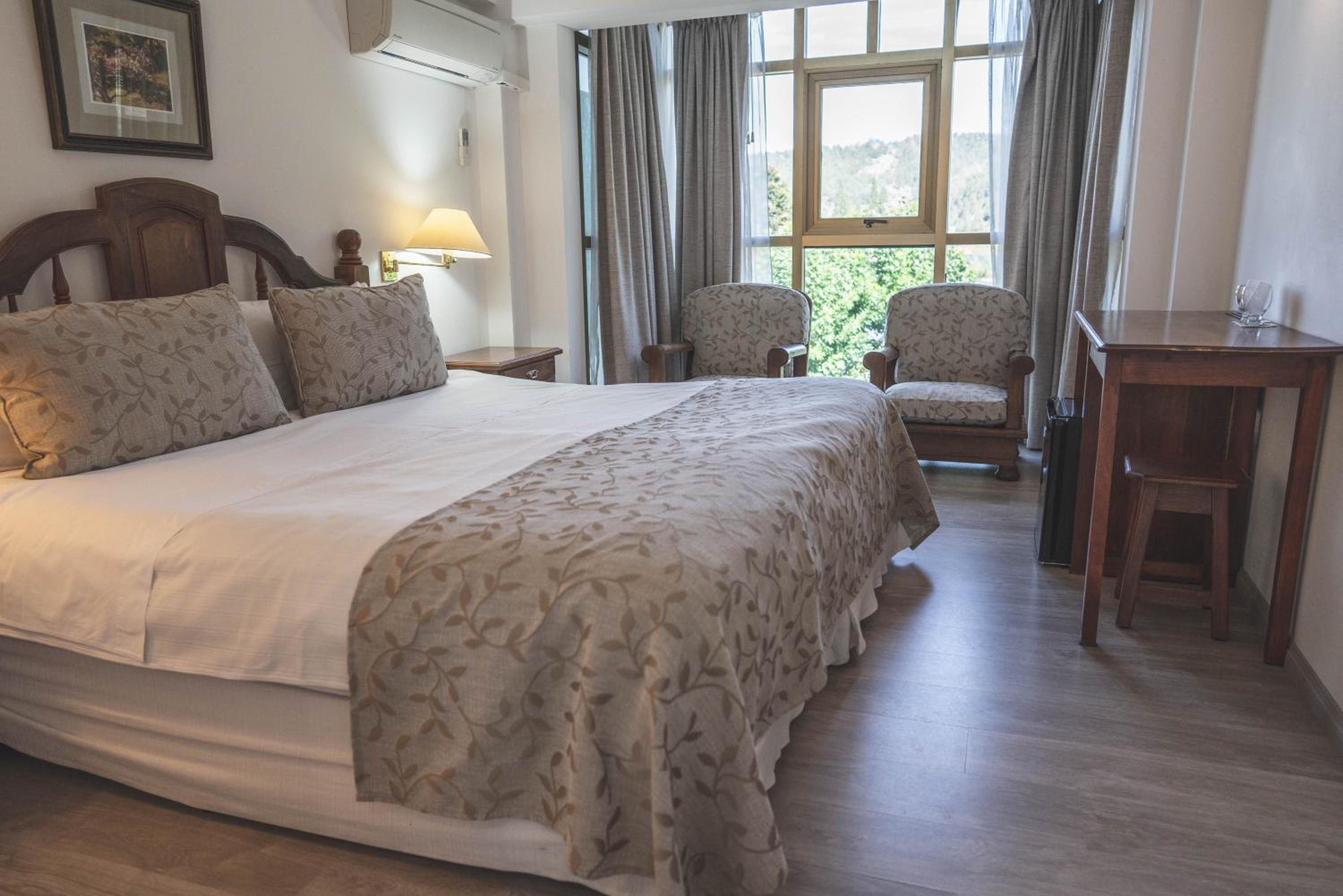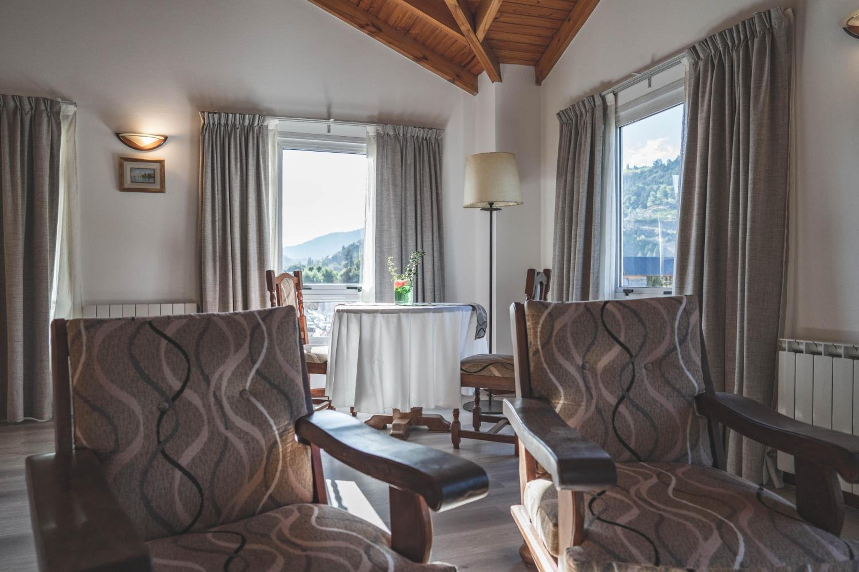 Rooms at the Hotel Patagonian Plaza are elegantly decorated in warm pastel colors, offering a cozy retreat with modern amenities such as heating, wooden furniture, and large windows for natural light.