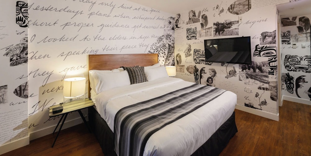 Beautiful art in rooms and public spaces. Friendly staff. Convenient location. Patronage directly supports critical work in Vancouver’s urban Indigenous community.