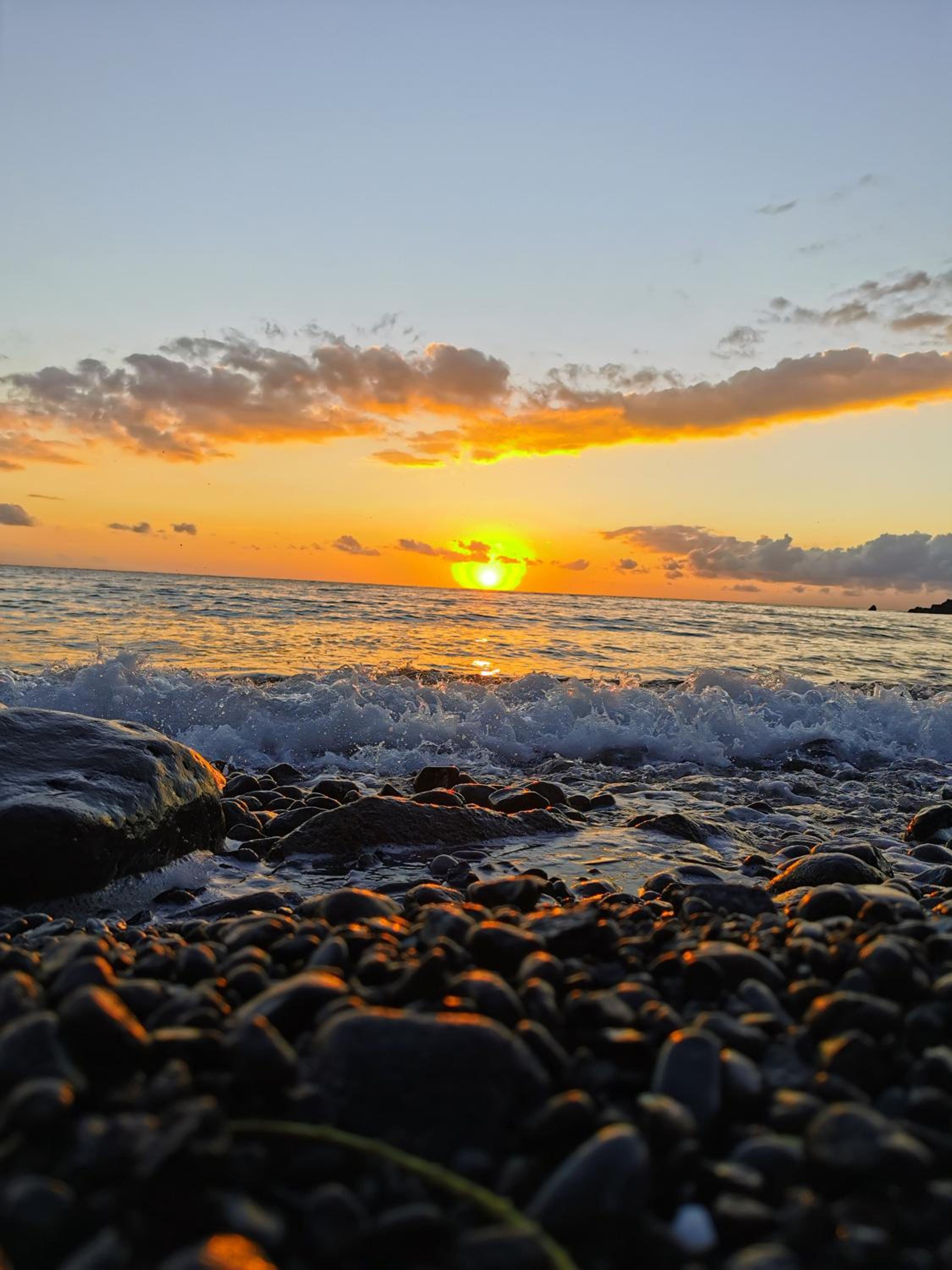 Het 'strand' bestaat uit ronde stenen, je kunt er niet gaan liggen (op de ligstoelen op het terras van het resort er vlak achter natuurlijk wel).