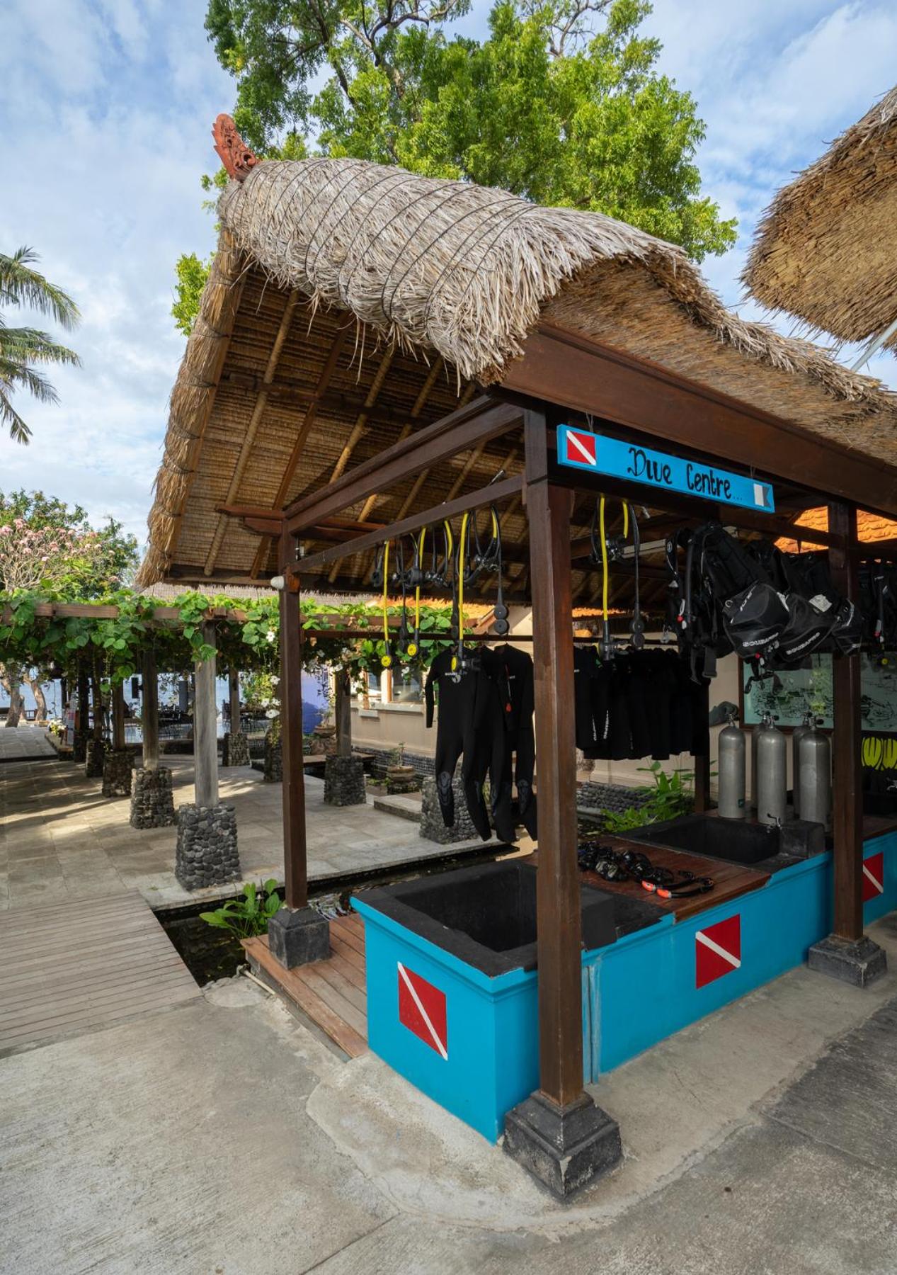 Staff was friendly and attentive. Accommodations were nice and clean, and the outdoor shower was great—good pressure and hot water. We paid to upgrade to a beachfront villa and loved it for its spaciousness and outdoor lounge area. We did six dives with their on-site dive centre and really enjoyed the convenience, options and dive guide. Reasonably priced diving, especially considering the low dive-to-guide ratio; most of our dives were just the two of us and the guide. Highly recommended for divers. We also found lots of cafes and restaurants we liked within walking distance, and small grocery stores for snacks and drinks.