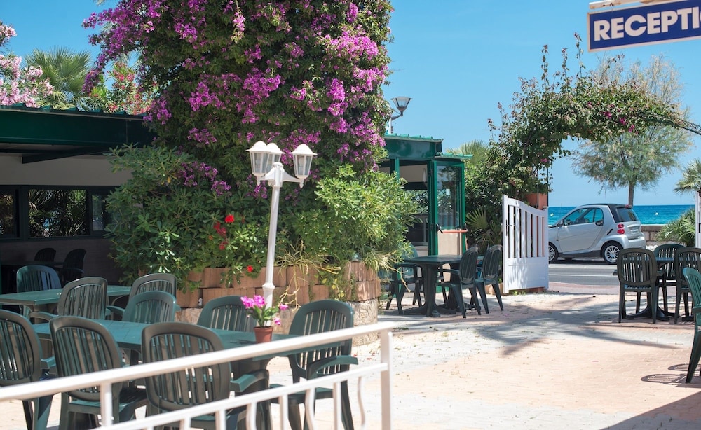Ich empfehle vom Bahnhof aus den Linken Ausgang zu nehmen, dann hat man einen kurzen Weg. Ich habe einen sehr netten Empfang erlebt. EZ in belletage zur Bergseite war ganz nach meinem Geschmack. Schattenseite, Garten im Fenster. Tolles Bett, grosses Fenster, leise Klimaanlage (kann man selber ein- und ausschalten). Excellente Sauberkeit, wofür täglich von 7 Uhr morgens bis 13:30 lautstark eine Horde von Zimmerfrauen sorgt und massiv die Ruhe stört, drinnen und draussen. Um 7 Uhr morgens mit Wasserstrahl die Steinplatten im Hof und Hauswaende unbeirrt abputzen?!! Man konnte sich an Strand retten. Leute, die Ihre Zimmer - wie auf Hotelfotos- mit Meerblick haben, haben auch Restaurant "Snackbar" unten, 12 Tische zzgl. Frühstücksterrasse.