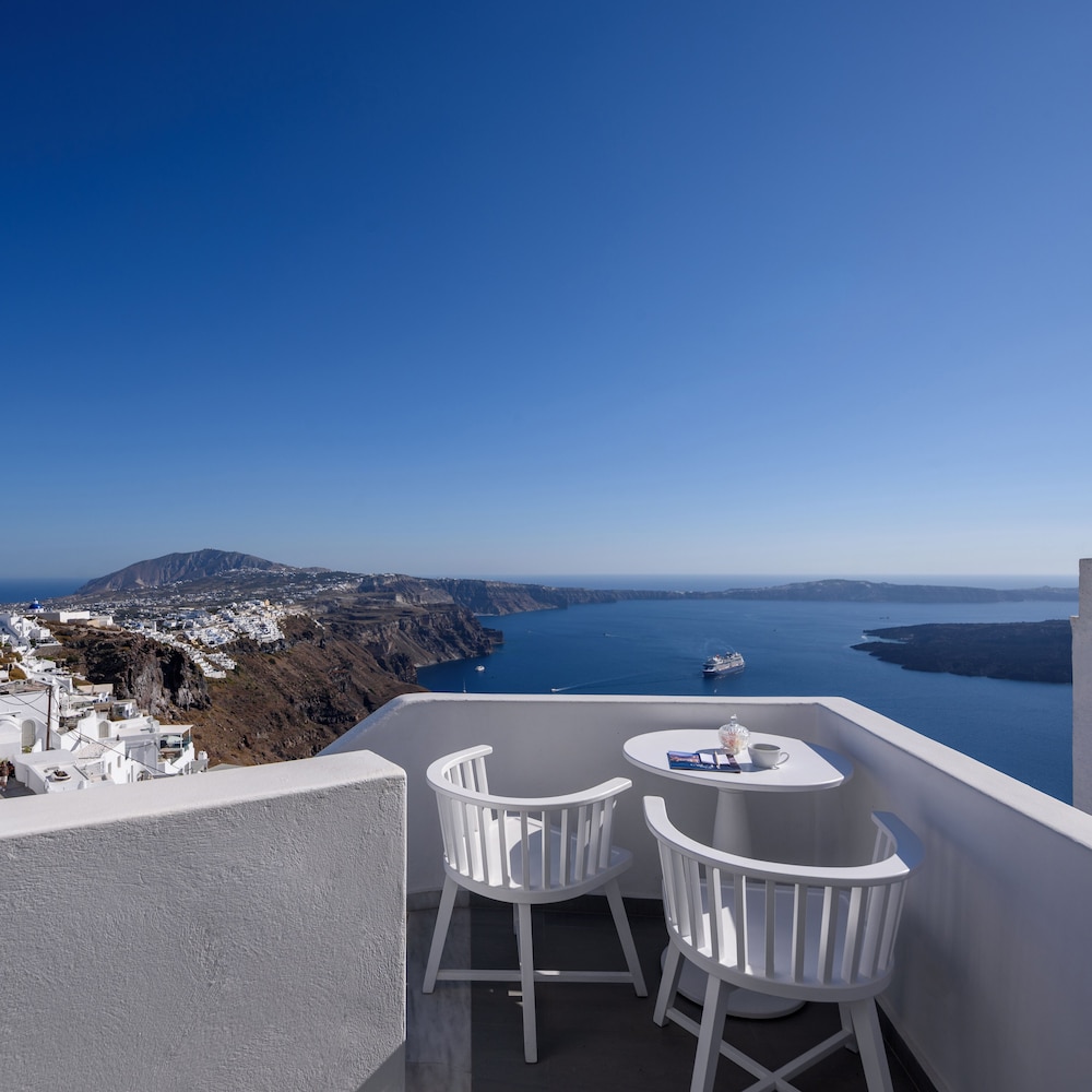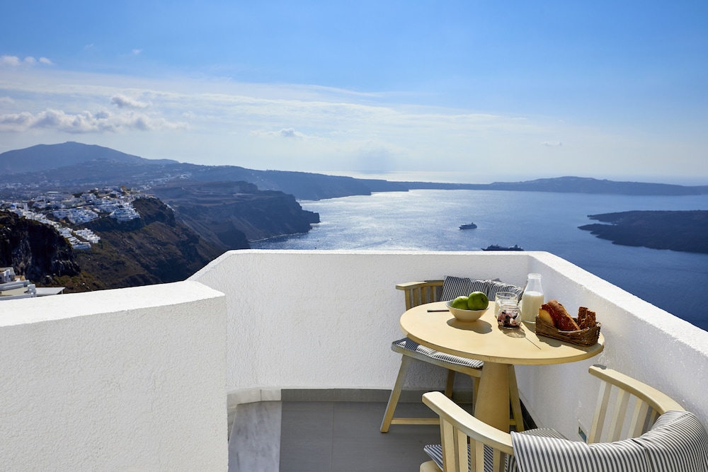 The view from our balcony was amazing, as you get a view of all the white buildings, the caldera and the Aegean Sea. The balcony is not ground level, but up just a few stairs outside of the room. Breakfast is delivered in a box each morning to your room. We enjoyed it each morning on the balcony which was amazing with the views.