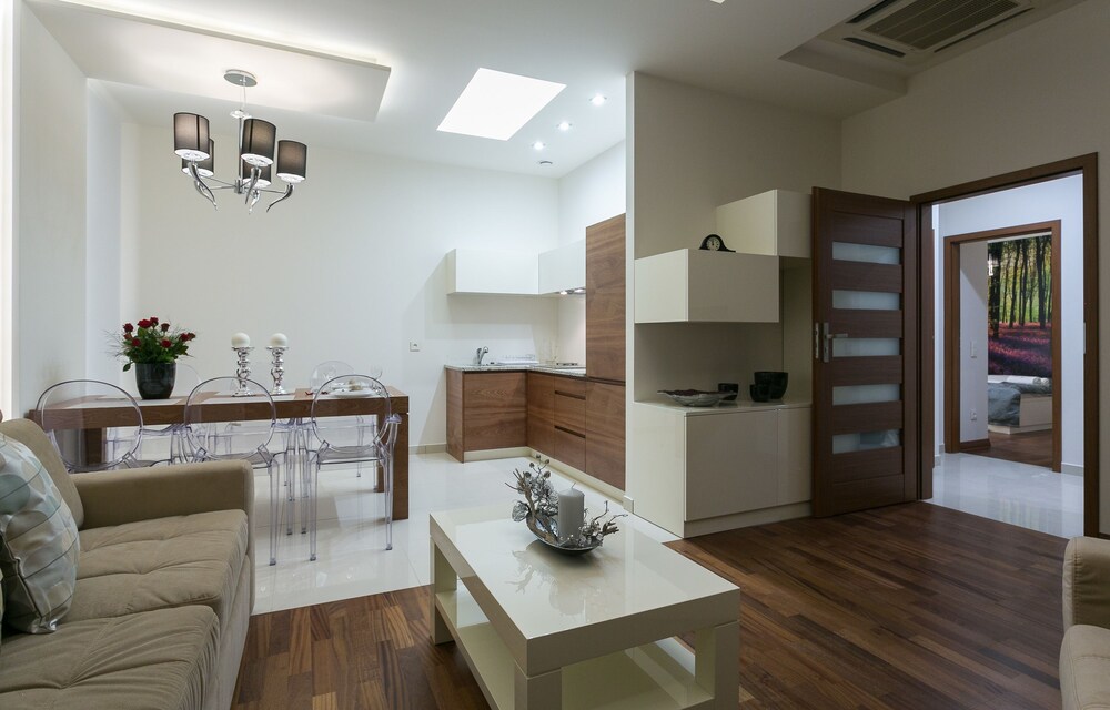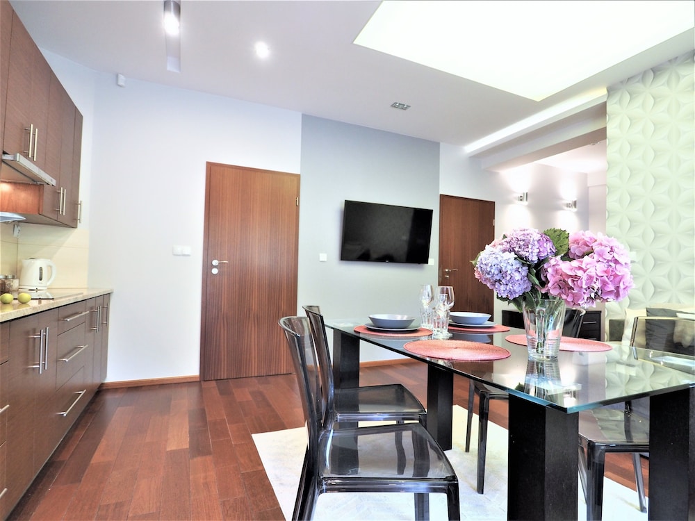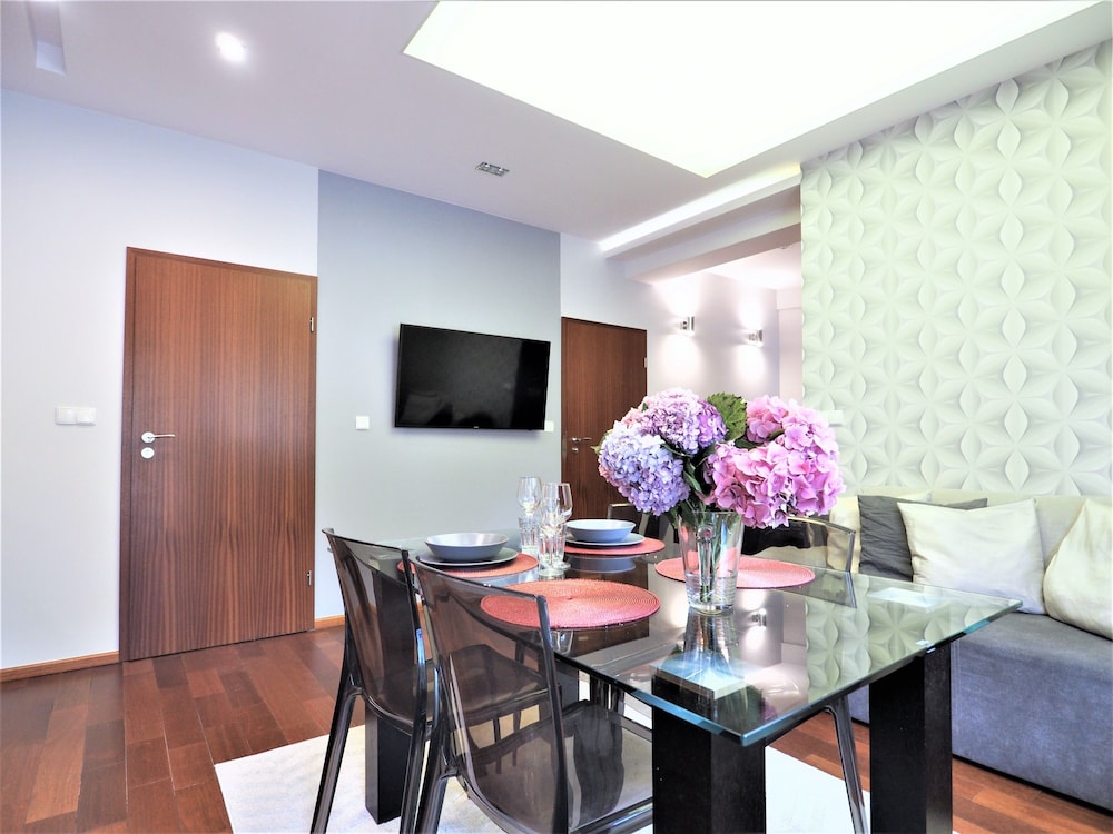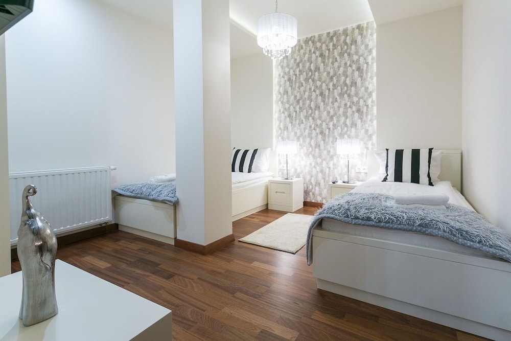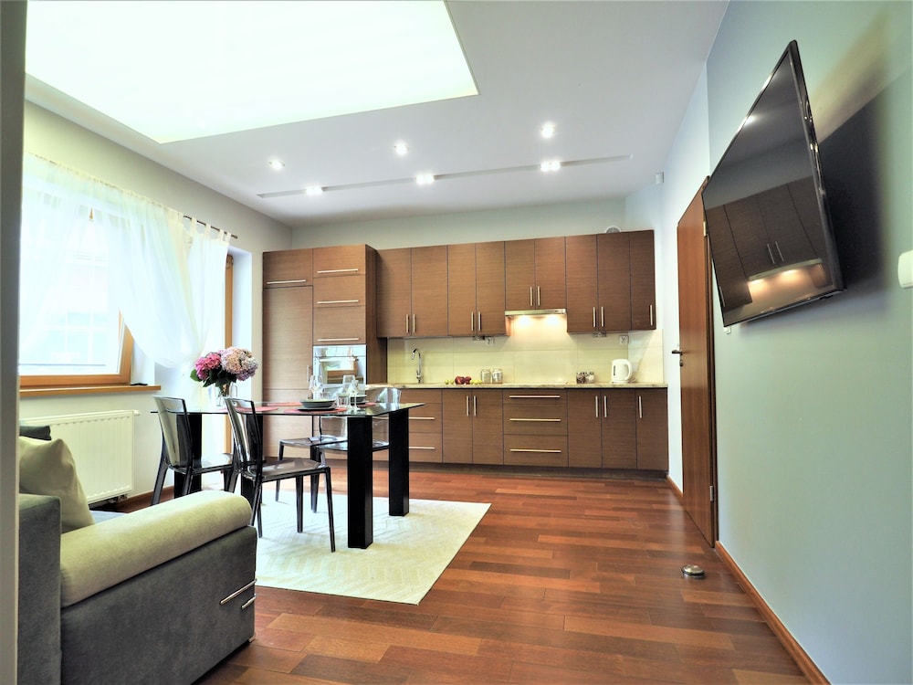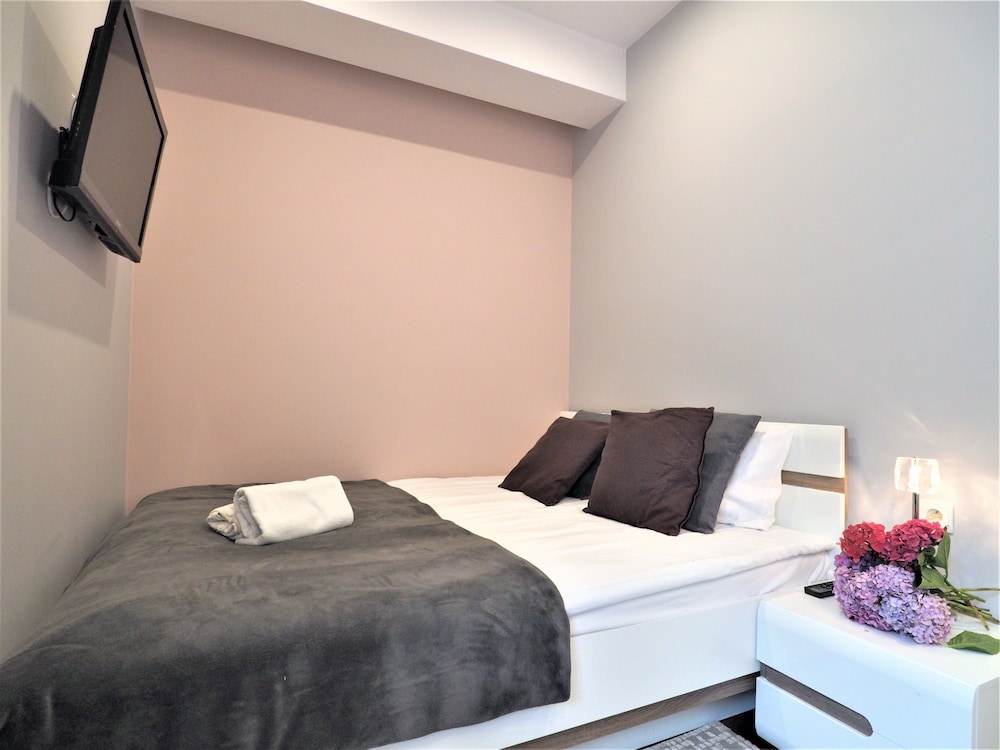 The apartments were modern, stylish spacious and very clean. There are no staff on reception but staff were very helpful when booking and organised an airport transfer for us. We couldn't find a travel adapter in local shops for our phone chargers and a member of staff very kindly brought us in a loan of one for home. We were due to check out at 11am but were not being picked up till 6pm staff also kindly left us keep 1 of our apartments till we were picked up :-) They are within walking distance to Krupowki Street, lots of lovely bars and restaurants near-by.