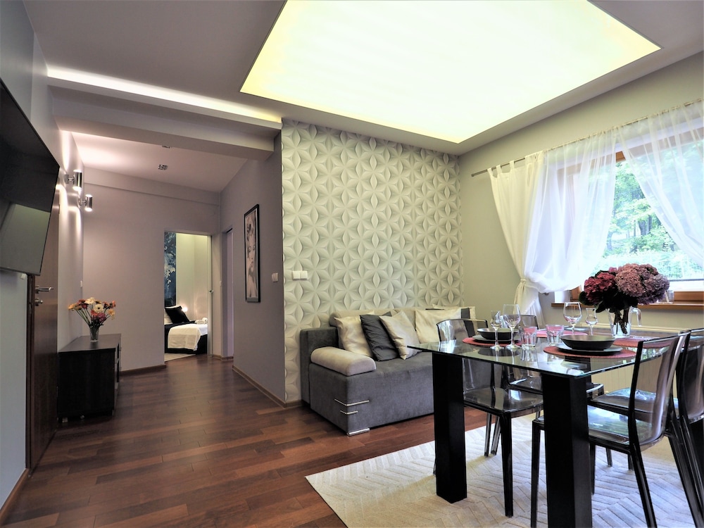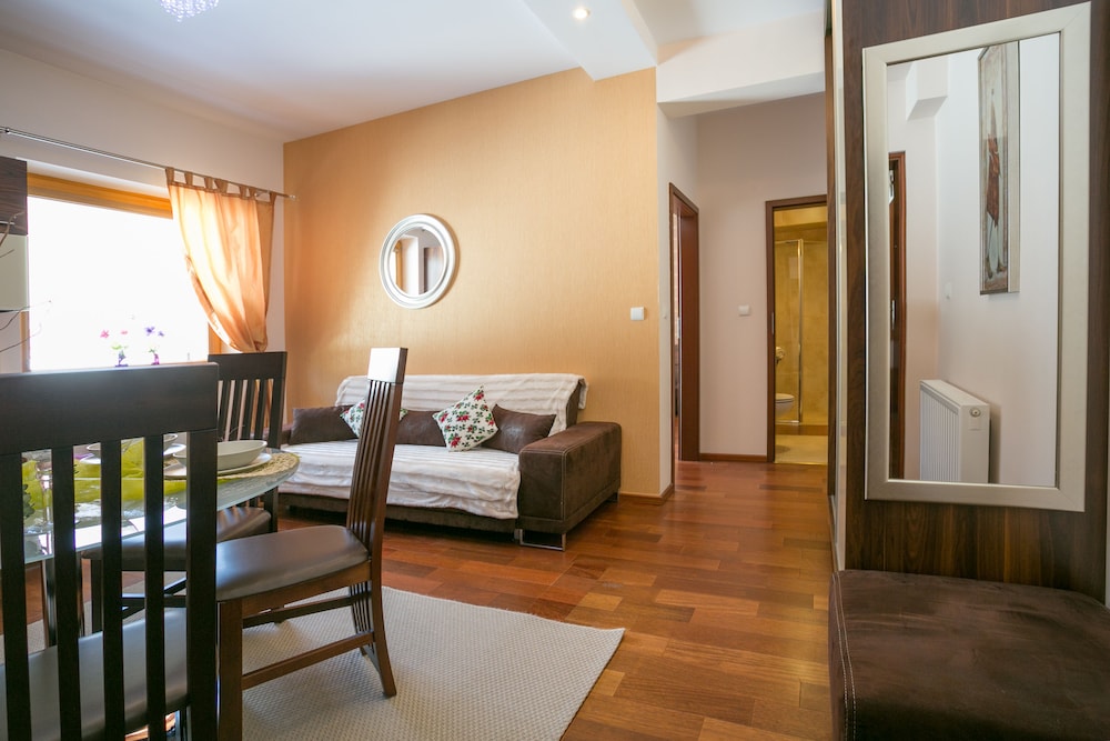 Apartamenty niby OK ale... pobyt był w lutym, parking nie odśnieżony więc problemy z zaparkowaniem. Czystość pokoi łazienek a przede wszystkim naczyń w skali do 5 jedyne 2 pkt. W łazience zatkana kratka ściekowa, po 5 minutach prysznicu woda zalewała całą łazienkę. Pani właścicielka "niby" bardzo miła. forma płatności miała być gotówkowa jednak bez poinformowania mnie ściągnęła sobie paniusia z karty gdzie dodatkowo doliczyła 50 zł za końcowe sprzątanie!!!!!!!!!! Jakie sprzątanie jak taki wielki bałagan zastaliśmy!!!! Samo położenie apartamentów jest OK, basen OK, Sauna OK