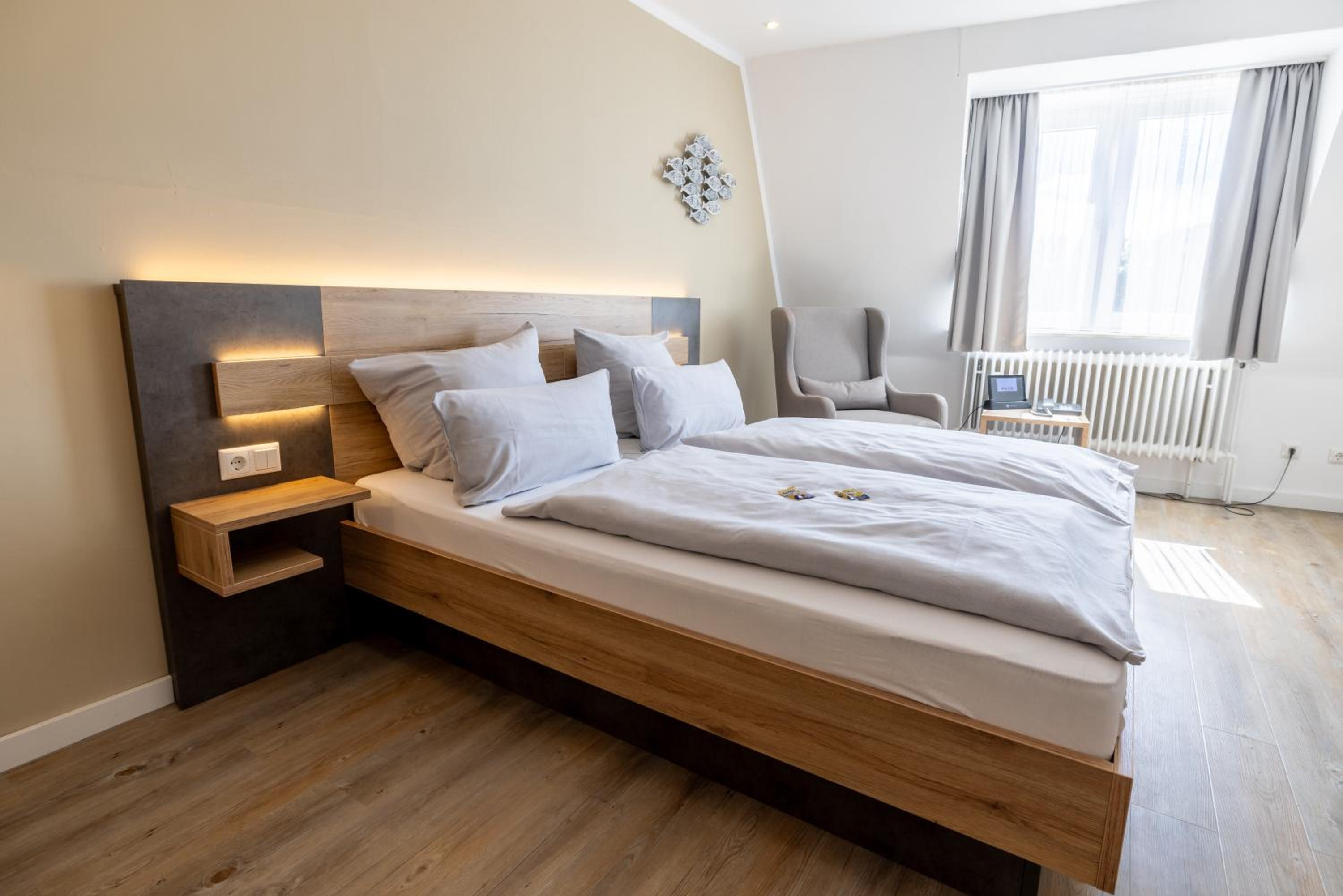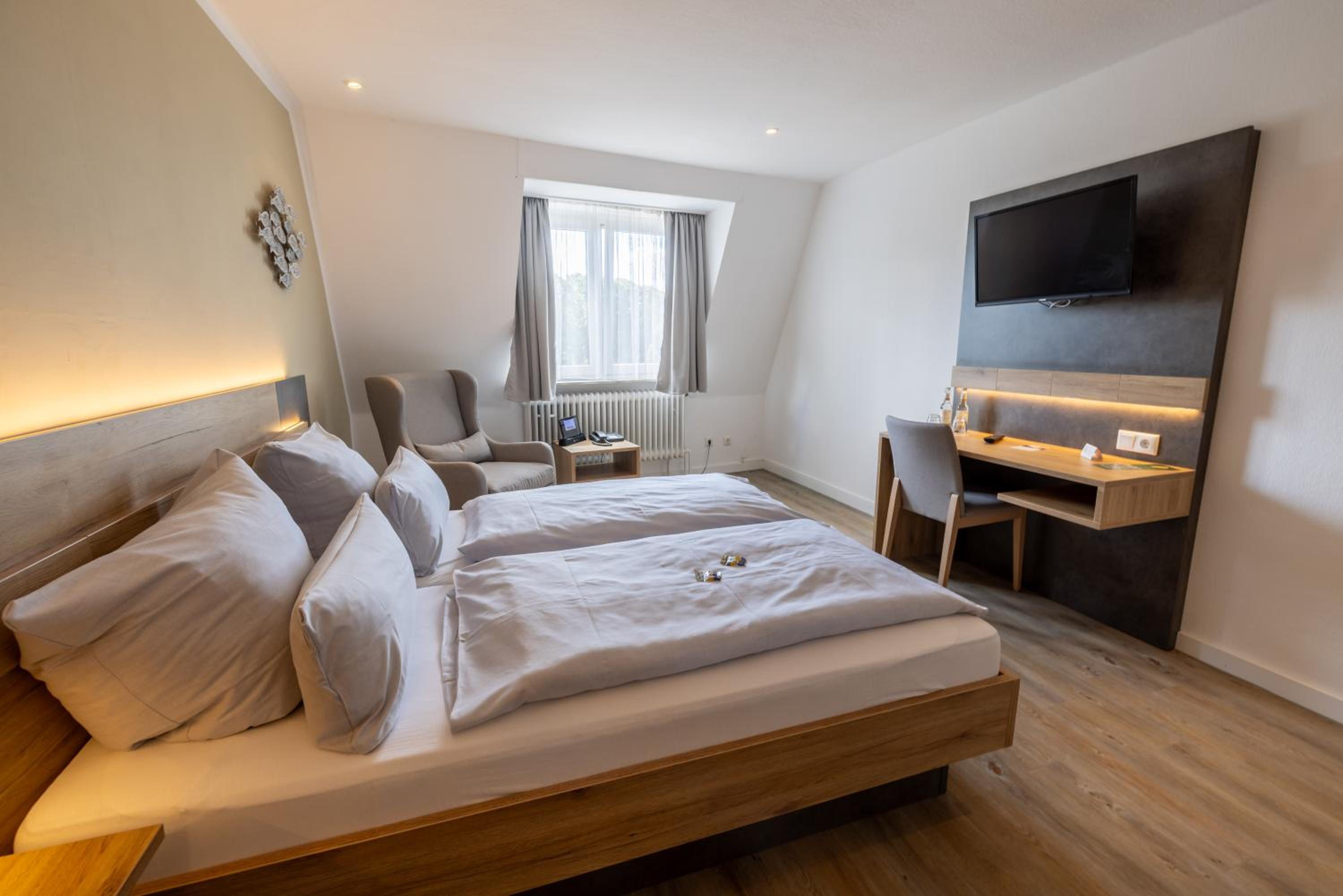 Peaceful Rooms with Traditional Decor: Hotel Lüttje Burg offers bright rooms adorned with solid wooden furniture, providing a tranquil atmosphere. Each room includes modern amenities like cable TV and a private bathroom.