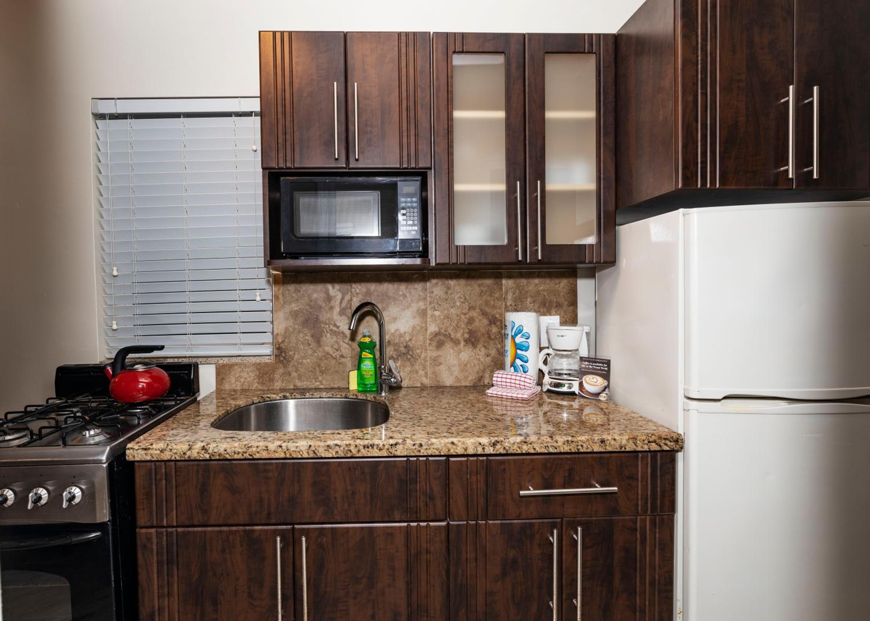No in room coffee. Self check in after hours, very difficult to find office to get key and to find room. Room is tiny but has a kitchen