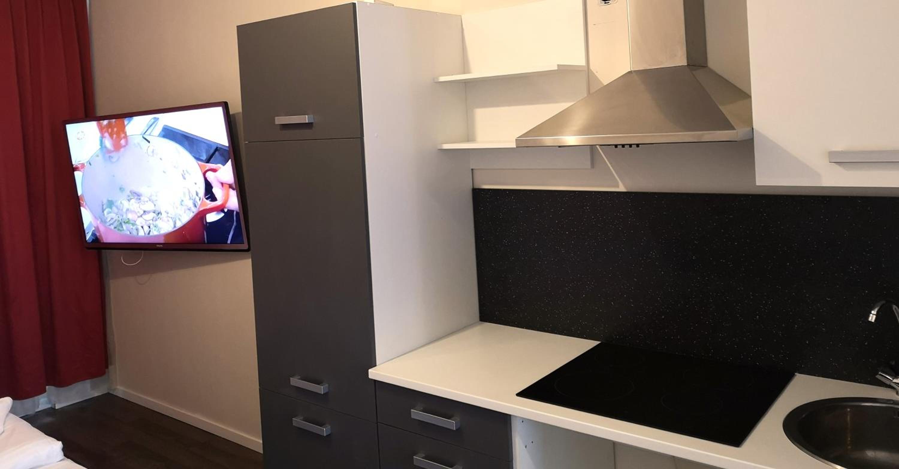 The room was comparably cheap and good to reach using public transport.