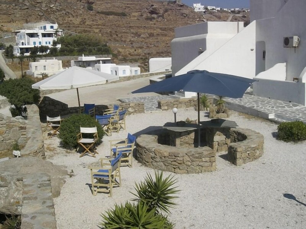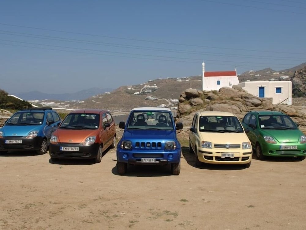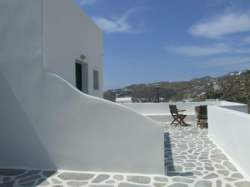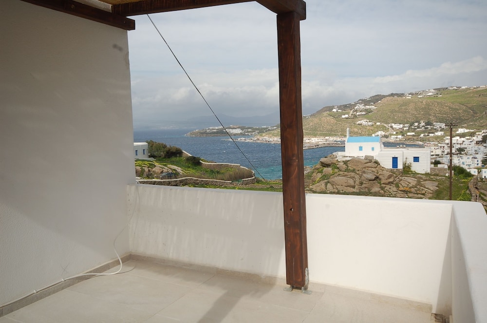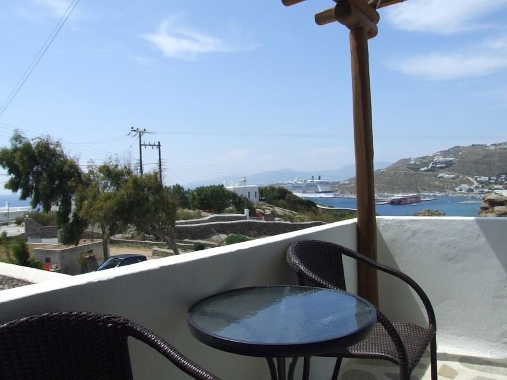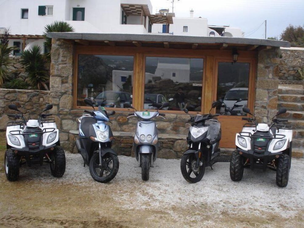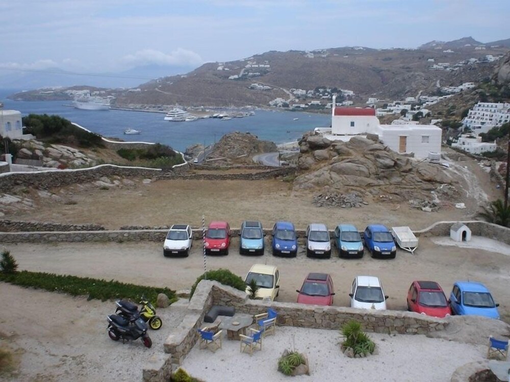 Studio was spacious. Hotel in quiet area but only 5 minute drive to grocery store and Mykonos waterfront action. Has car/motorbike rental.