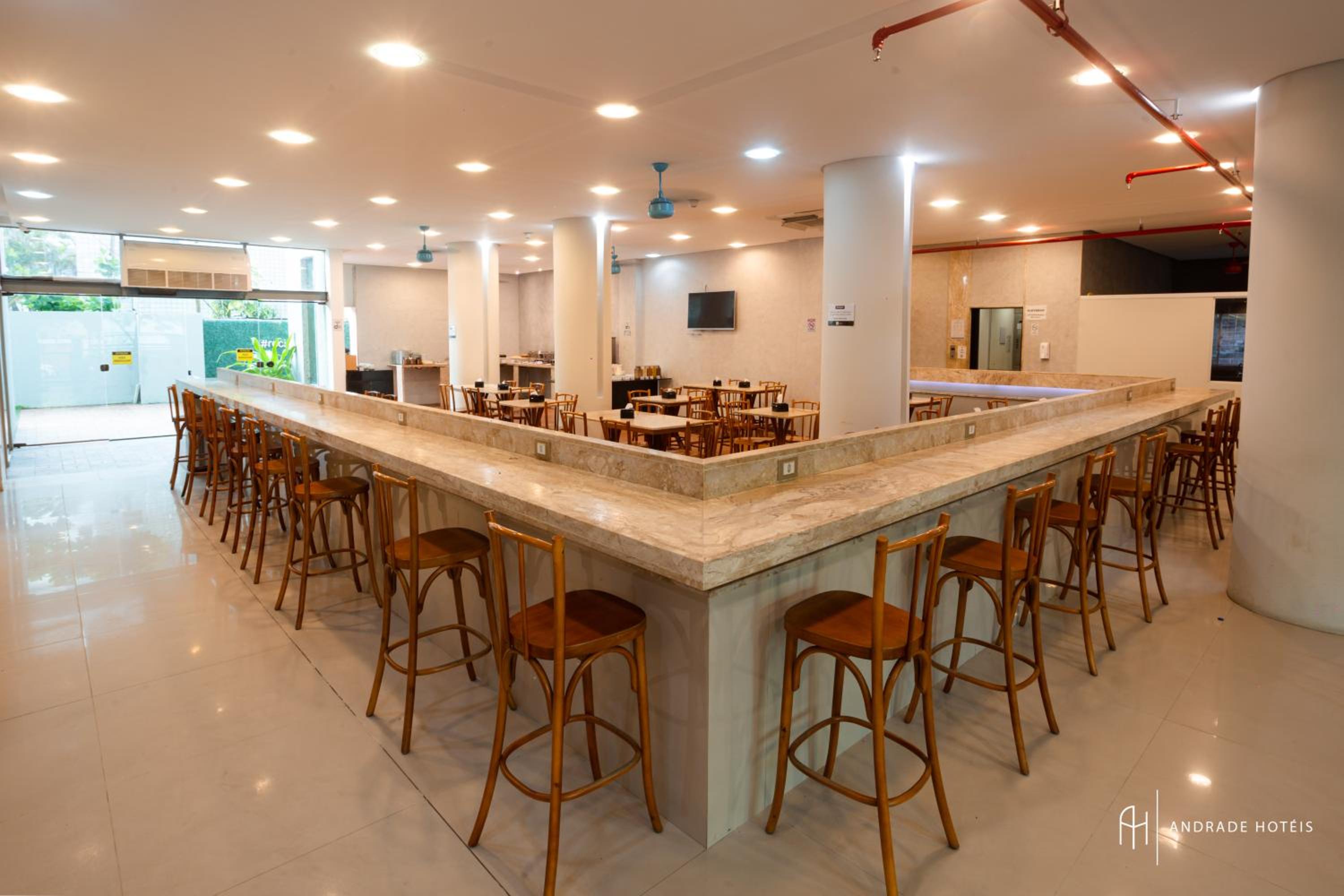 Apenas 1 estacionamento e o cliente precisa pagar para estacionar. Apesar do espaço do cafe ser grande, o cafe da manhã não tem variedade de opções sendo bem simples pra um hotel tão grande. O ar-condicionado do quarto para 3 pessoas que fiquei não gelava, estava no 17 e parecia estar no 23.