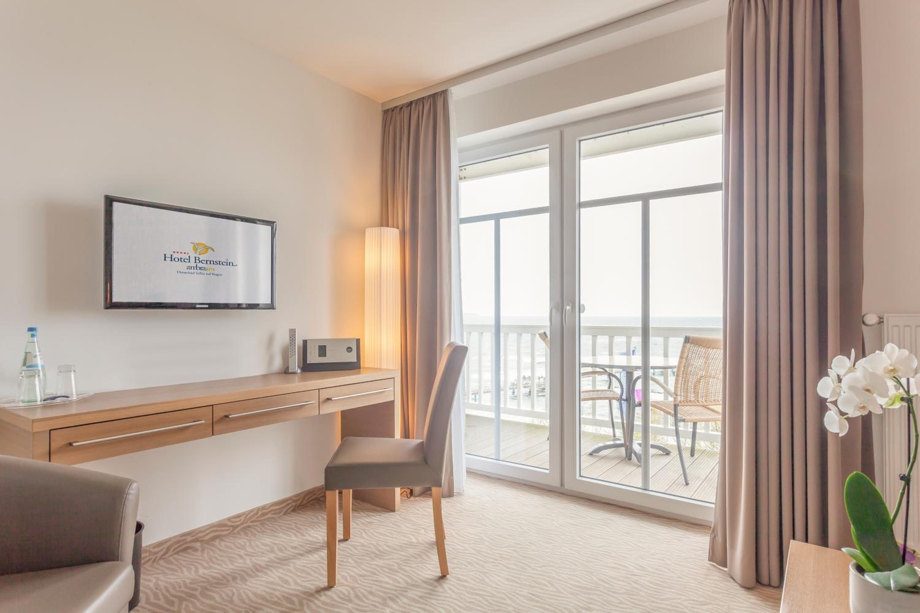 Each room at Hotel Bernstein is a haven of comfort, featuring private bathrooms, bathrobes, TVs, and expansive windows offering breathtaking views of the sea. The rooms are adorned with soothing pastel tones and tasteful light wooden furnishings.