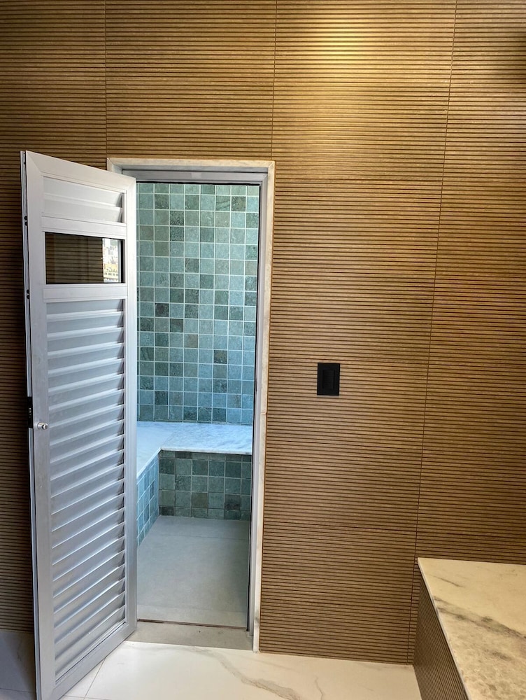 O hotel possui uma pequena sauna á vapor, piscina e academia.