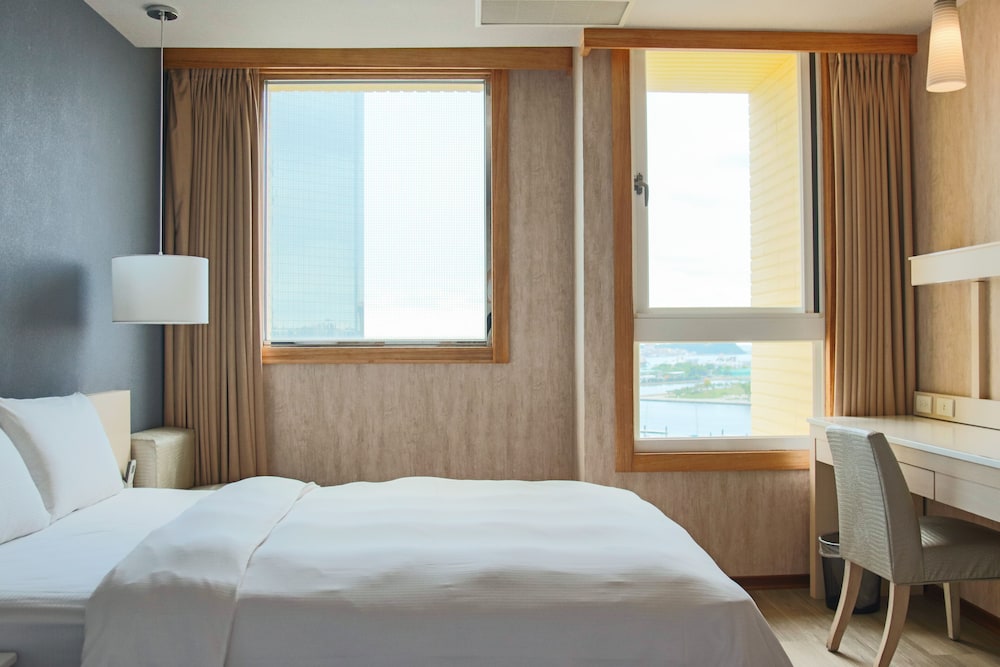 地點離輕軌站2分鐘,很方便。有免費停車場(先到先有,位子有限)。櫃台免費升等面向海港房間,很棒。1樓大廳也提供輕食/飲料。