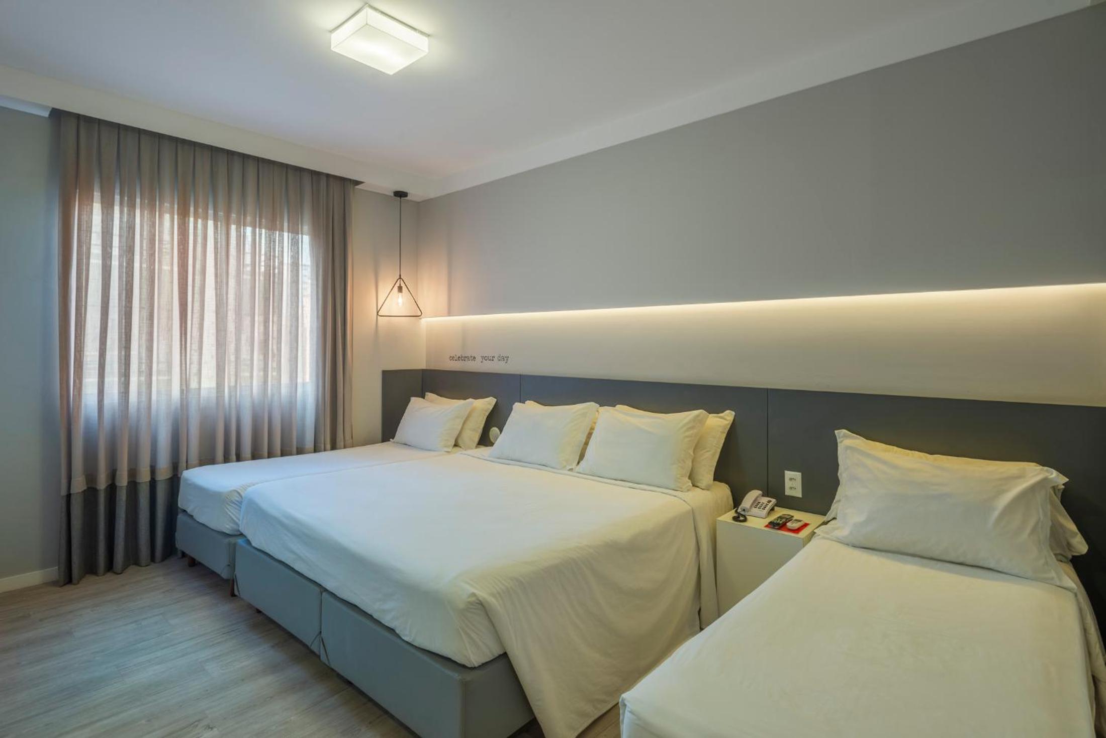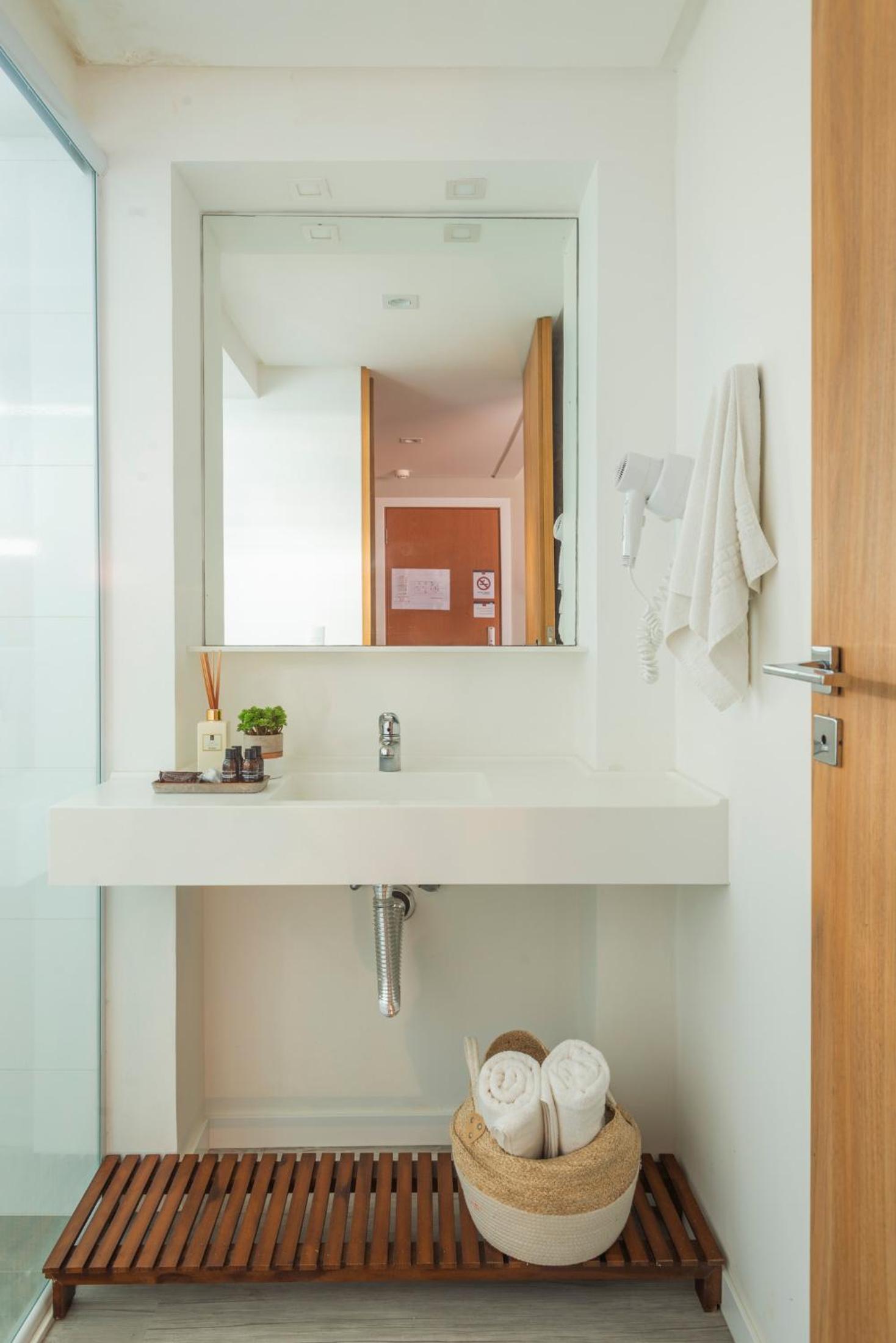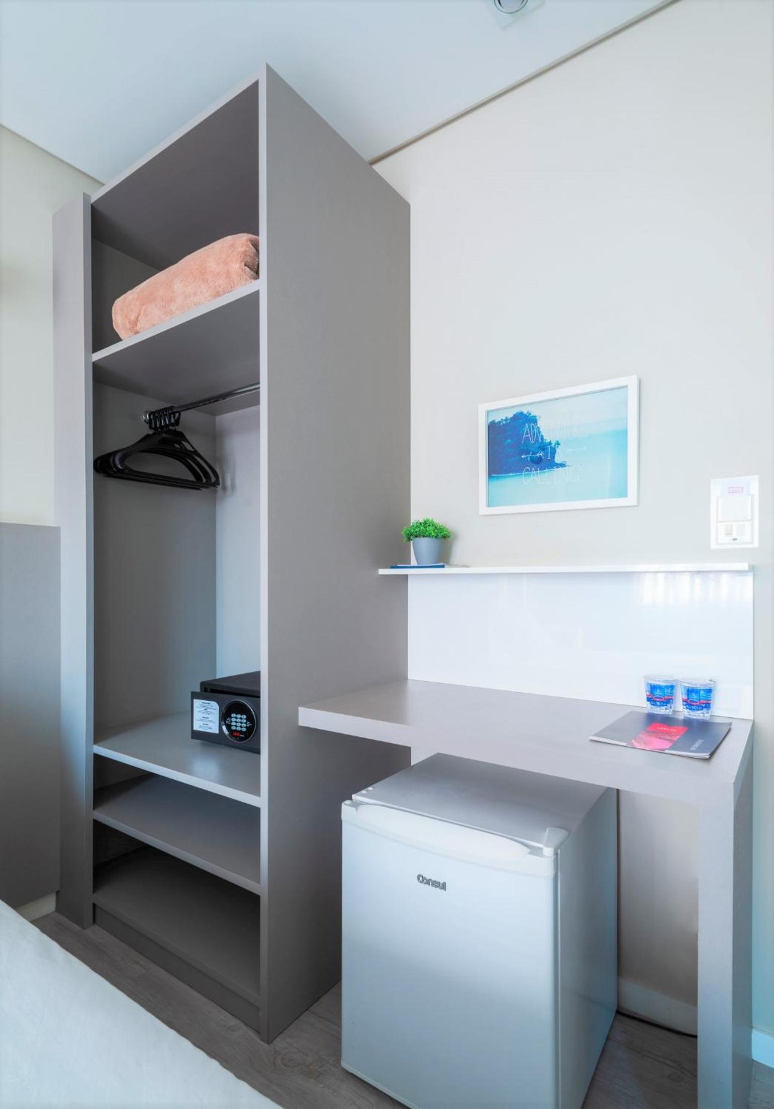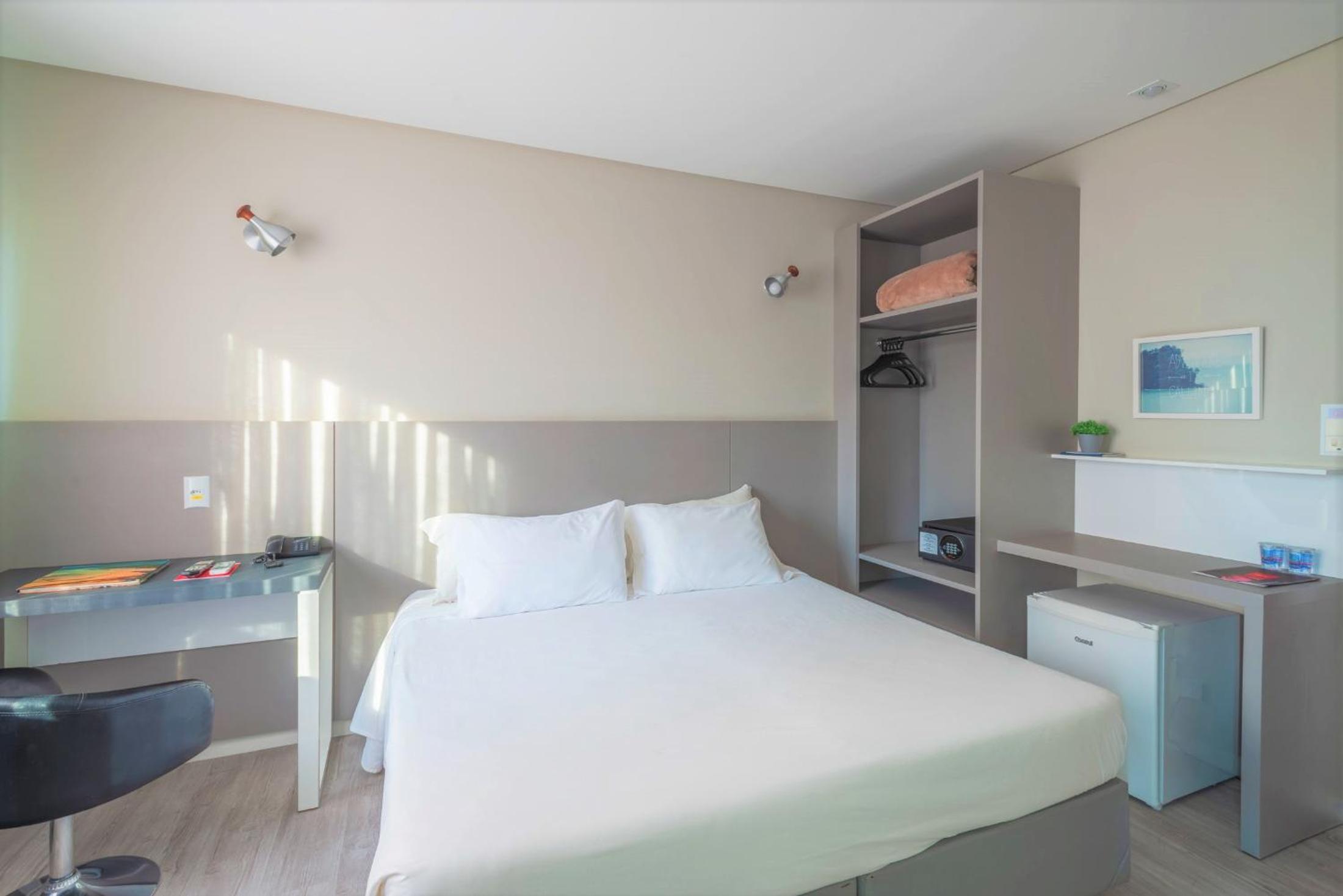 O quarto é perfeito, som ambiente, iluminação agradável e com opções, espelho corpo inteiro, bancada, e claro os mais importantes lençol, colchão e chuveiro muito bons !