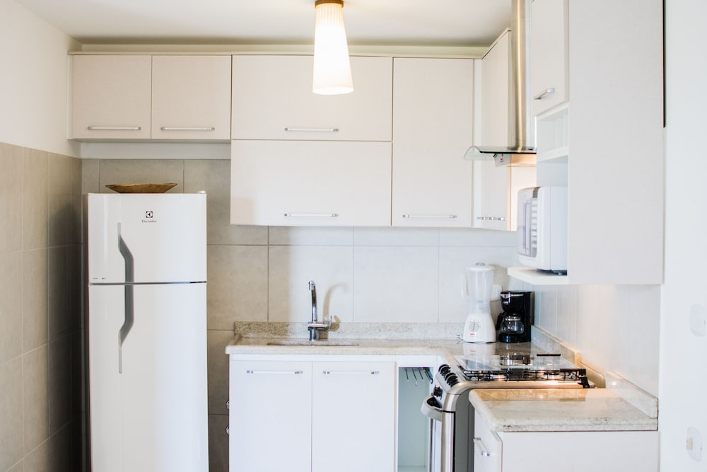 apartamento com cozinha, micro-ondas, geladeira e vários utensílios para preparo de refeições. Camas confortáveis e chuveiros bons. Café da manha muito bom, com grande variedades de pães, frutas, frios e salgados. Tapioca e omelete eram preparados na hora.
