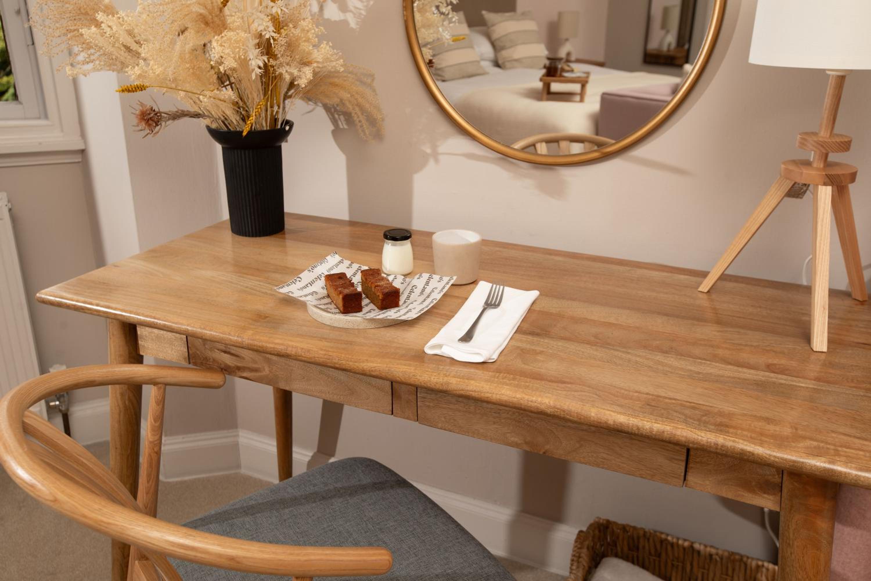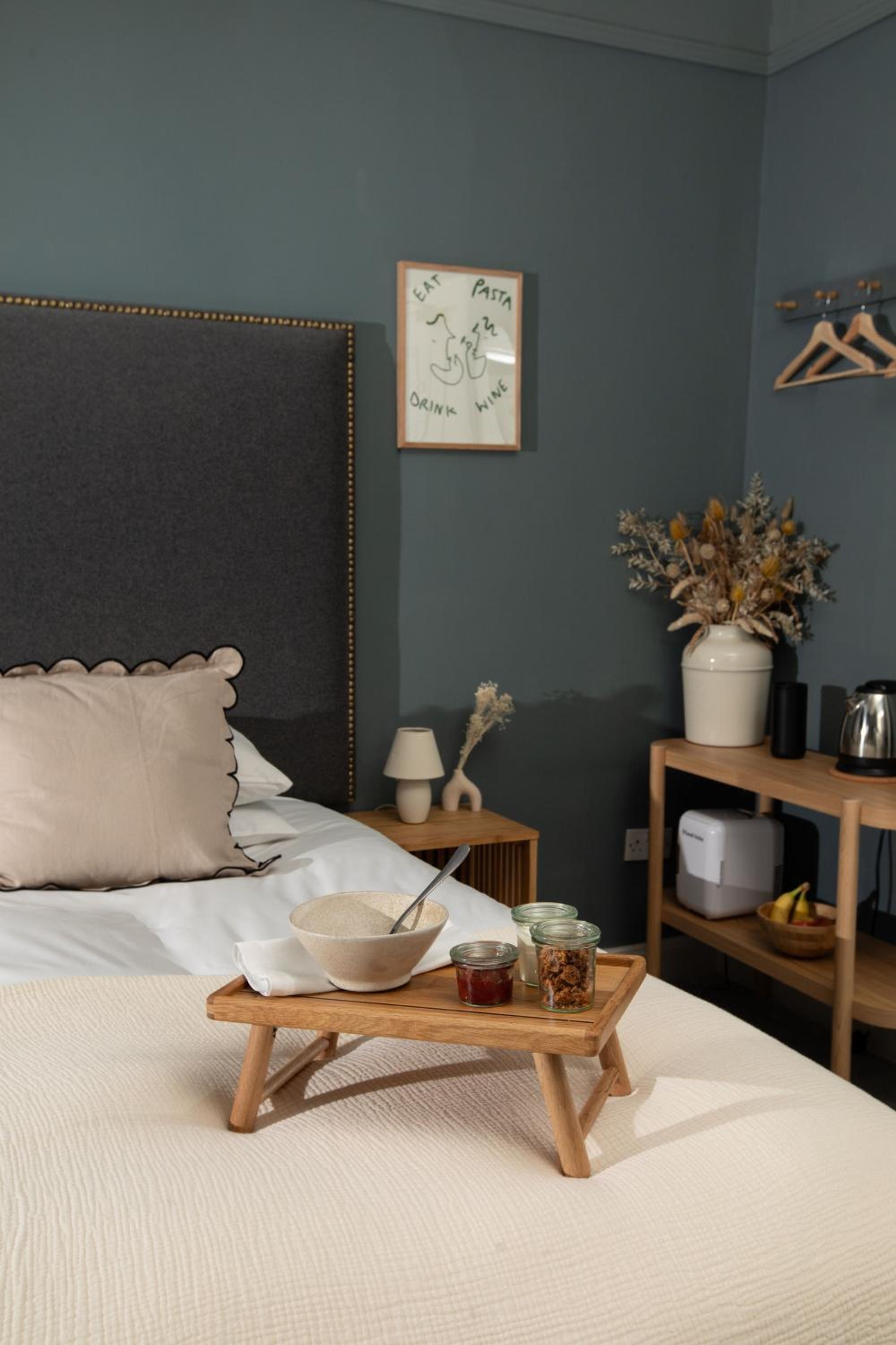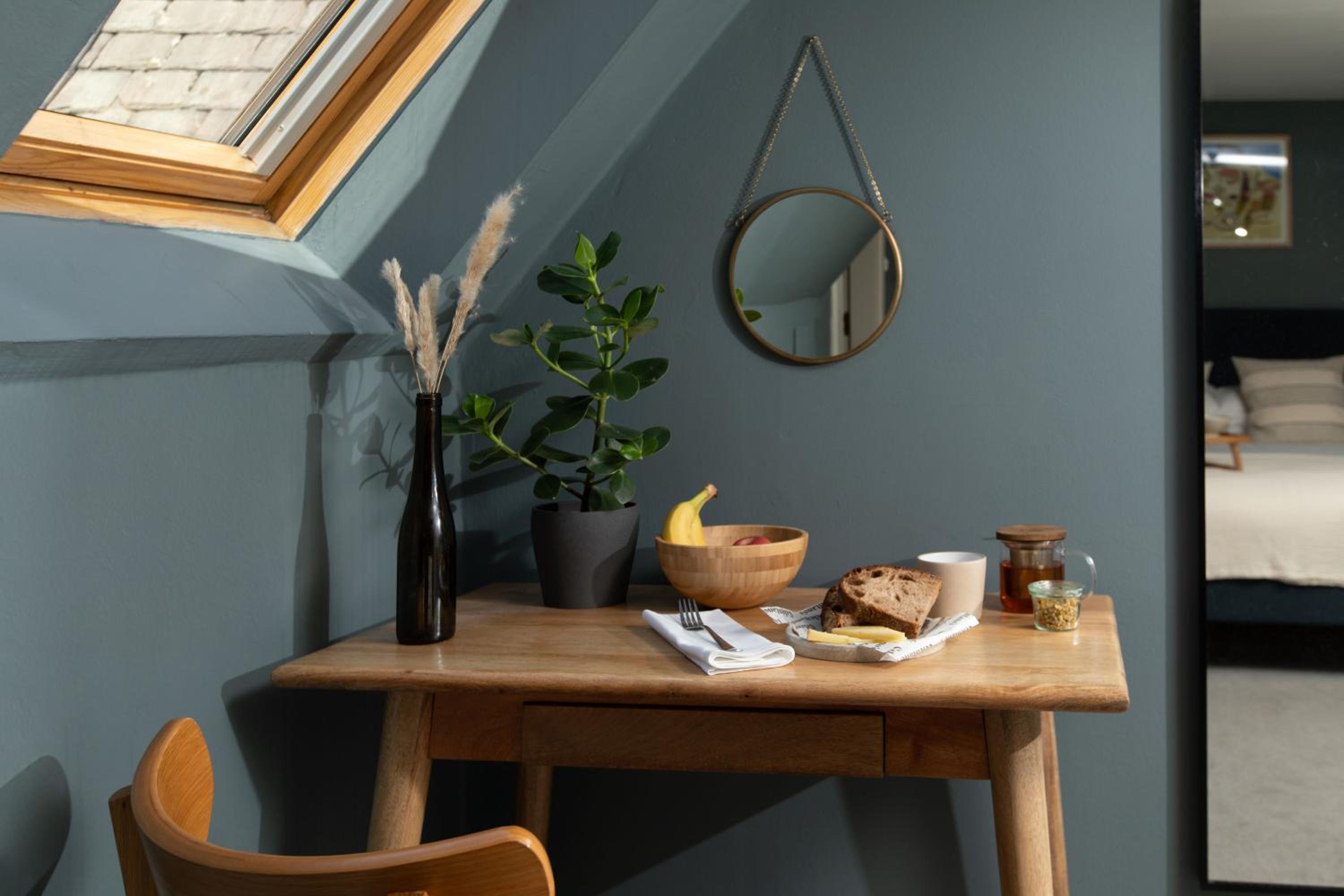 The fridge was tiny and the snacks consisted of a sliver of cheese, cream and a tiny bottle of milk. We brought a pint of milk but it was too big for the fridge. The teabags offered were not clearly labeled so unsure what flavour eg green etc. The breakfast was inadequate for 2 people and only sourdough bread with no spread and a tiny jar with some kind of unknown cereal. Only 1 pasty when its a breakfast for 2. The breakfast was totally inadequate. The stairs to the room were very steep and no lift so think it should be stated not suitable for those with even a slight disability.