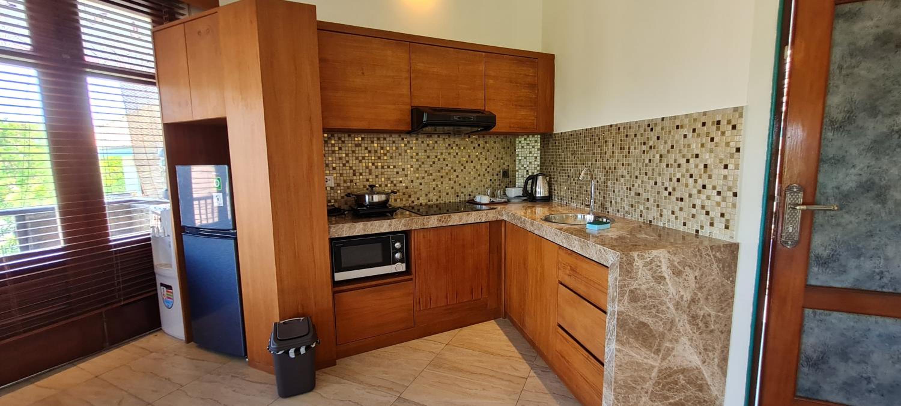 Huge rooms, so plenty of space in the 2 bedroom villa. Quiet and no traffic noise. Short walk (3mins) to the end/start of the Sanur Beach path and an easy walk along to many food options. Cheap taxi ride from centre of town if you do not want to walk it. Lovely pool. Breakfast was standard and good.