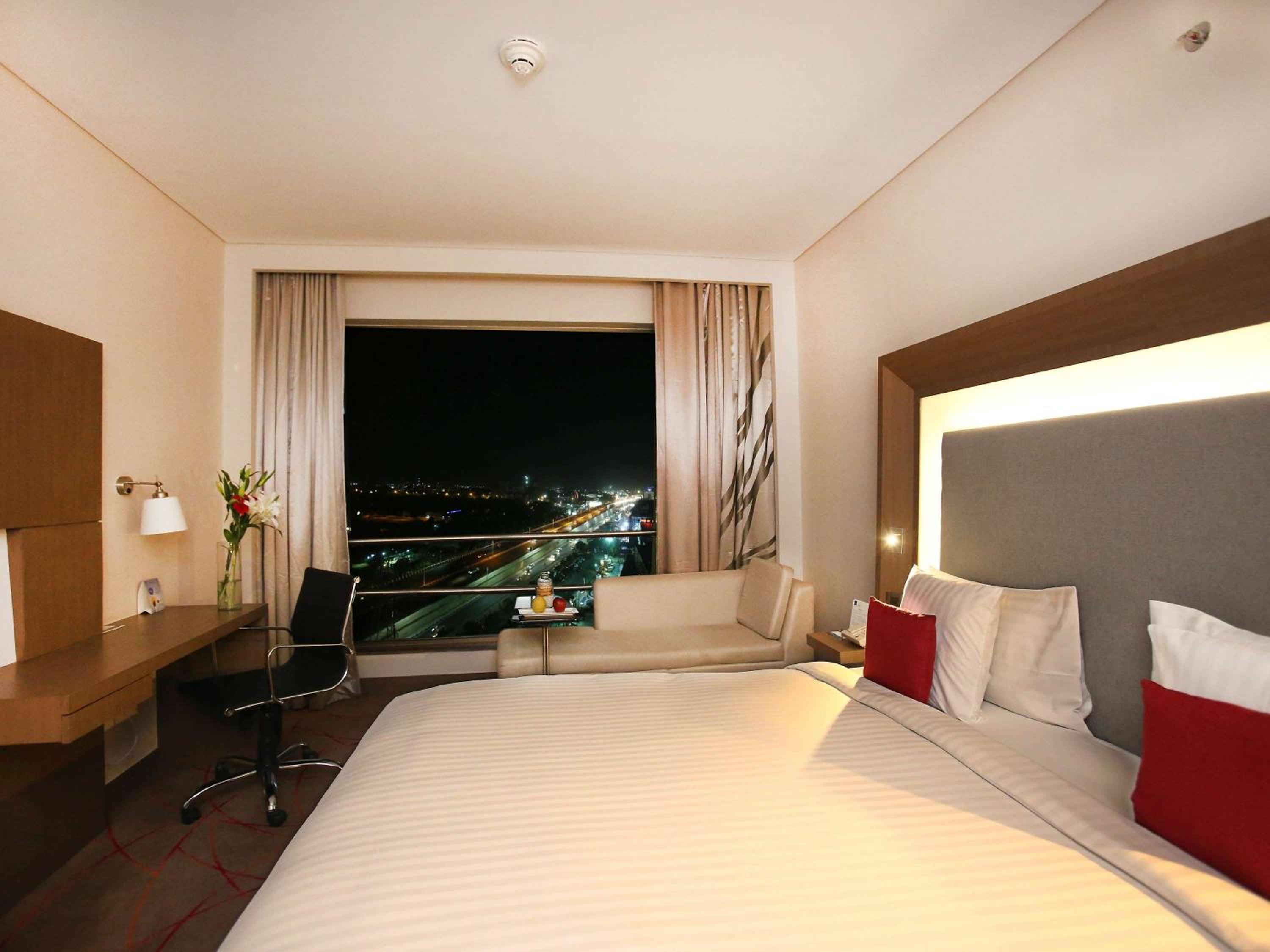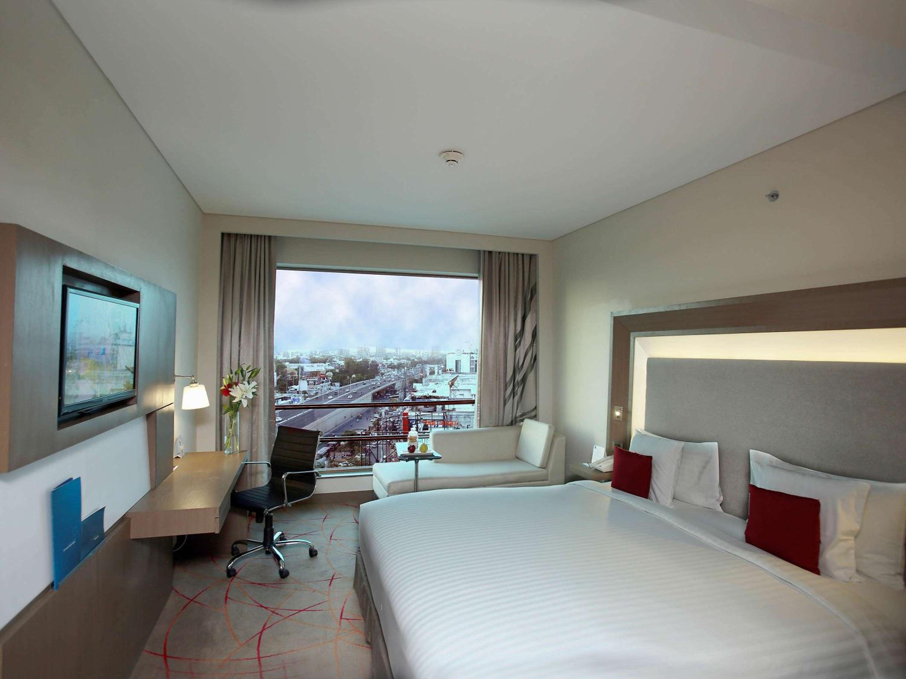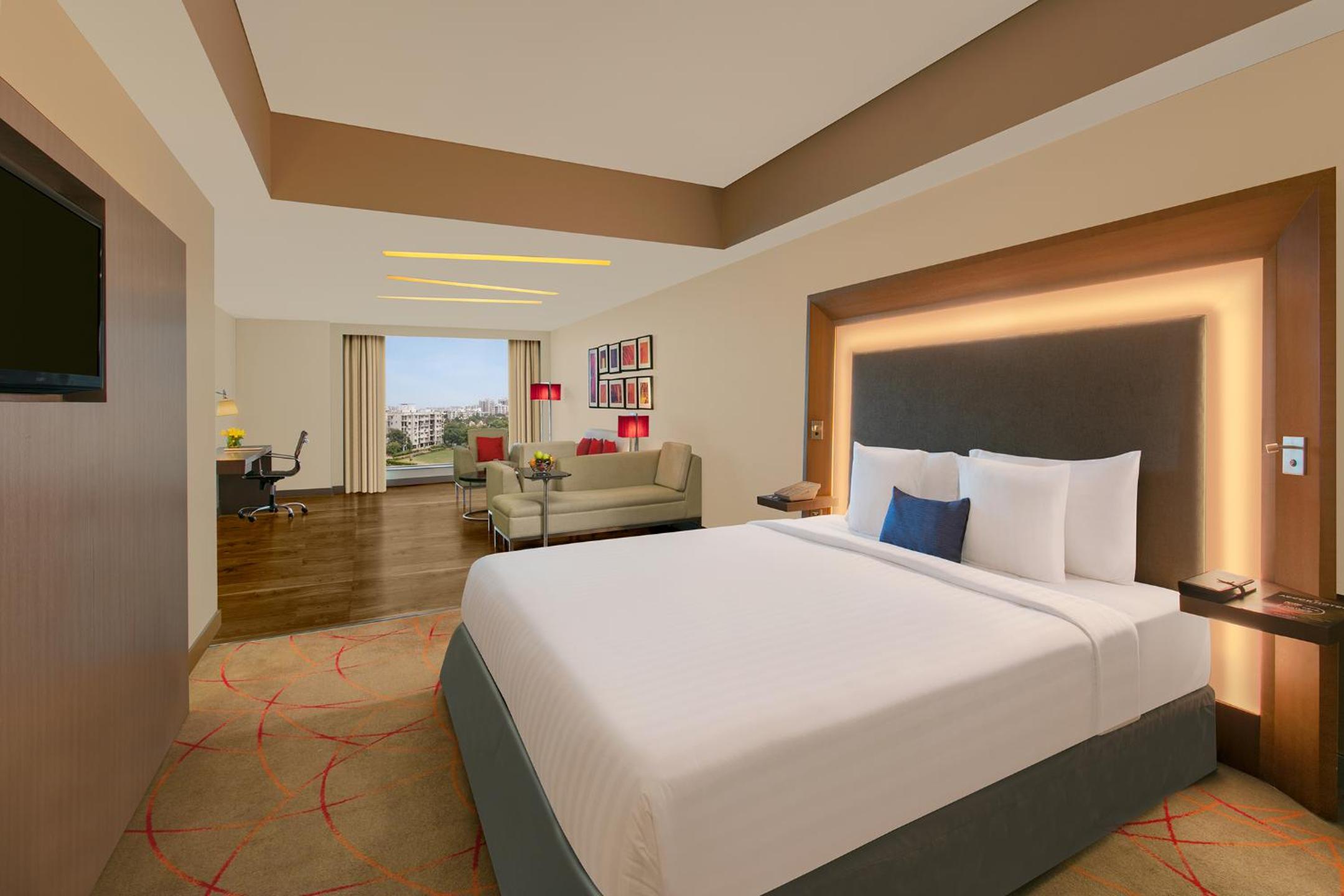 Novotel Ahmedabad offers contemporary 5-star accommodation in the heart of the city. The spacious rooms and suites with floor-to-ceiling windows provide a luxurious stay experience. Each room is equipped with a range of modern amenities including a flat-screen TV, electric kettle, and a work desk.