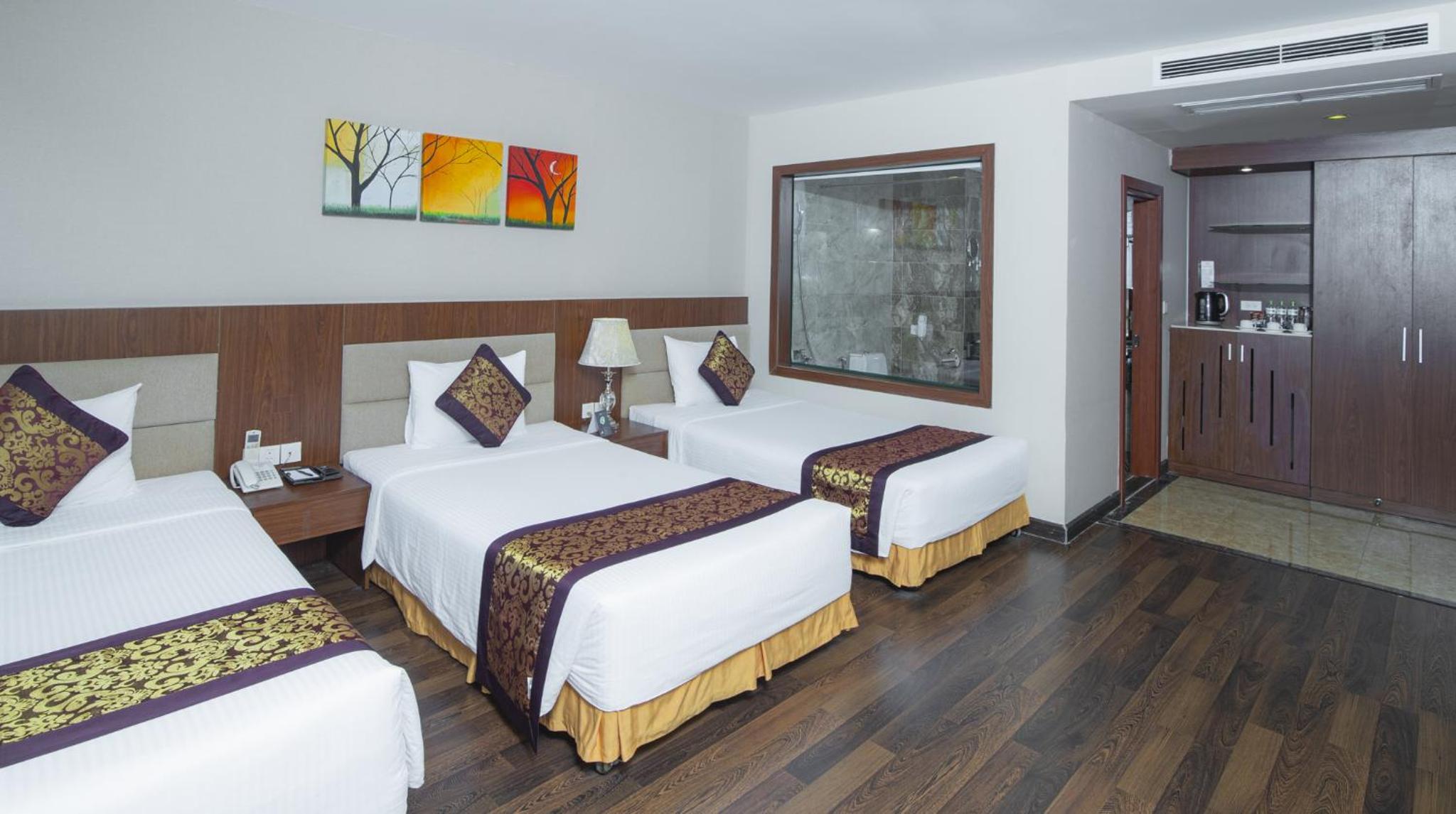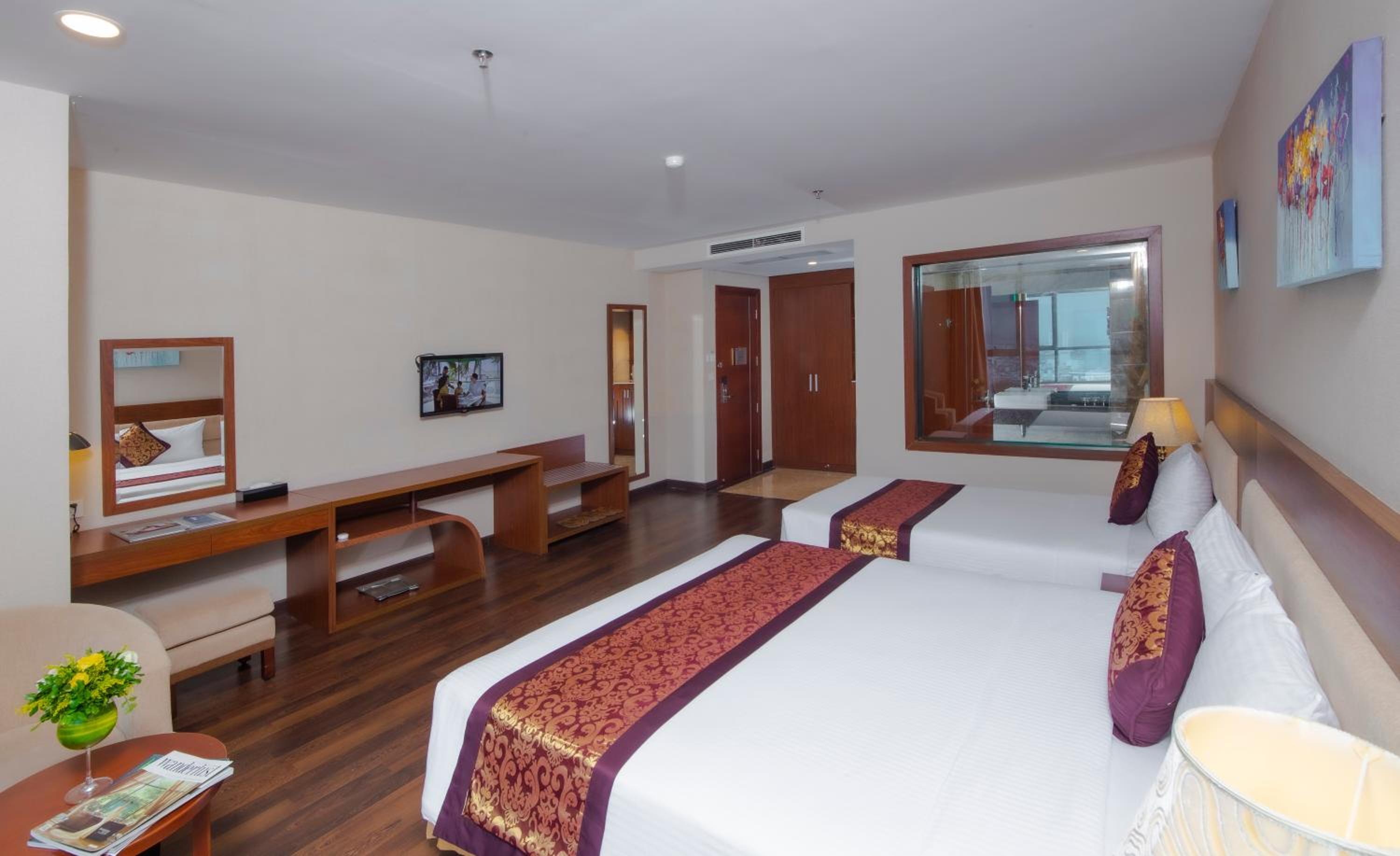 Muong Thanh Hotel Da Nang offers elegant 4-star accommodation with beautifully decorated rooms equipped with modern amenities like LCD TVs and spa bathtubs. Enjoy a comfortable stay with free bottled water provided in each room.