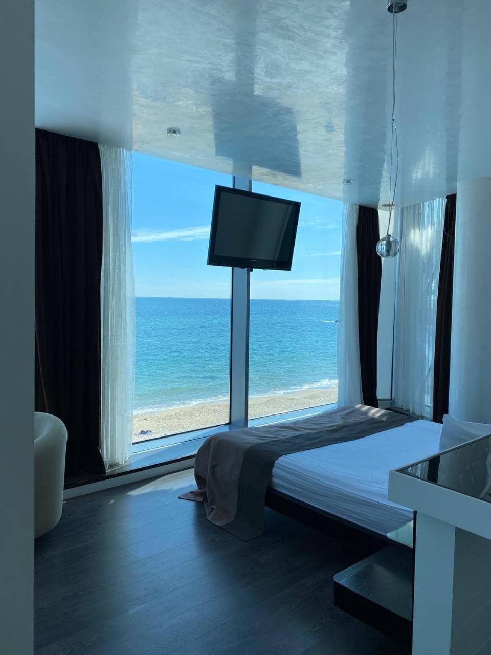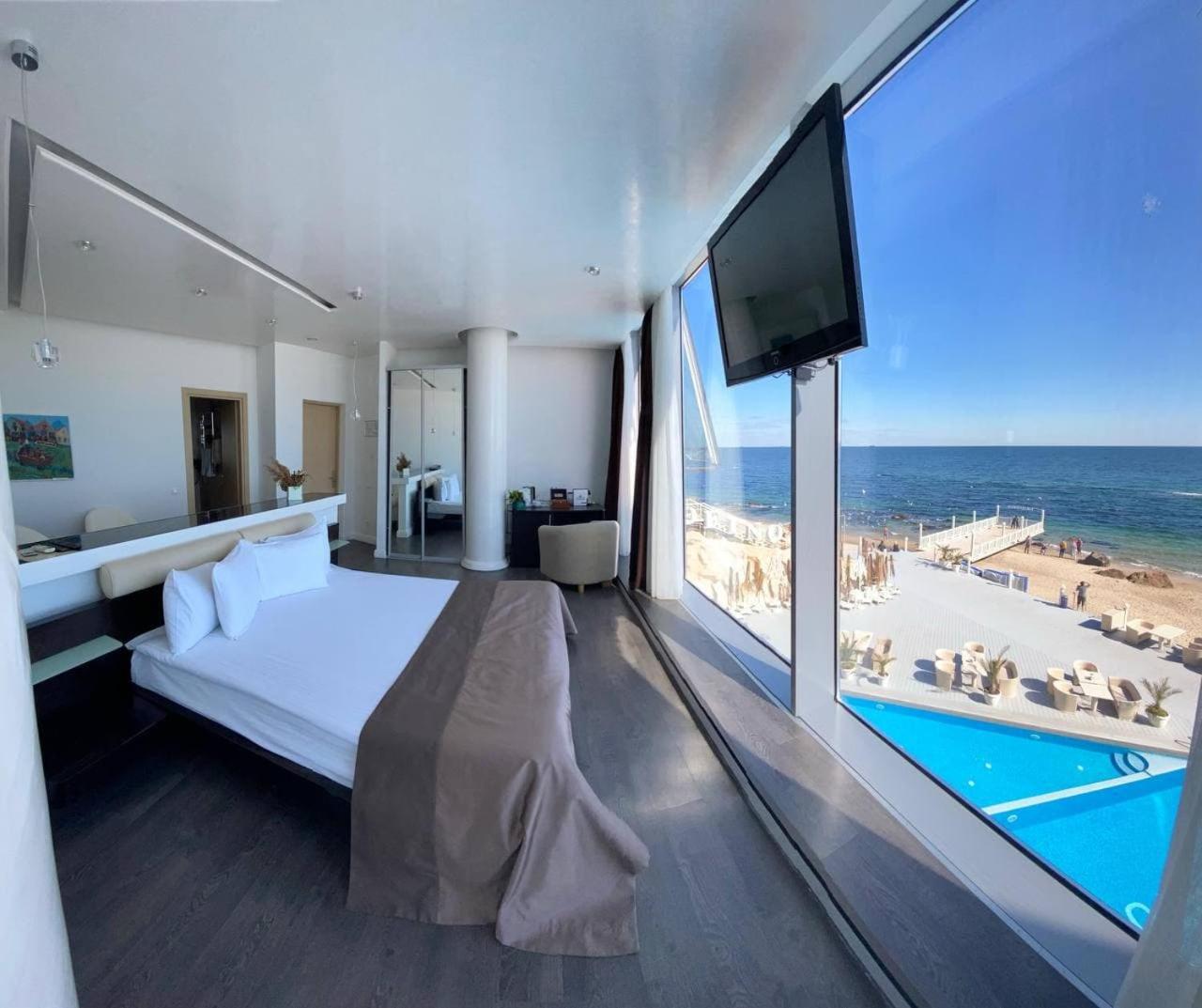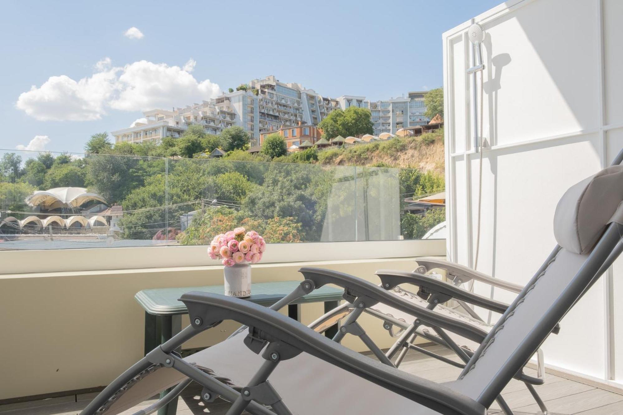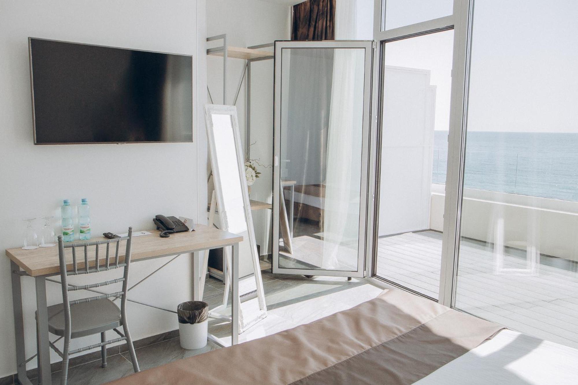 Вид з вікна, можливість забронювати собі шезлонг, рушники для пляжу безкоштовно, смачні сніданки, зручний матрас, гарне ставлення до собаки